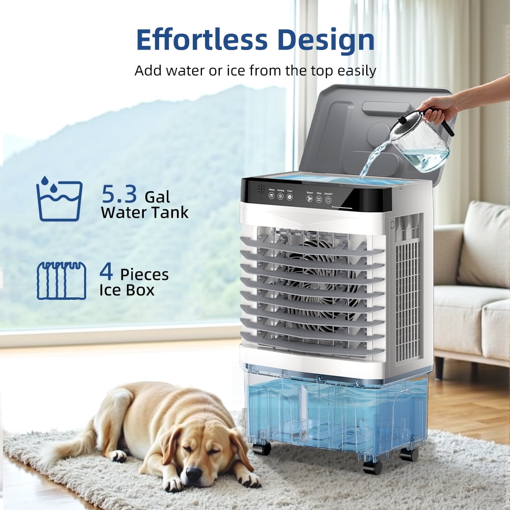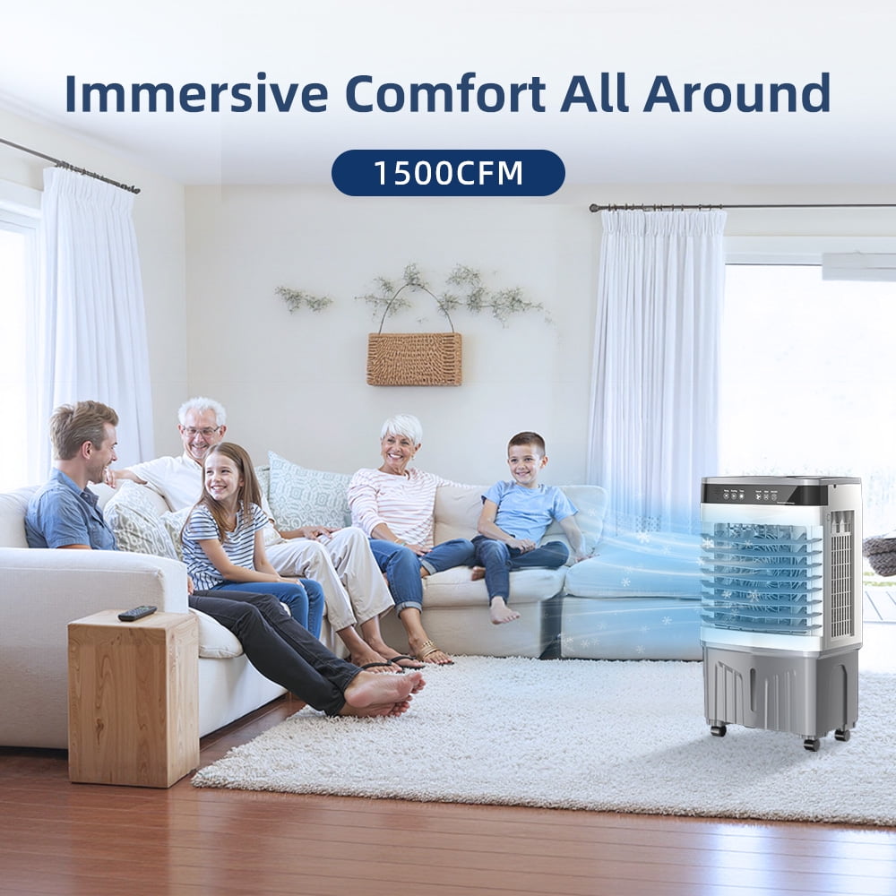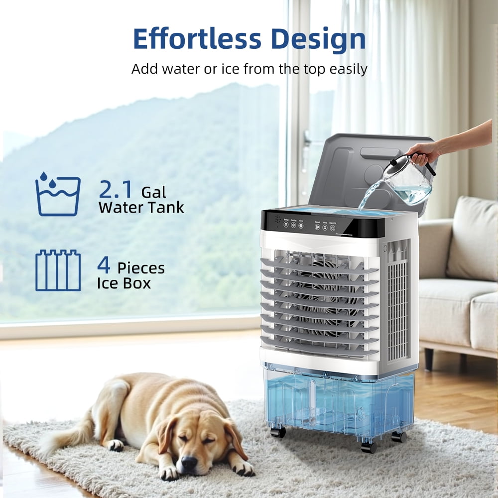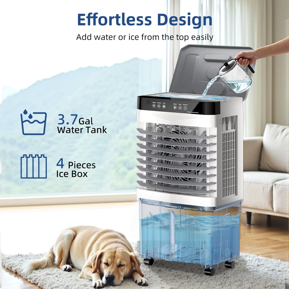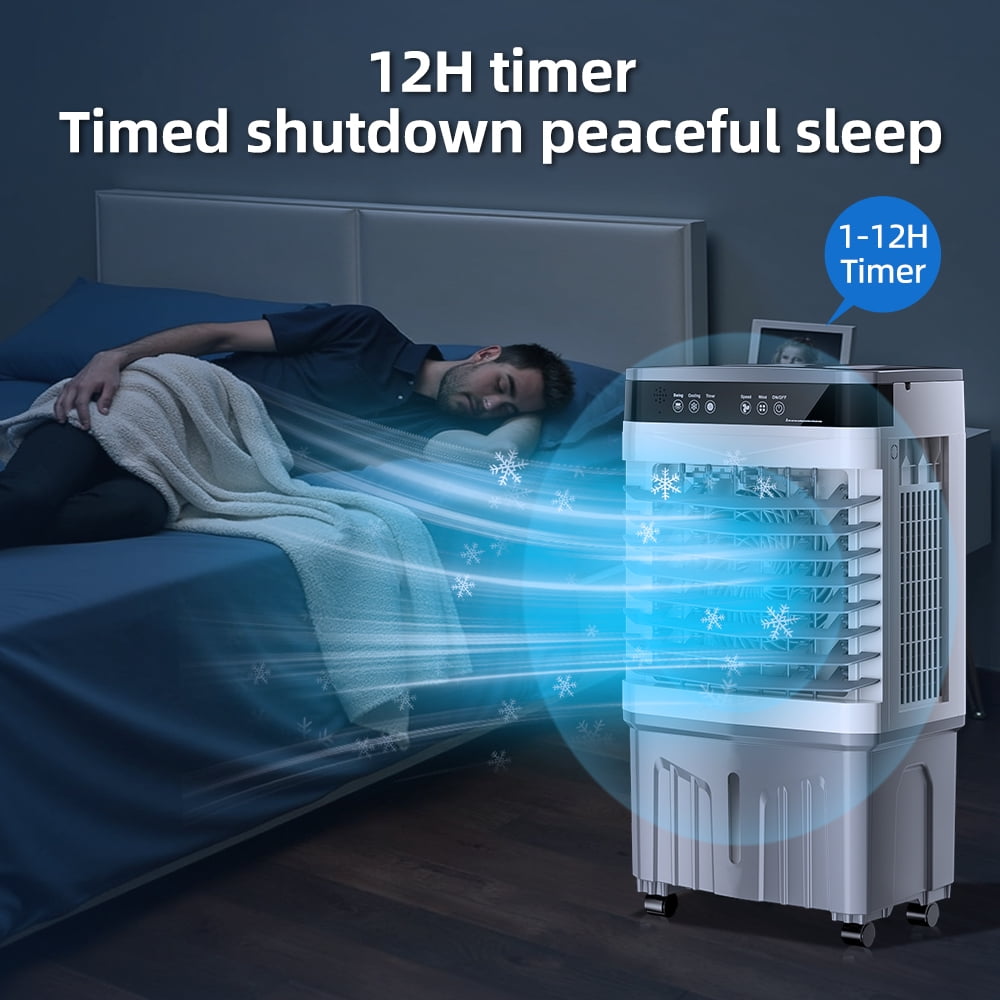 Easy to operate:This evaporative air cooler features an intuitive touch control panel with LED backlight for nighttime visibility, along with a convenient wireless remote that works within 10 meters. The remote lets you effortlessly adjust fan speed, cooling modes, and timer settings from your couch or bed, while the illuminated touch display ensures easy operation day or night.