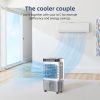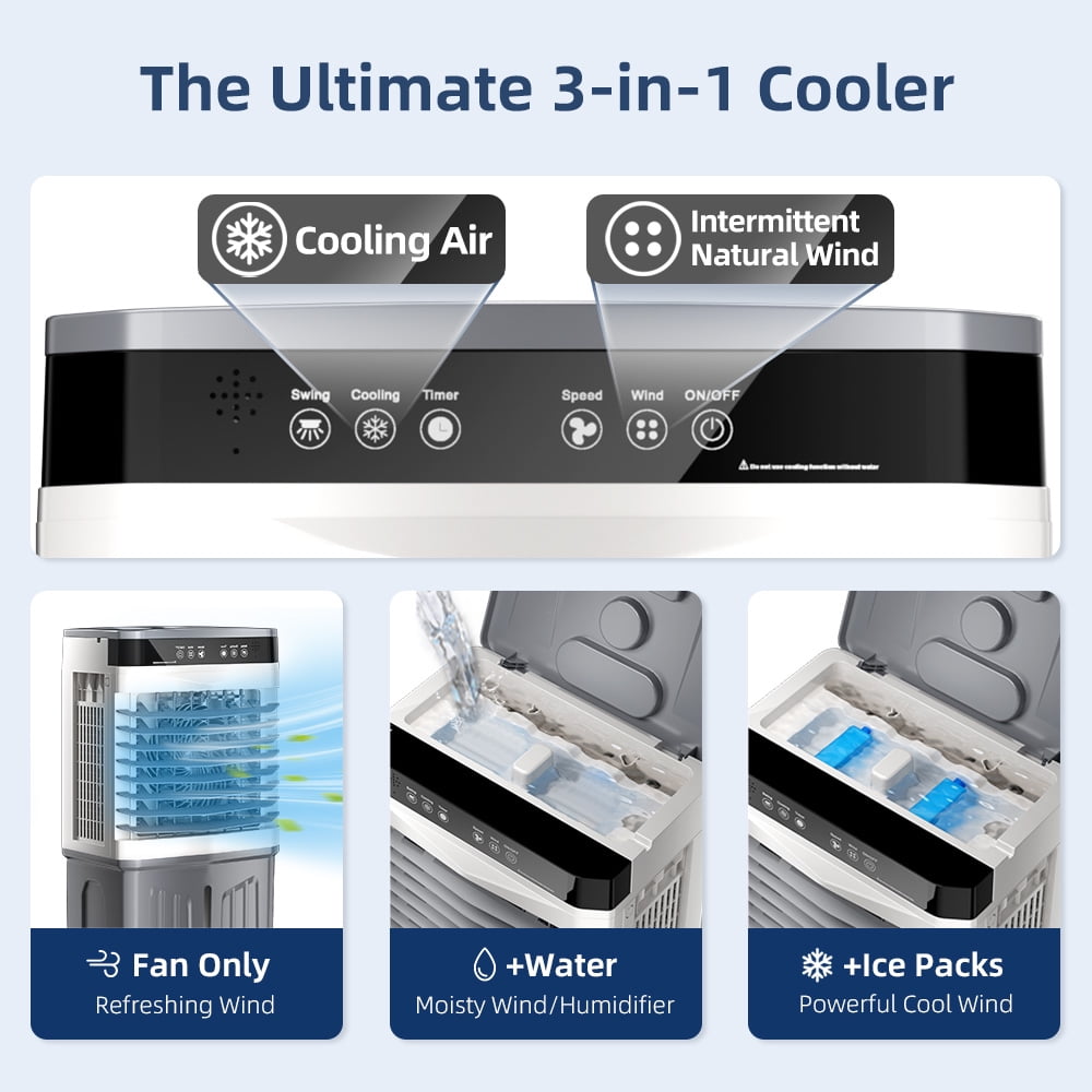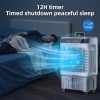 • ‌3-IN-1: Choose from 3 fan speeds (low, medium, high) and 2 operating modes (Cooling, Natural) to customize your cooling experience. The 12-hour auto-off timer adds convenience and safety. Operating quietly at just 45 dB, this portable air cooler provides a peaceful, cool night’s sleep.Add water and icebox and wait only 10-15 minutes. Ready to enjoy cold air.
