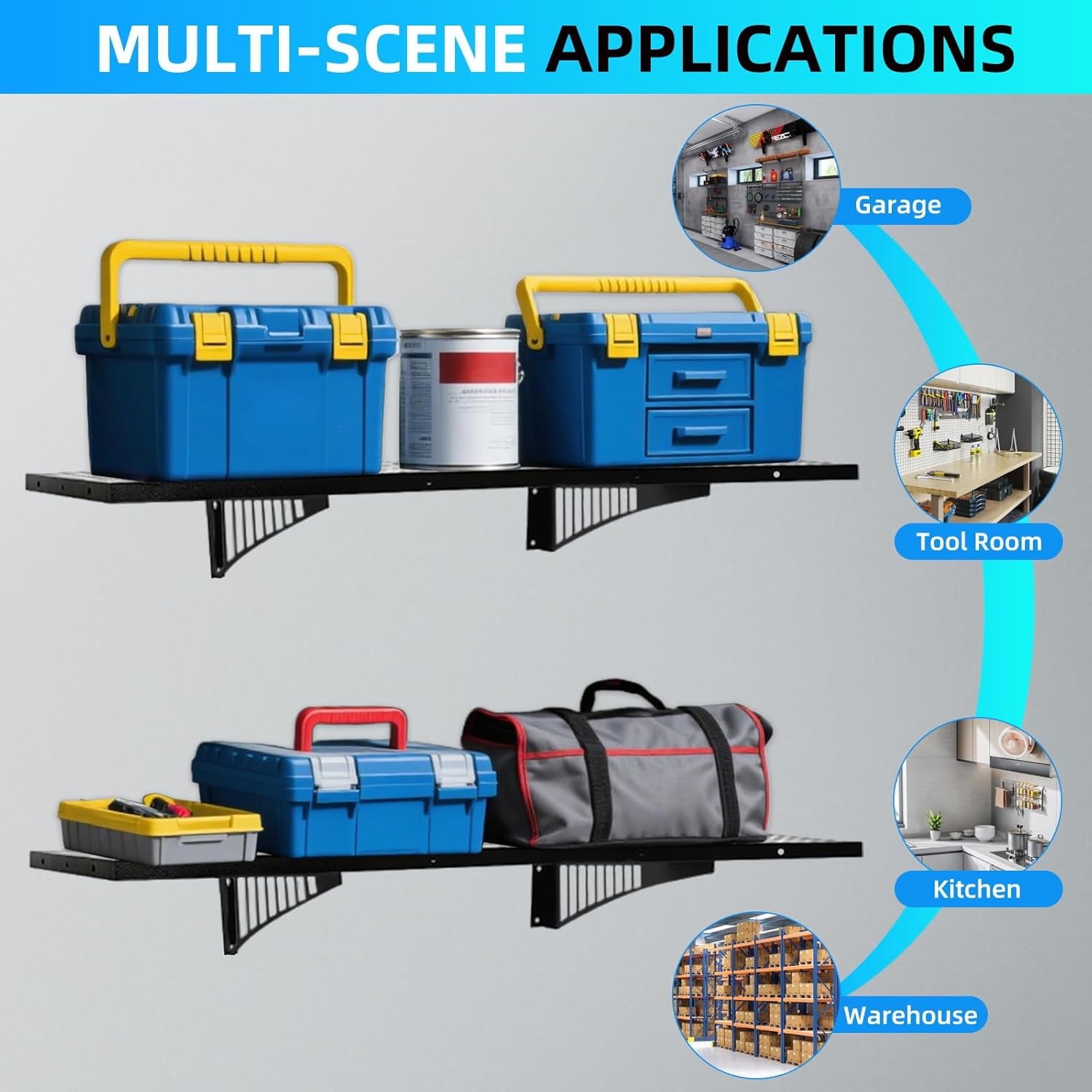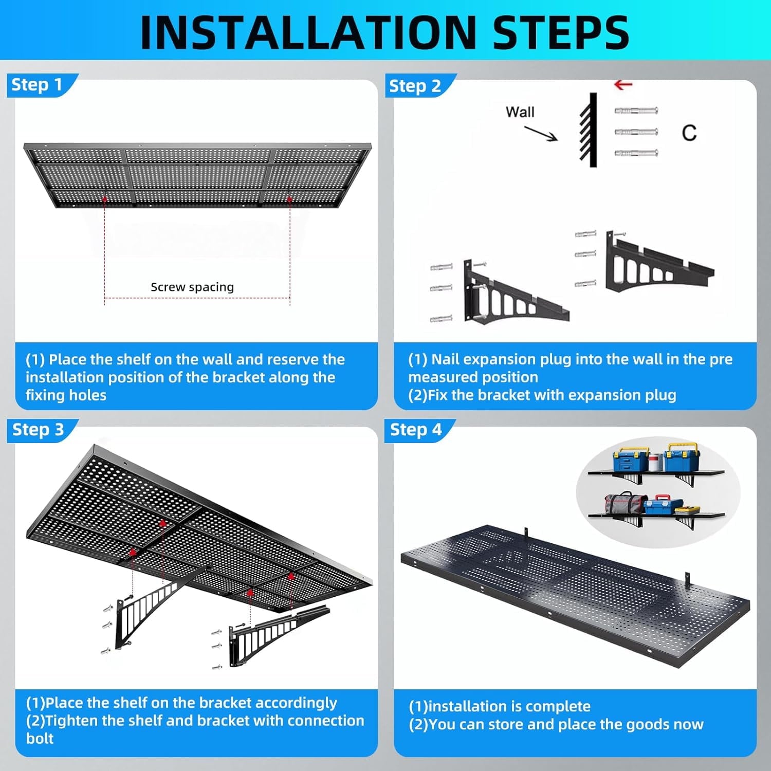 - 【HIGH QUALITY SPECIFICATIONS】 DIMENSIONS: L/20″*W/48″*H/7″; Bracket can be mounted on wood wall keel spacing range: 45″. The garage wall shelf total safe load capacity reaches at least 520lbs, with each individual panel supporting to 260lbs with no bending or warping