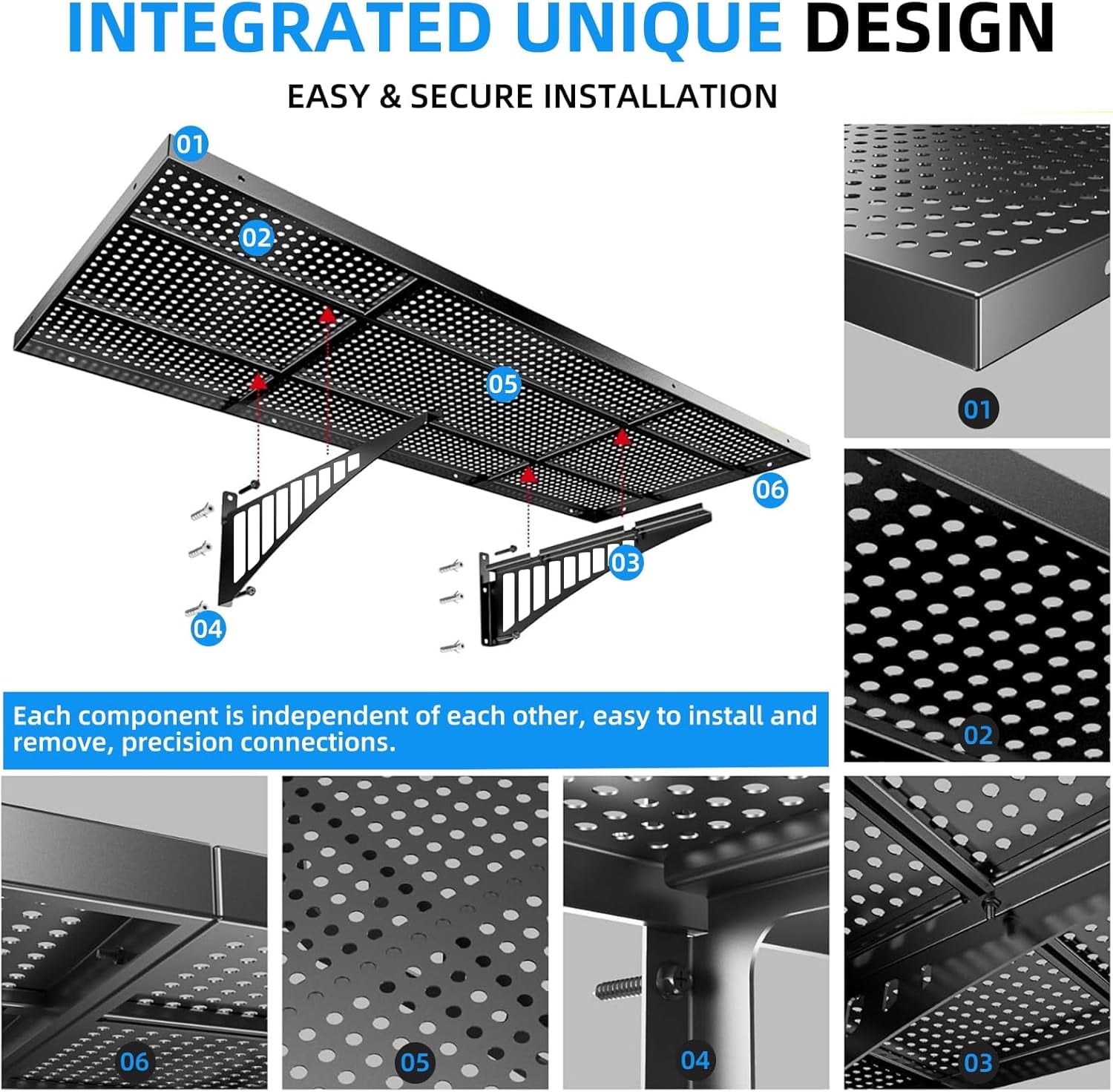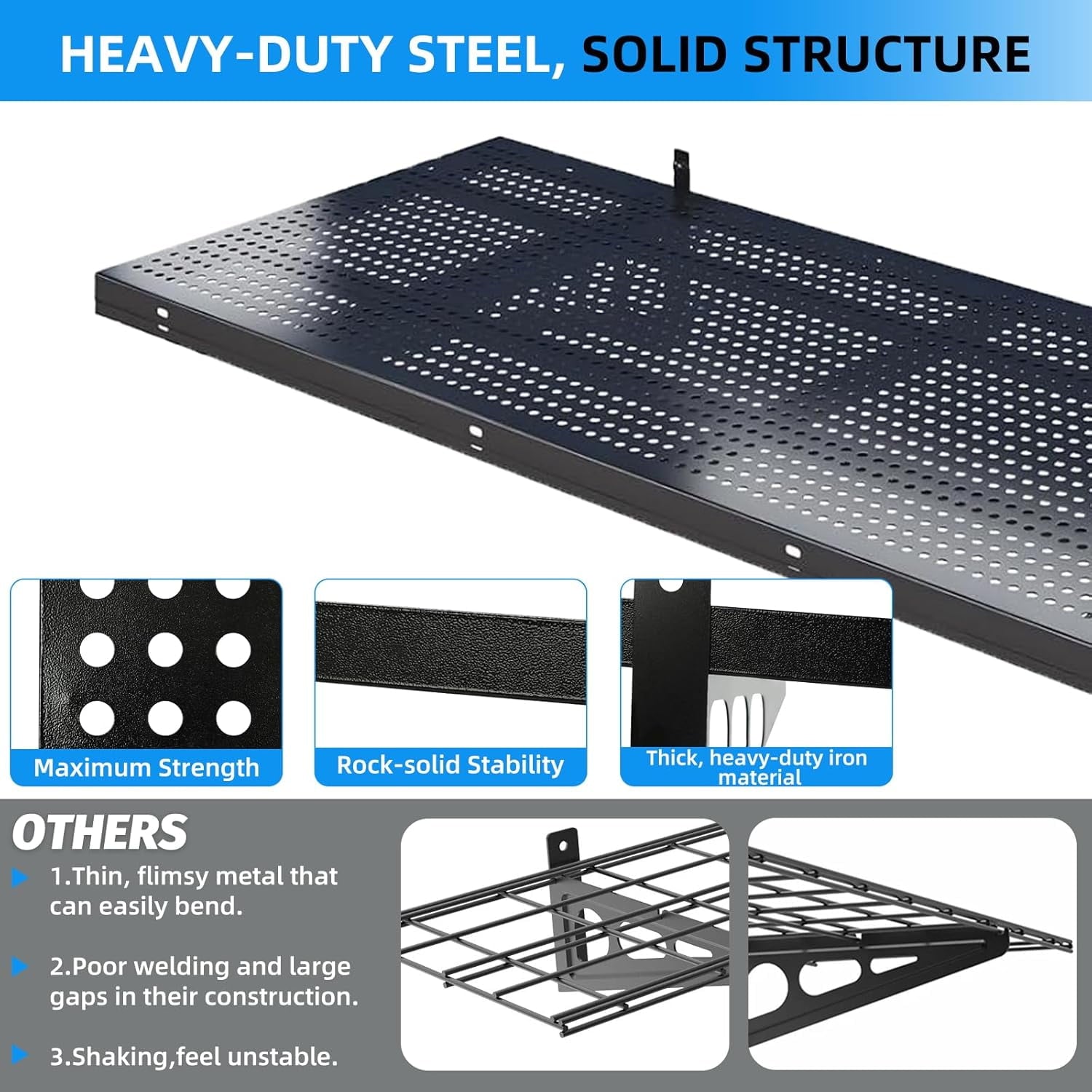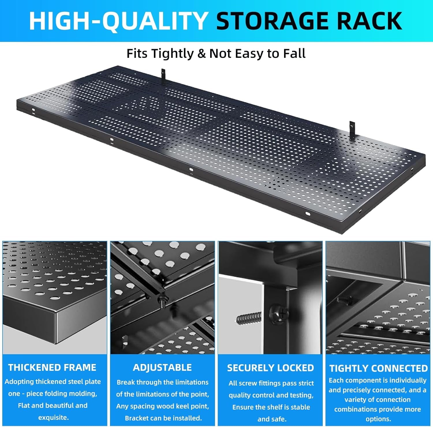 - 【SUPERIOR DESIGN】 Wall shelf garage storage rack panel is made of whole piece of perforated steel plate bending and welding, the surface of matte high temperature powder baking paint, flat and smooth; the panel adopts slide rail design, can be adjusted by parallel left and right sliding at will; bracket can be freely installed in 45” range of the spacing of the wood wall keel, without affecting the precision connection with the panel