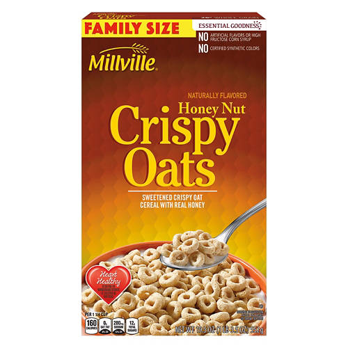 Start your day the right way with these Millville Family Size Honey Nut Crispy Oats! The heart healthy cereal is made with sweet honey and crispy oats and is free of artificial colors, flavors, and high fructose corn syrup. Finish of your bowl with a splash of your favorite milk and fresh berries for a delicious and nutritious breakfast!