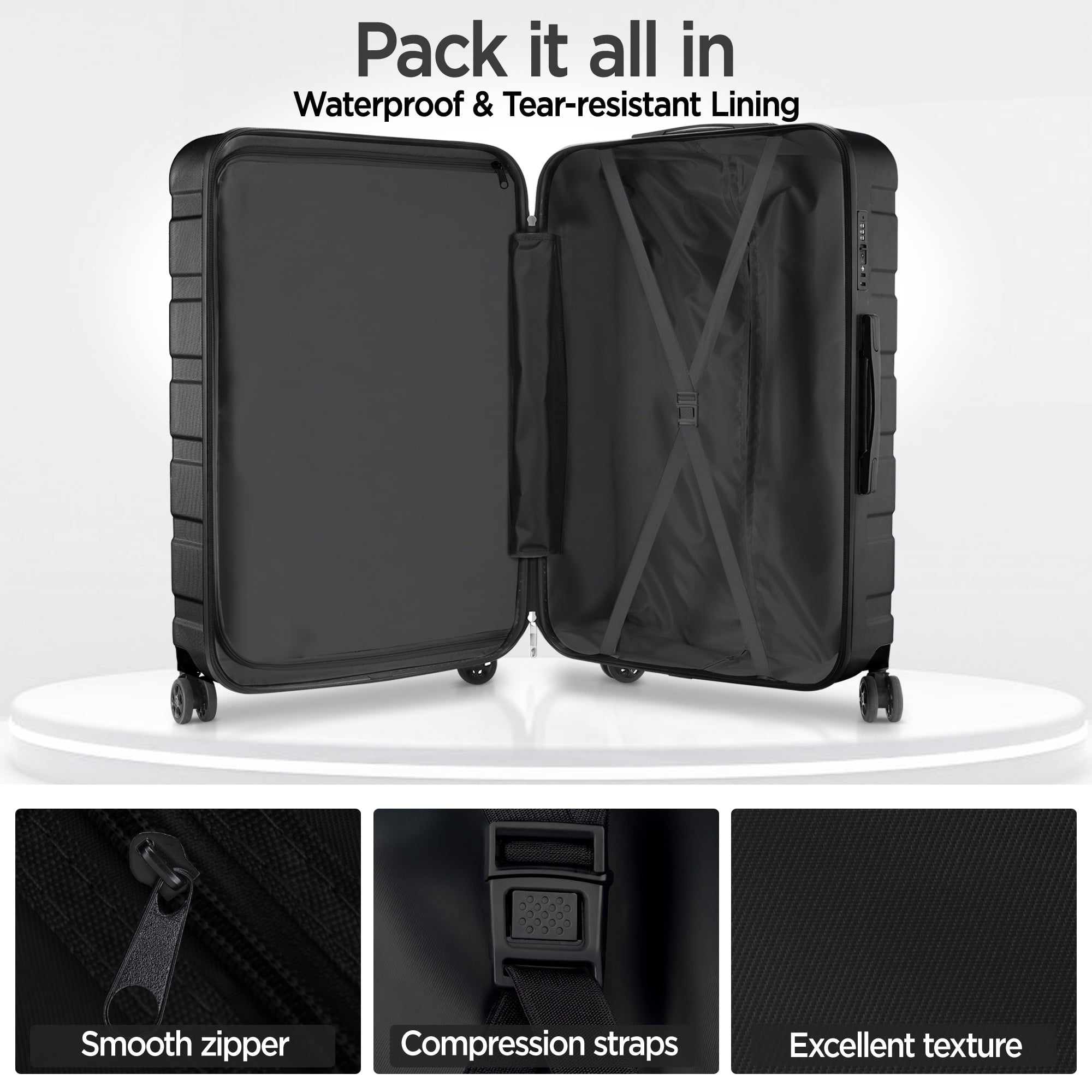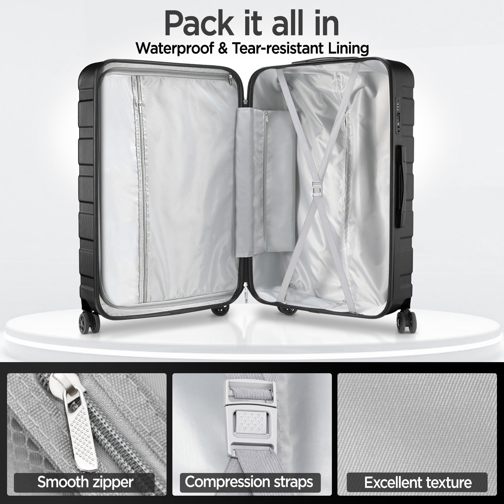 - Humanized design: Double layer zipper should not be damaged, side elastic handle, TSA lock for privacy protection, 360°silent universal wheel, multi-layer lining for easy storage,Luggage compartment can be embedded with a set to save space.