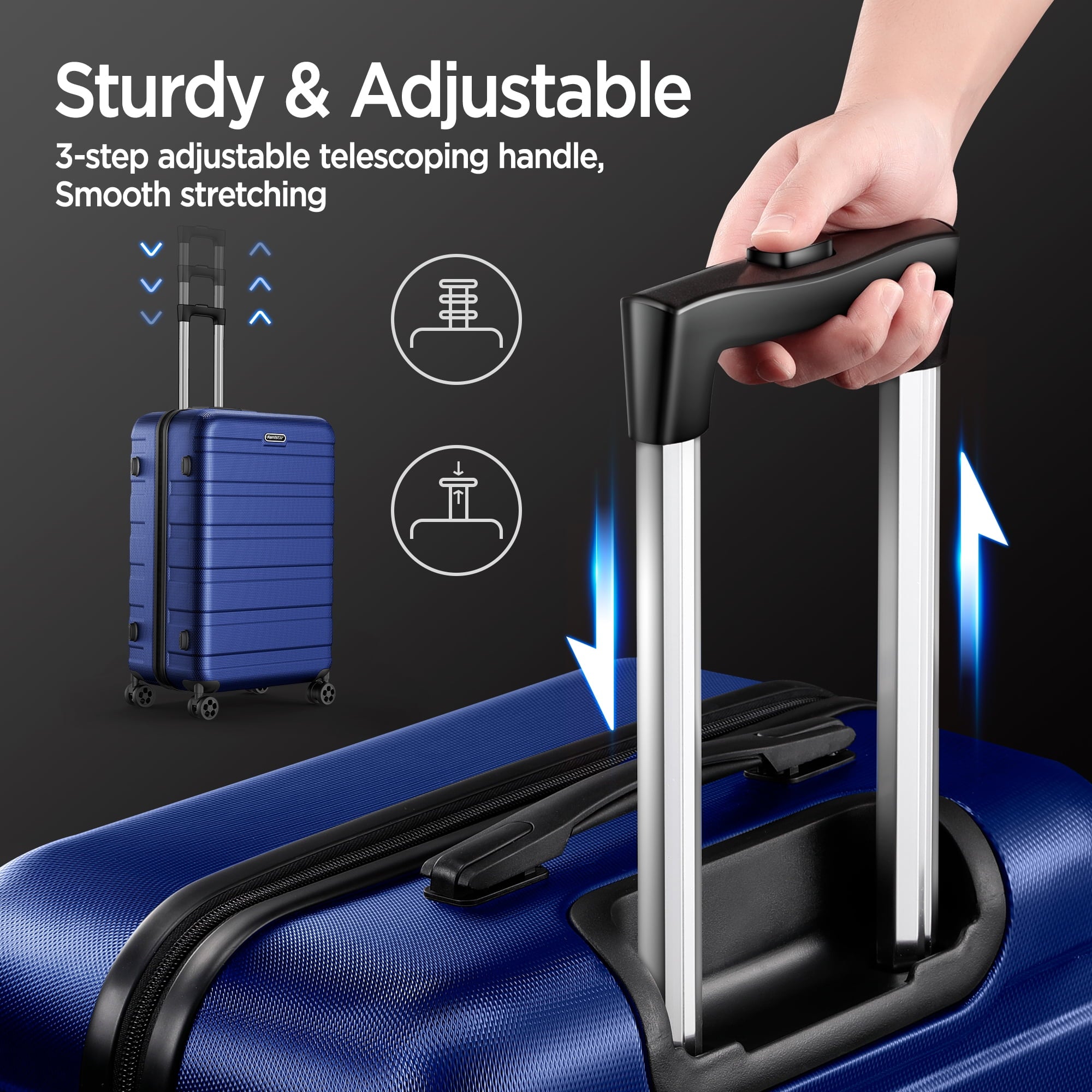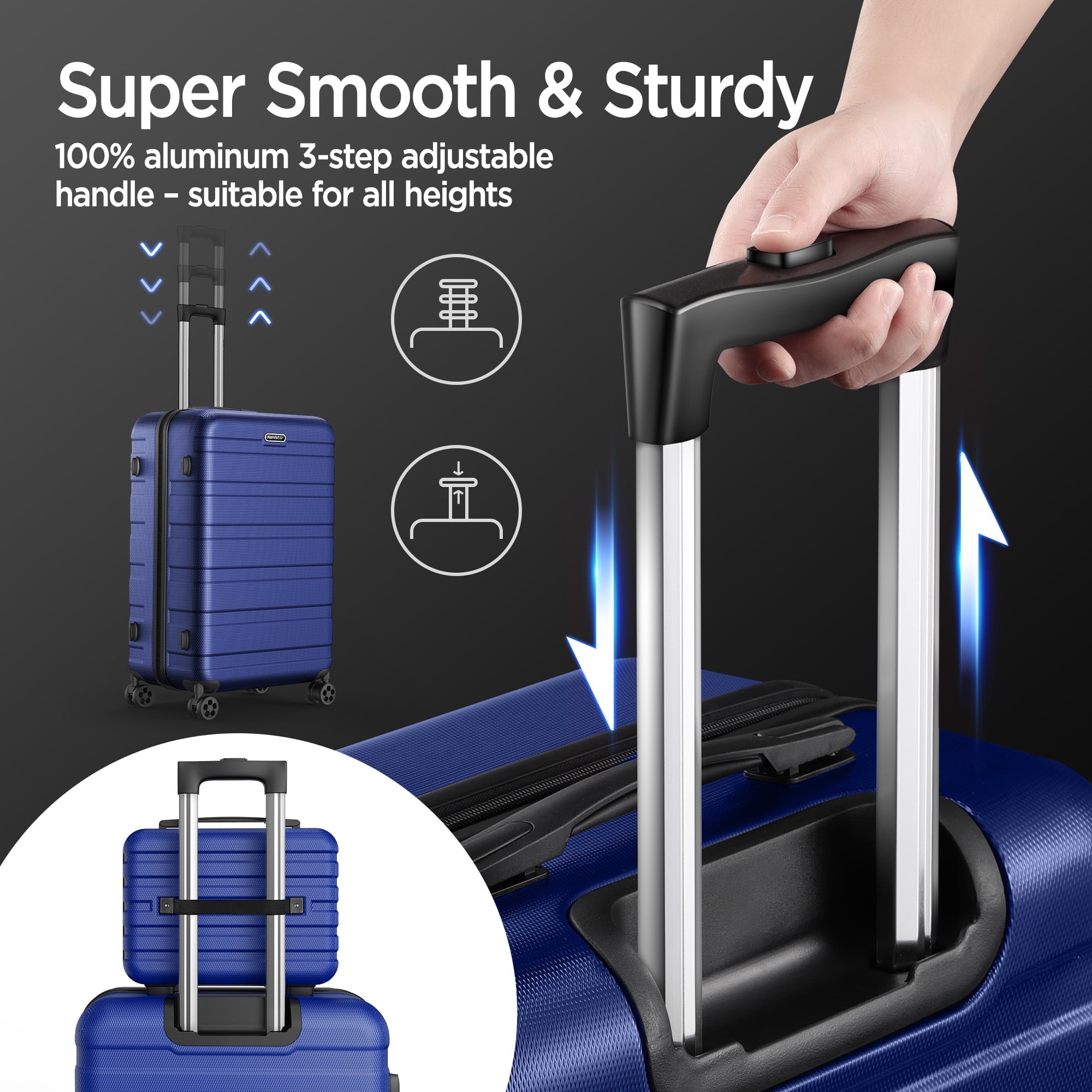 【Three-Gear Aluminum Telescoping Handle】The suitcase has a sturdy ergonomic metal three-step telescoping handle. Side handles are easy to lift. The push-button locking handle is adjustable in multiple heights for comfort during your daily travels.