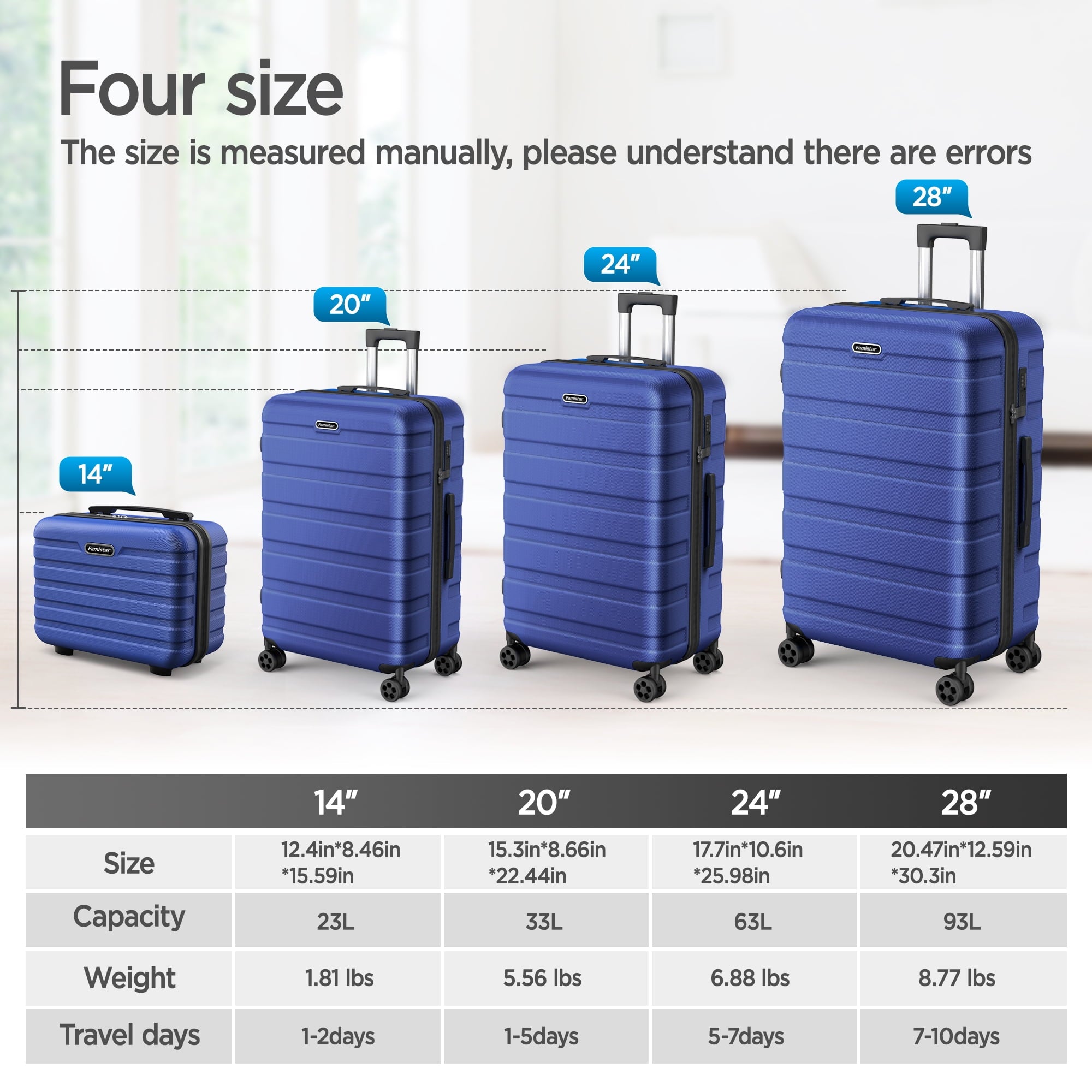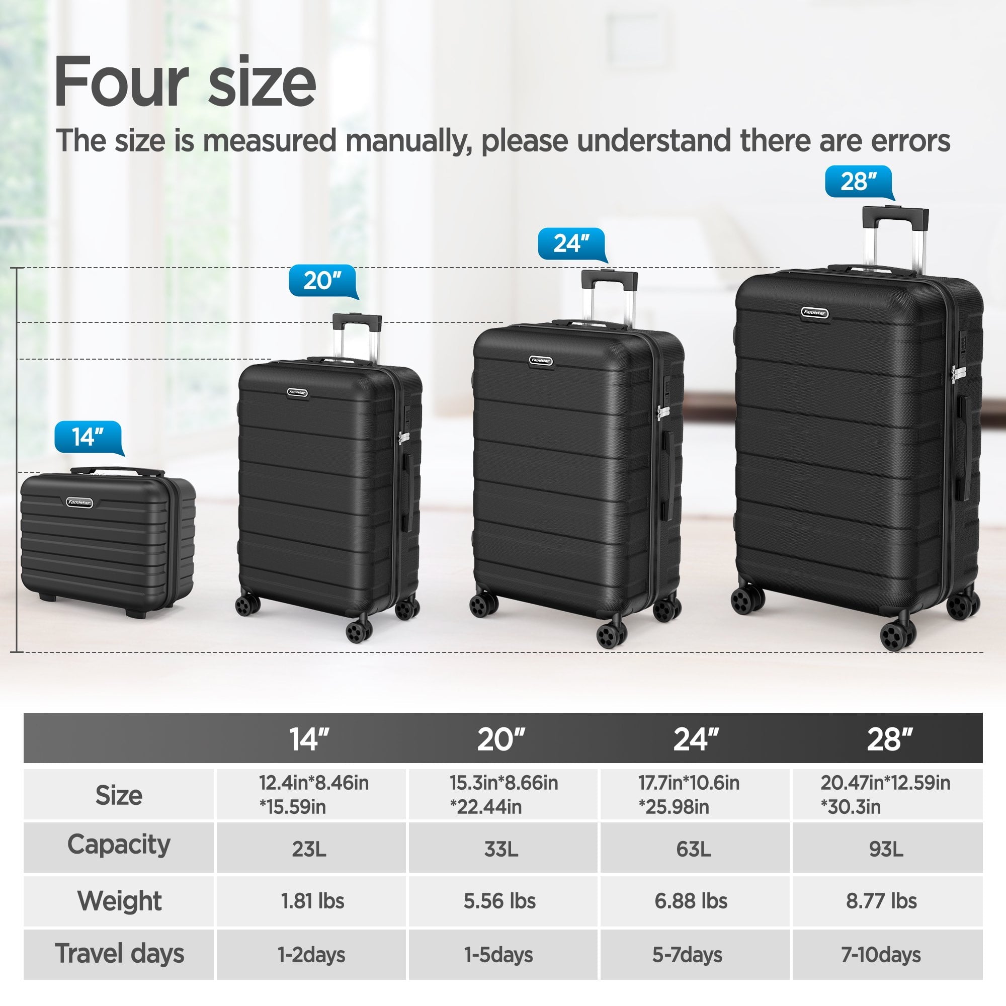 - Value for money: The 14 ” suitcase(carry on luggage) can be paired with three other types of luggage (20″/24 “/28”) for convenient and labor-saving use.
