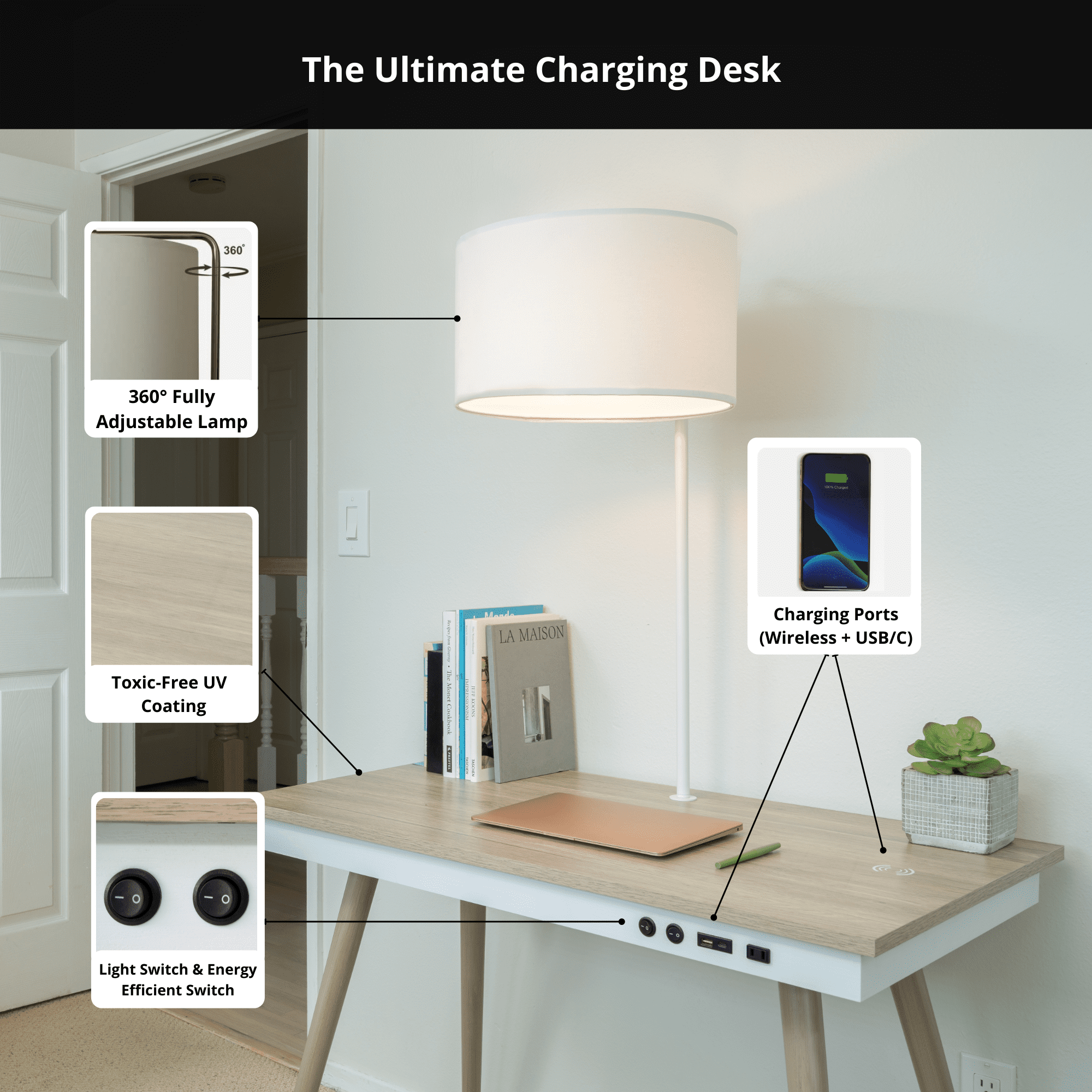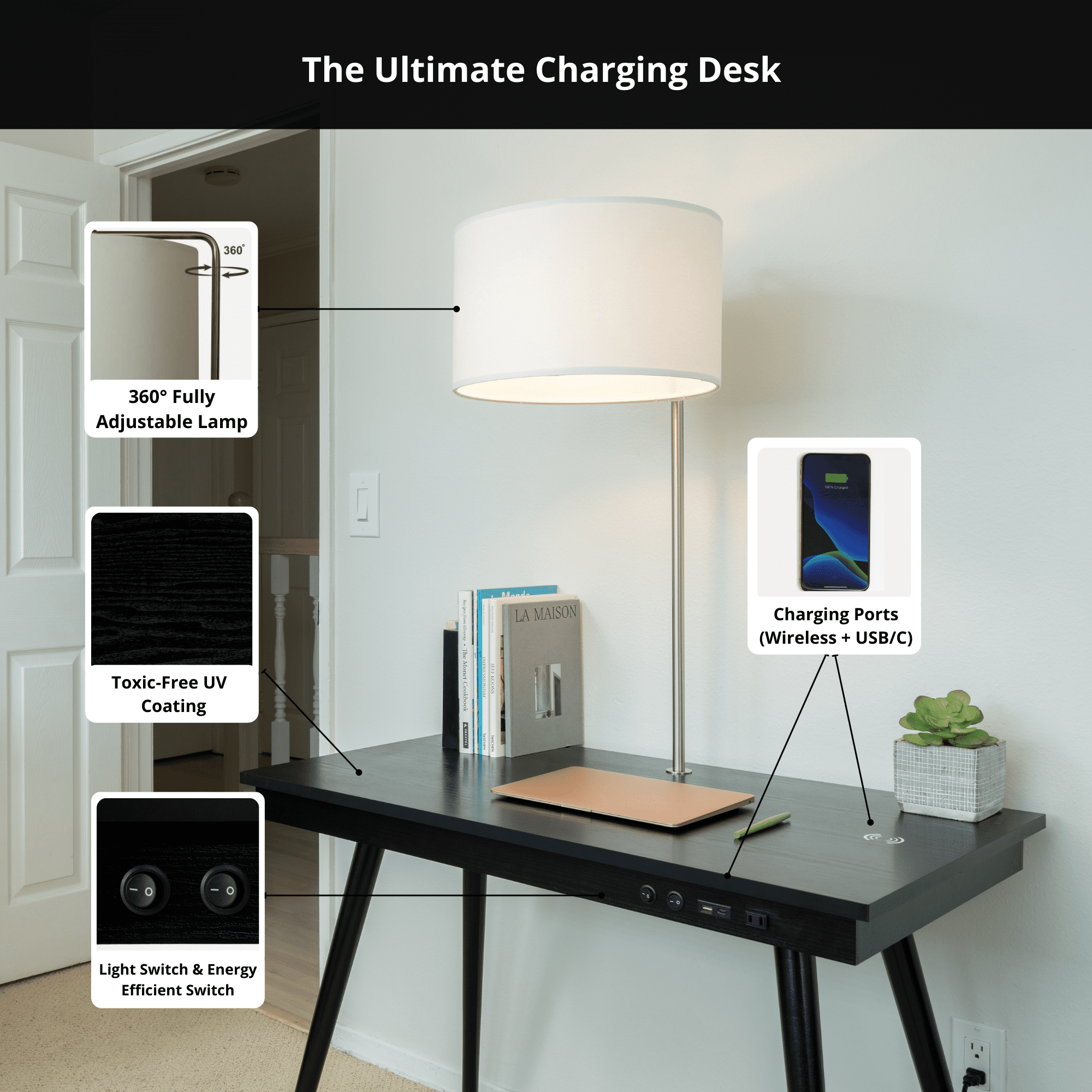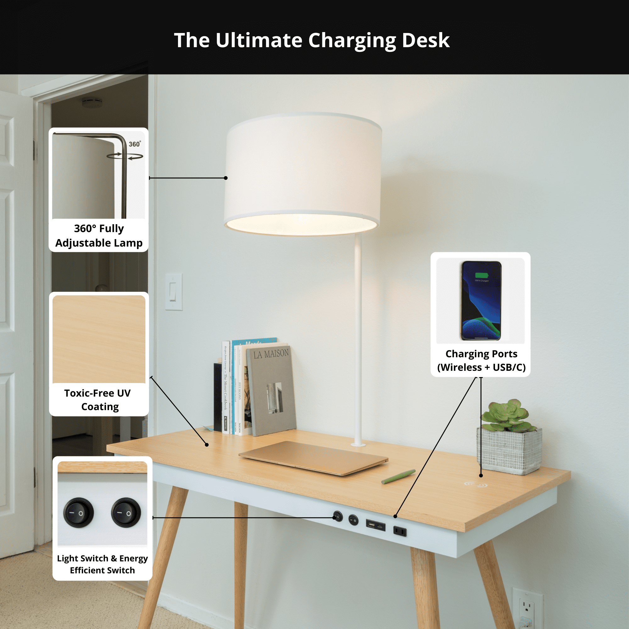 - [Compacted All In One] – This mid-century modern desk has a detachable 360° adjustable overhead lamp and the convenient tech accessibility you’d want (a power outlet, as well as USB and USB-C charging ports) packed into a single piece of furniture