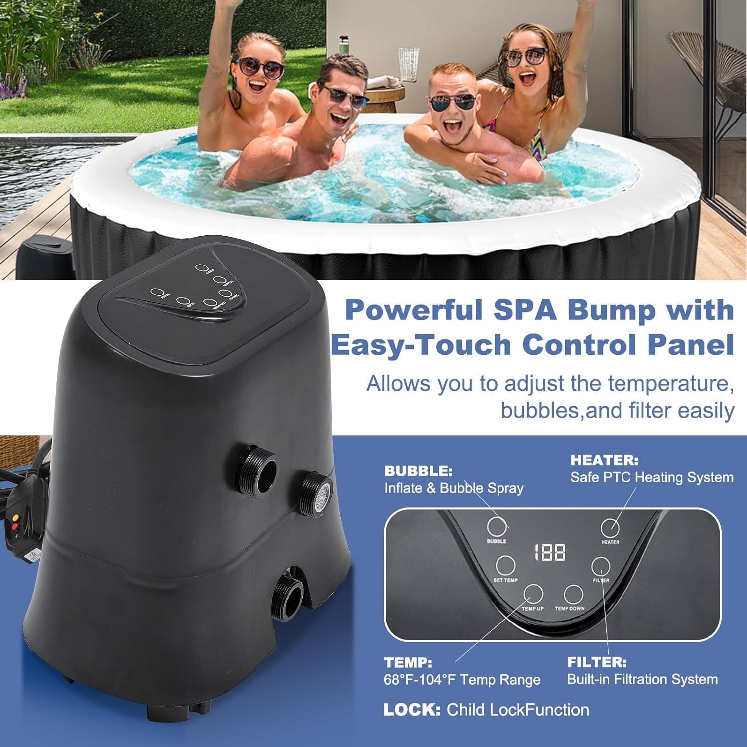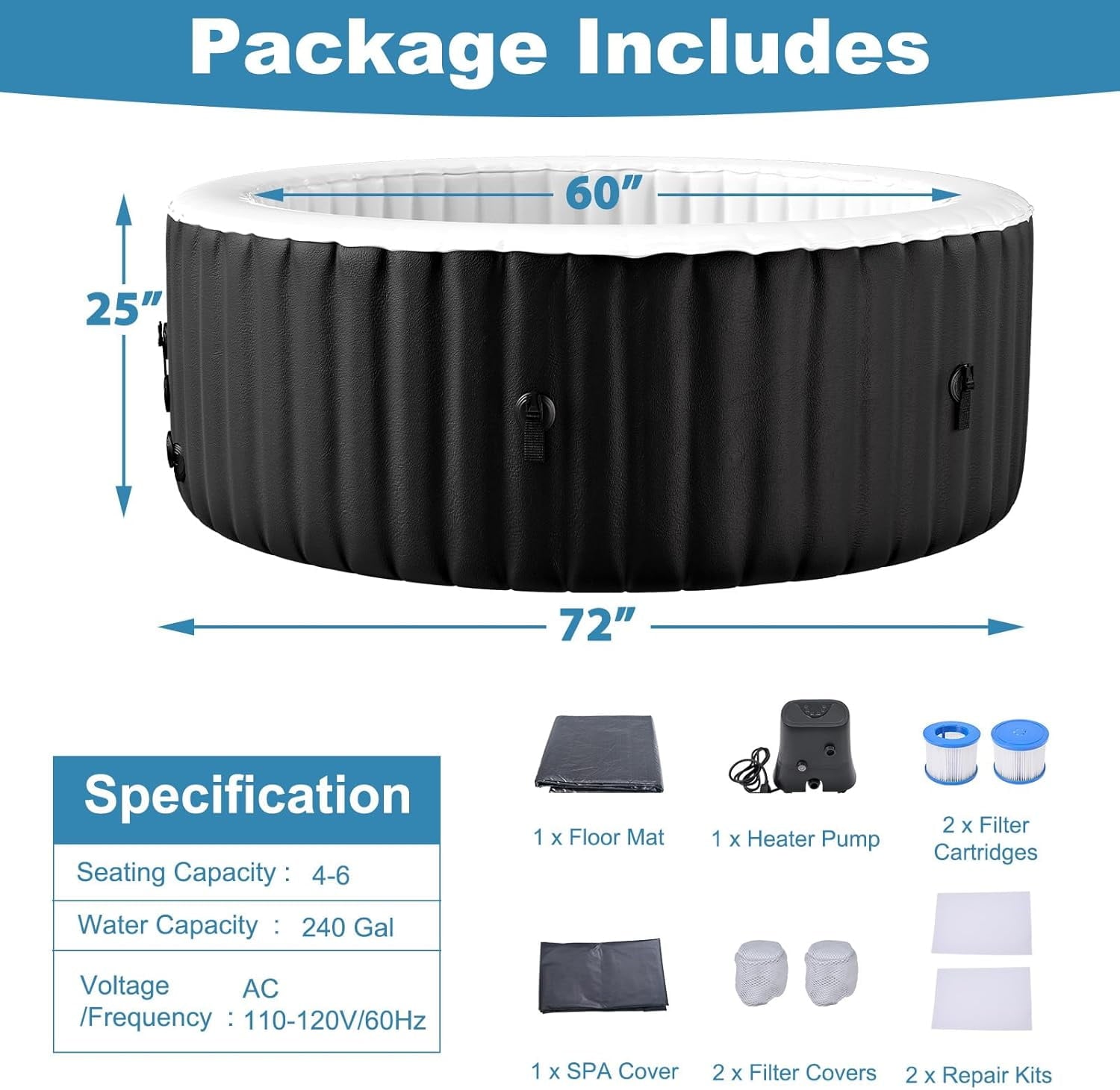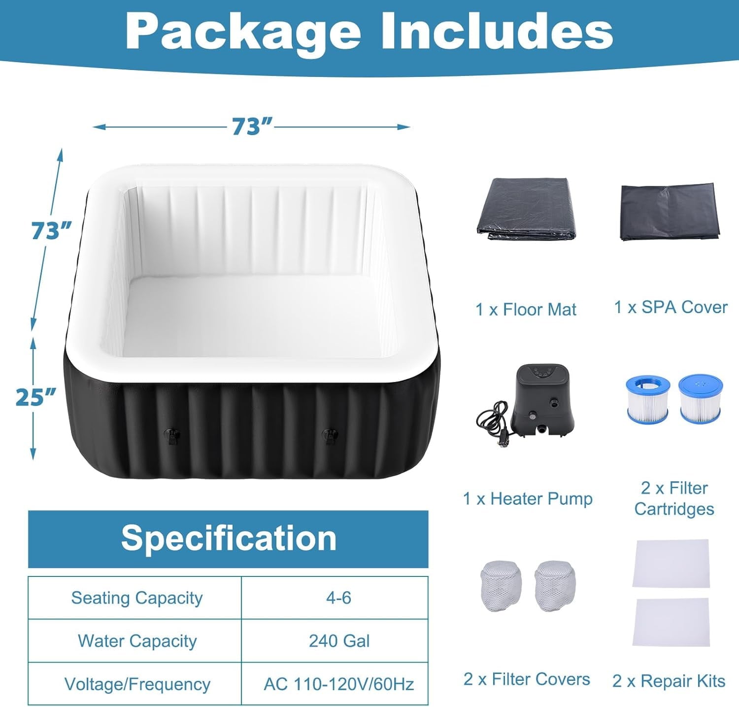 【240 Gallon Large Hot Tub for 4-6 People】This spacious design can accommodate six adults, although each person may need to sit cross-legged. For a more comfortable massage experience, seating four people allows enough space to stretch out your legs. Our inflatable hot tub creates a relaxing backyard oasis for your large family or entertaining friends.