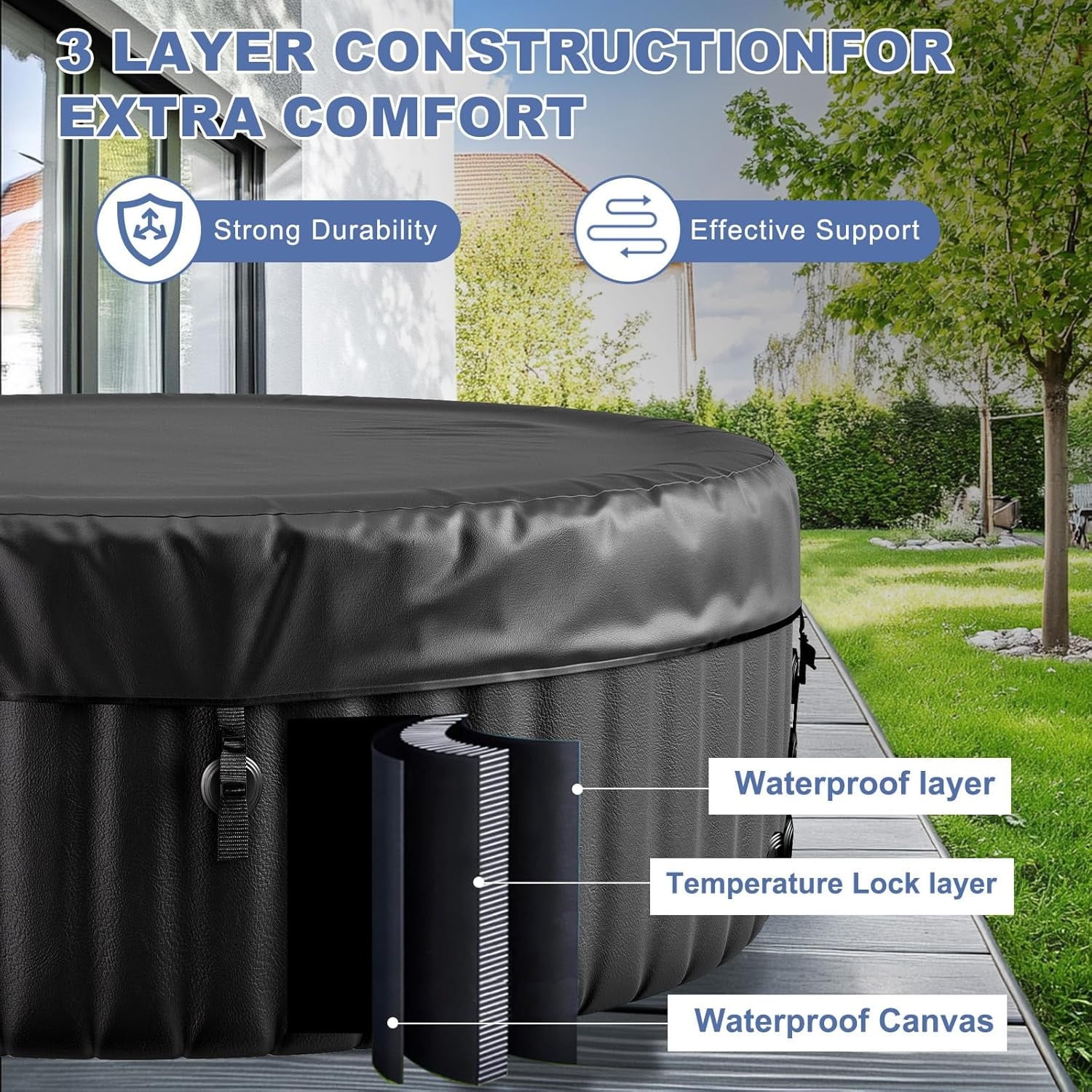 【3-Layer Leak-Proof PVC Construction】Inflatable hot tub features a waterproof layer, a temp lock layer and a waterproof canvas for excellent waterproofing and durability. PVC offers puncture and tear resistance and is closely connected to the pump to prevent leaks. Plus, PE ground cloth prevents water penetration, protecting the ground from moisture. Perfect for outdoor activities and travel.