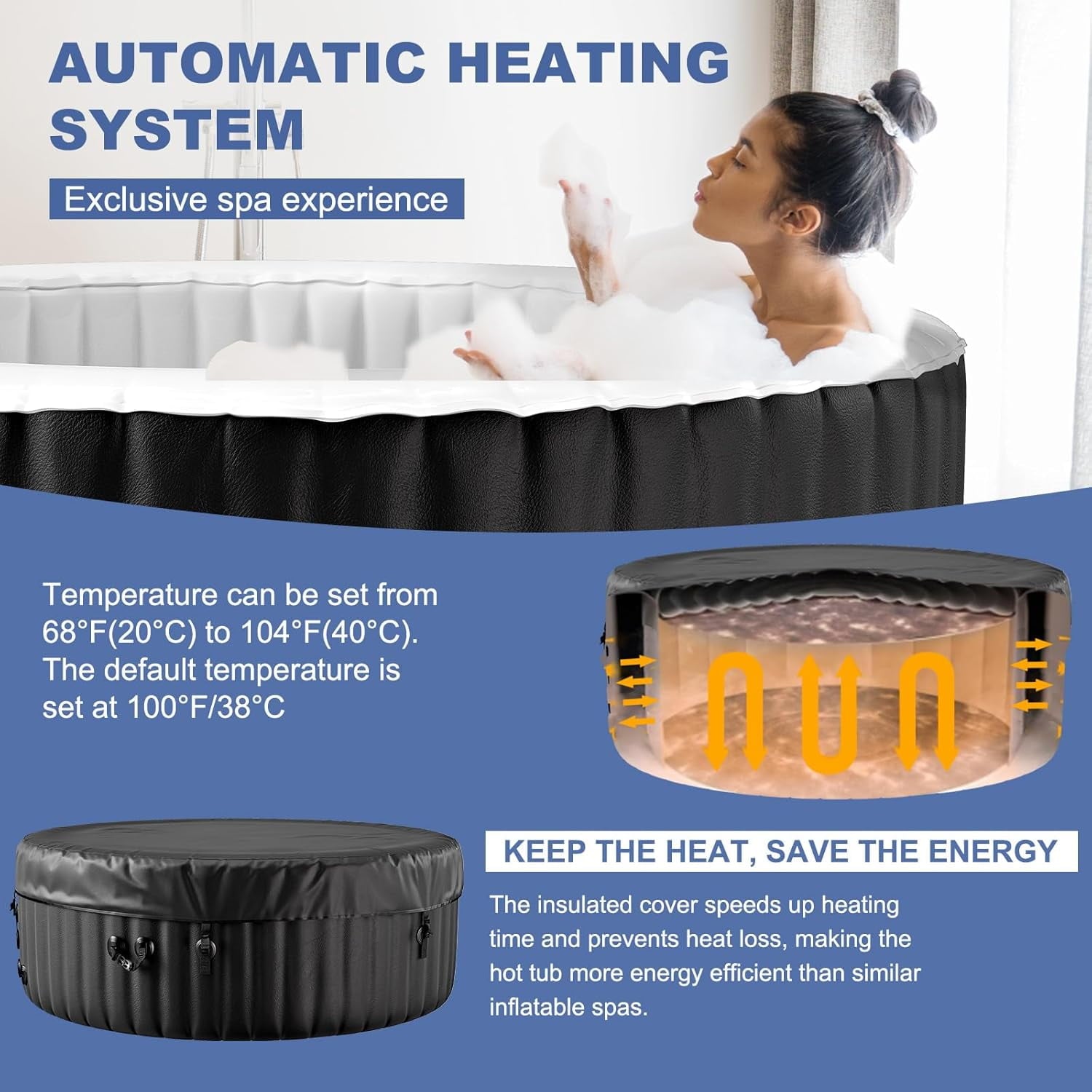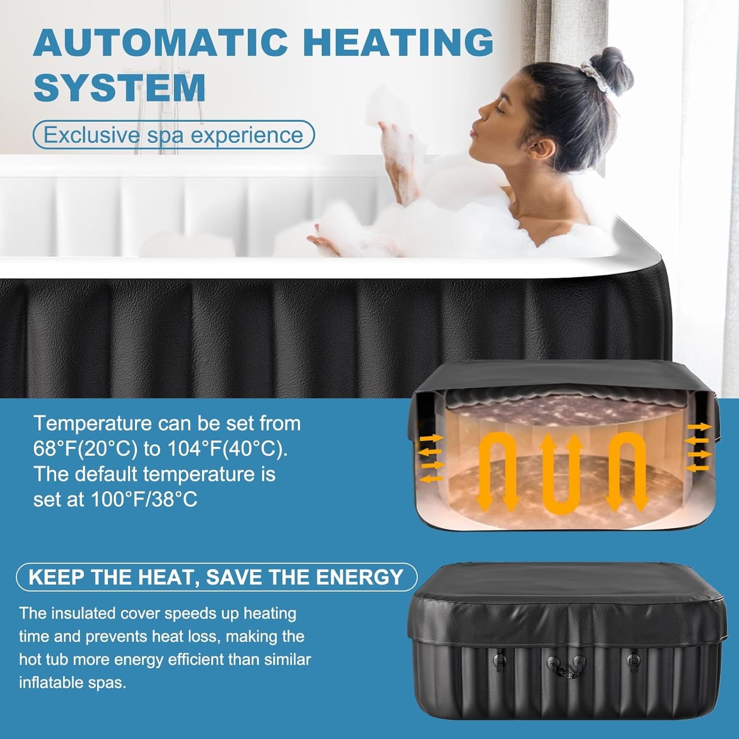 【Efficient Heat & Keep Temp with Cover】Built-in 1350W heater can warm the water from 68℉ to 104℉ for a relaxing soak. Included thermal cover helps retain heat when not in use and its black color gathers heat from the sun for energy-saving. For better heat retention, it is recommended to place a sponge mat (not included) at the bottom.