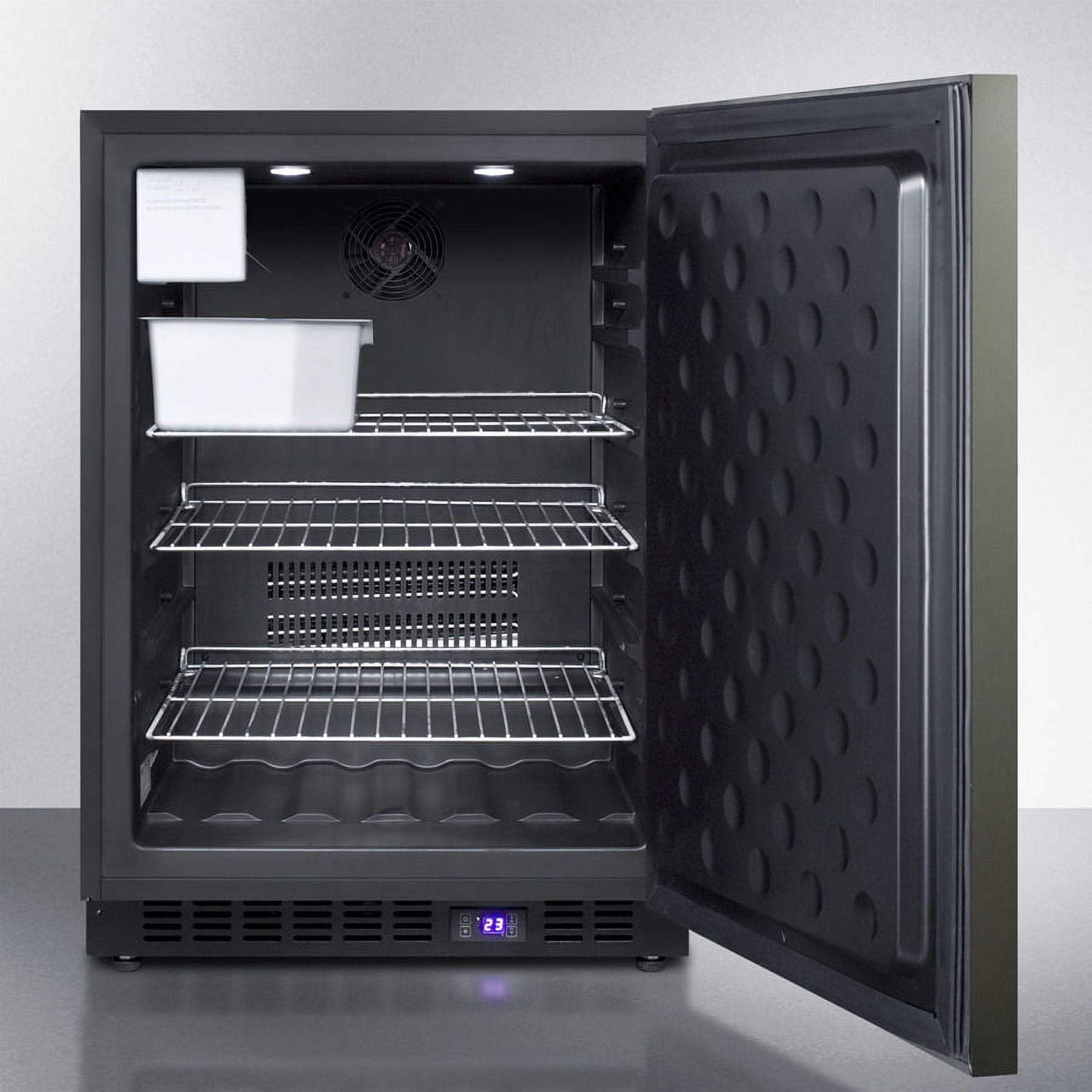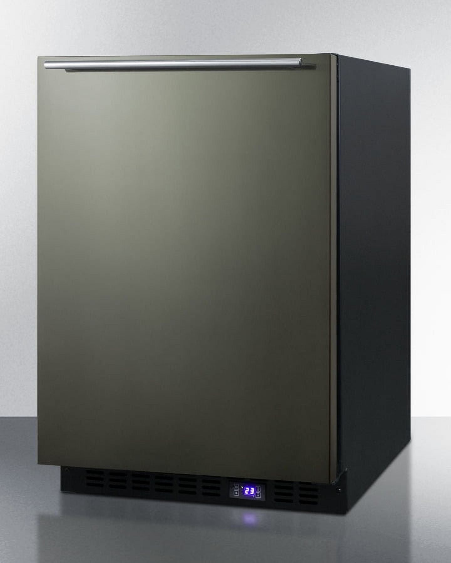 SUMMIT’s SCFF53B Series brings quality and convenience under the counter with a fully featured lineup of built-in frost-free all-freezers.Sized with a convenient 24″ footprint, the SCFF53BXKSHHIM freezer utilizes a front-breathing design for built-in installation under counters, with a fully finished black cabinet that also allows freestanding use. This model’s reversible door comes in our new black stainless steel finish from our exclusive basalt collection. The wrapped door is made from 304 grade stainless steel with a high gloss finish in a neutral hue to perfectly accent or complement your kitchen design. The door is strongly resistant to most fingerprints and can easily be wiped clean with a dry cloth. Our signature thin handle in brushed stainless steel is mounted horizontally to complete the modern look.Inside, the SCFF53BXKSHHIM utilizes frost-free operation with fan-forced cooling to ensure low maintenance and even temperature distribution. Recessed LED lighting offers an attractive yet efficient look. The digital thermostat makes it easy to manage the interior temperature. This unit includes adjustable chrome shelves for flexible storage and a factory installed icemaker. Additional features include an open door alarm, high temperature alarm, and Sabbath mode setting that lets you disable some of the electrical elements during periods of observance.With its deluxe style and user-friendly features, the SCFF53BXKSHHIM is the perfect choice for home or commercial kitchens. For a matching frost-free all-refrigerator, see the FF64BXKSHH.NOTE: Black stainless steel may vary slightly in appearance from the image displayed, as it has a reflective quality that can be affected by surrounding colors and textures. Summit’s black stainless steel comes with a high gloss finish and is not designed as a direct match to other brands.