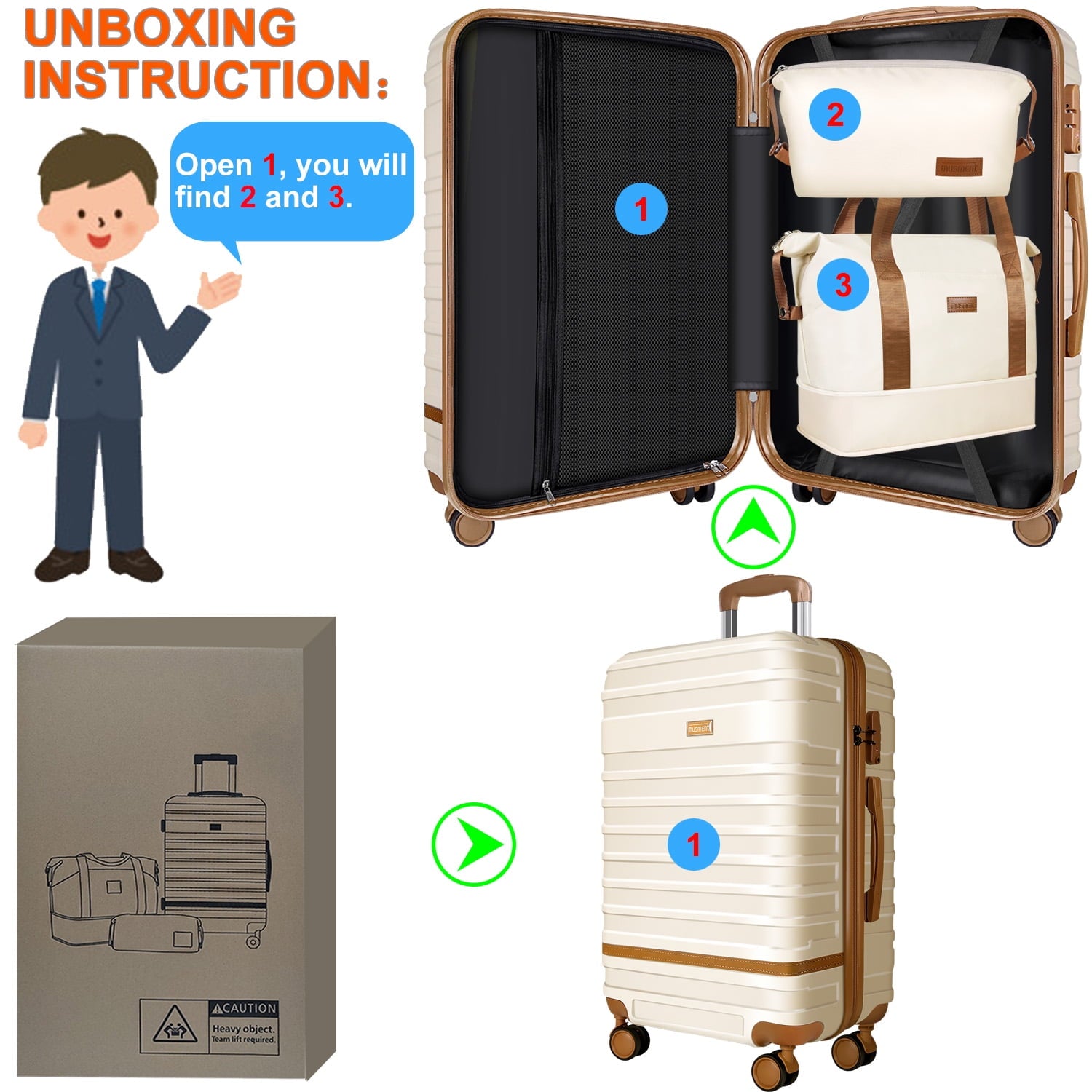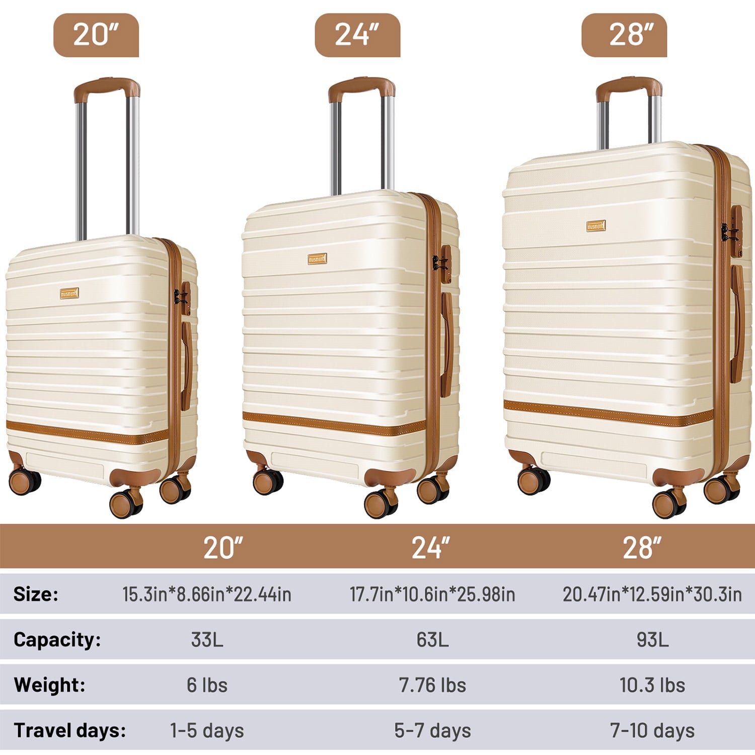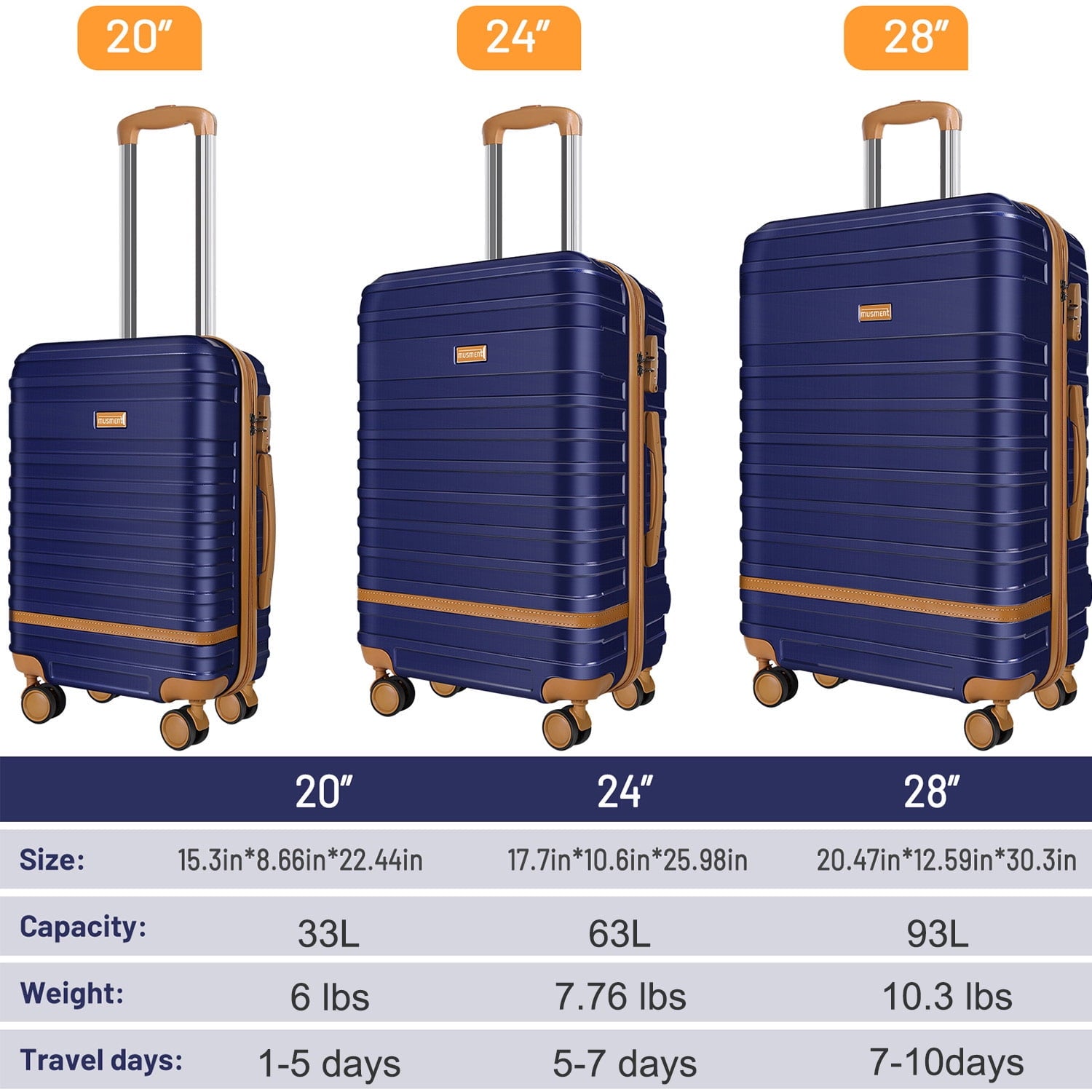 Musment committed to providing high quality and affordable luggage sets and Satisfy customers service, Professional fashion designs and bright colors make suitcase stand out in the crowd. Durable lightweight, and water-resistant ABS hardside shell, adjust freely handle, smooth 360°double wheels, TSA lock, and large storage space design help you bring easy, convenient and happy travel life.