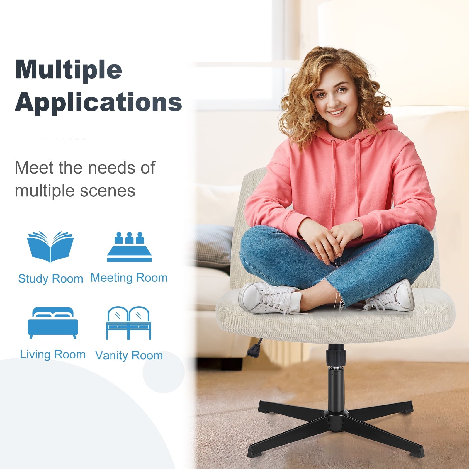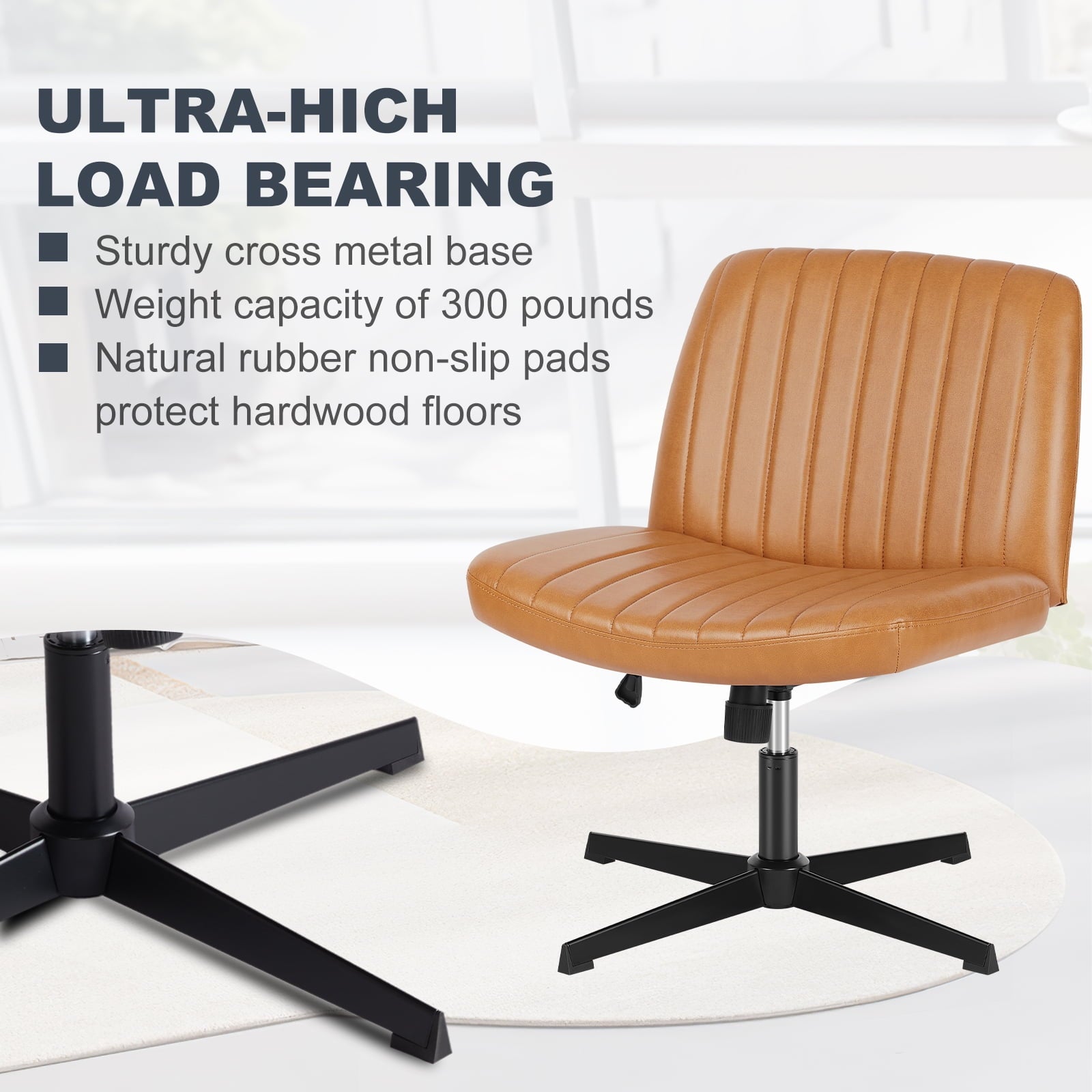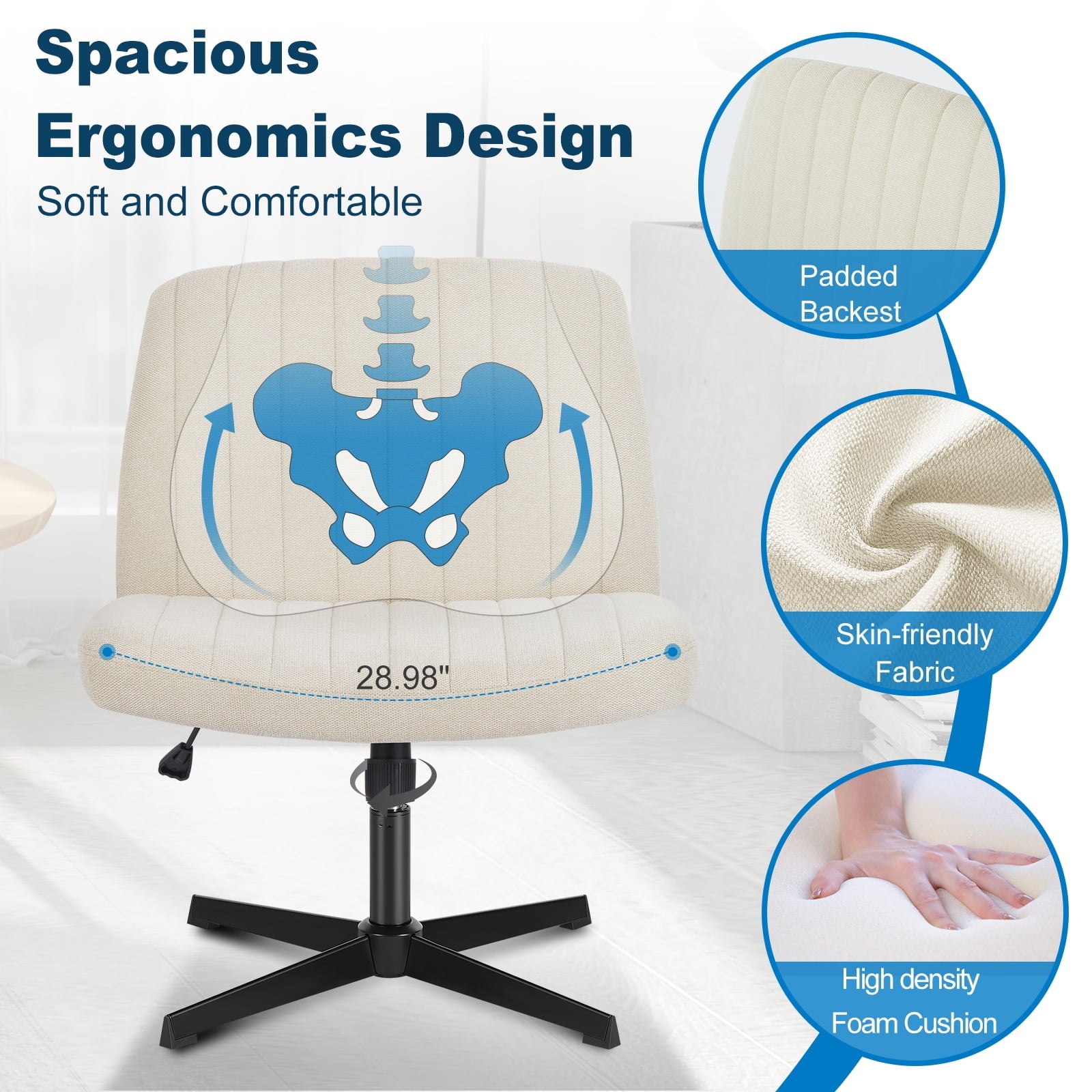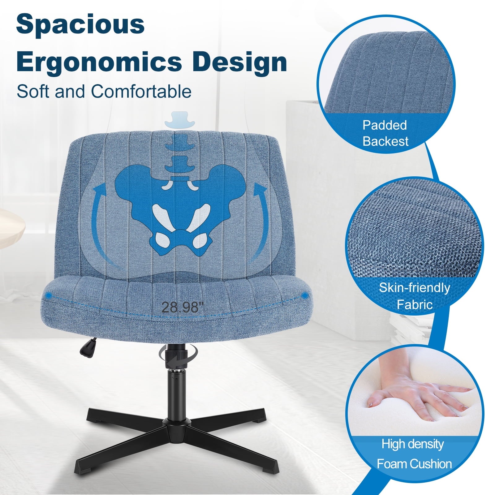 • [Sturdy & Stylish] – Built with an SGS-certified gas spring and a durable metal cross base, this chair supports up to 300 lbs. Its non-slip, scratch-resistant rubber feet provide stability and protect your floors. Unlike traditional office chairs, this modern cross-legged design and soft, skin-friendly fabric add a dynamic touch to any room. Perfect for your home office, living room, bedroom, study, or powder room.