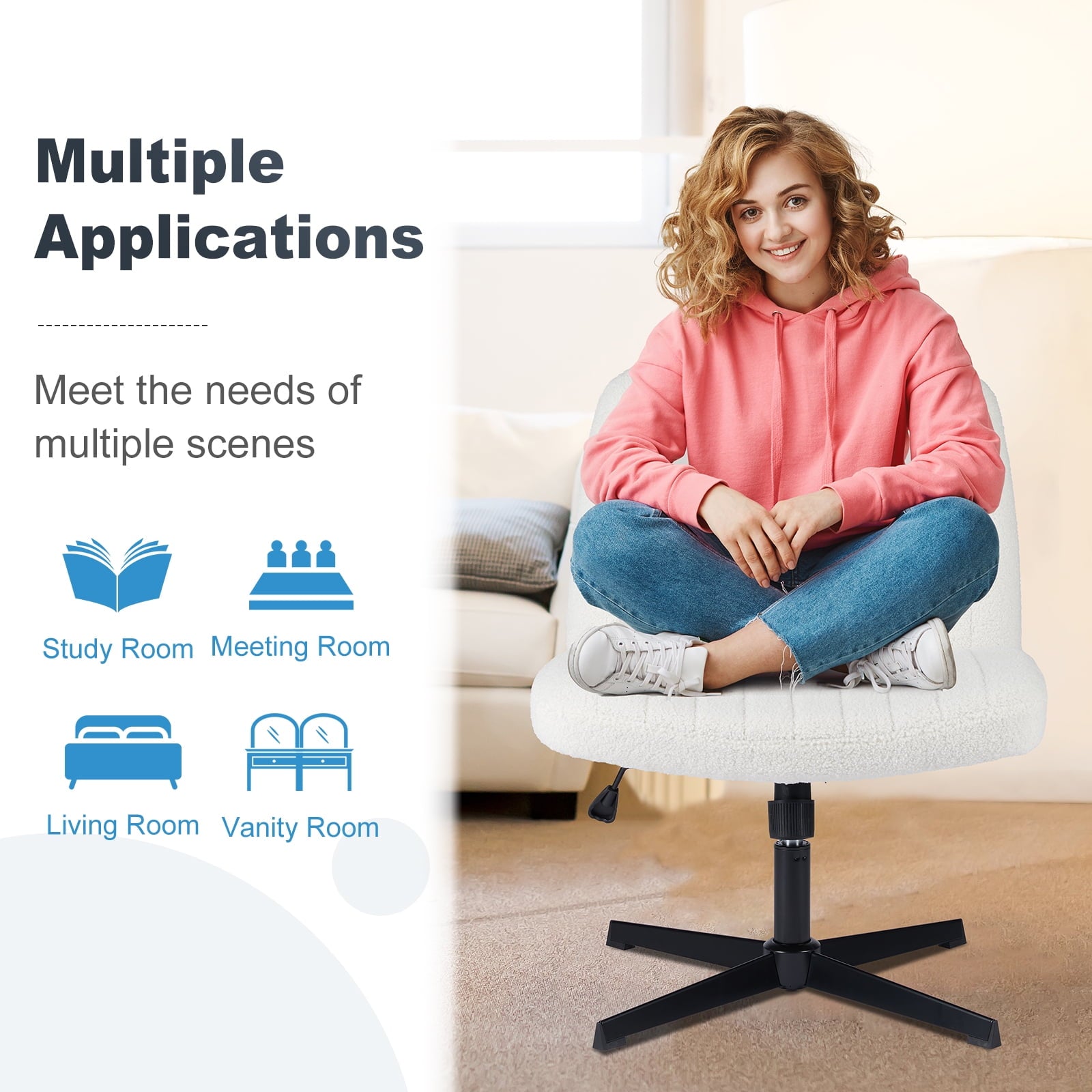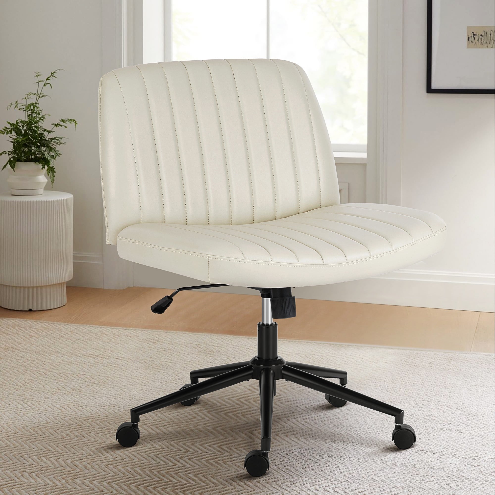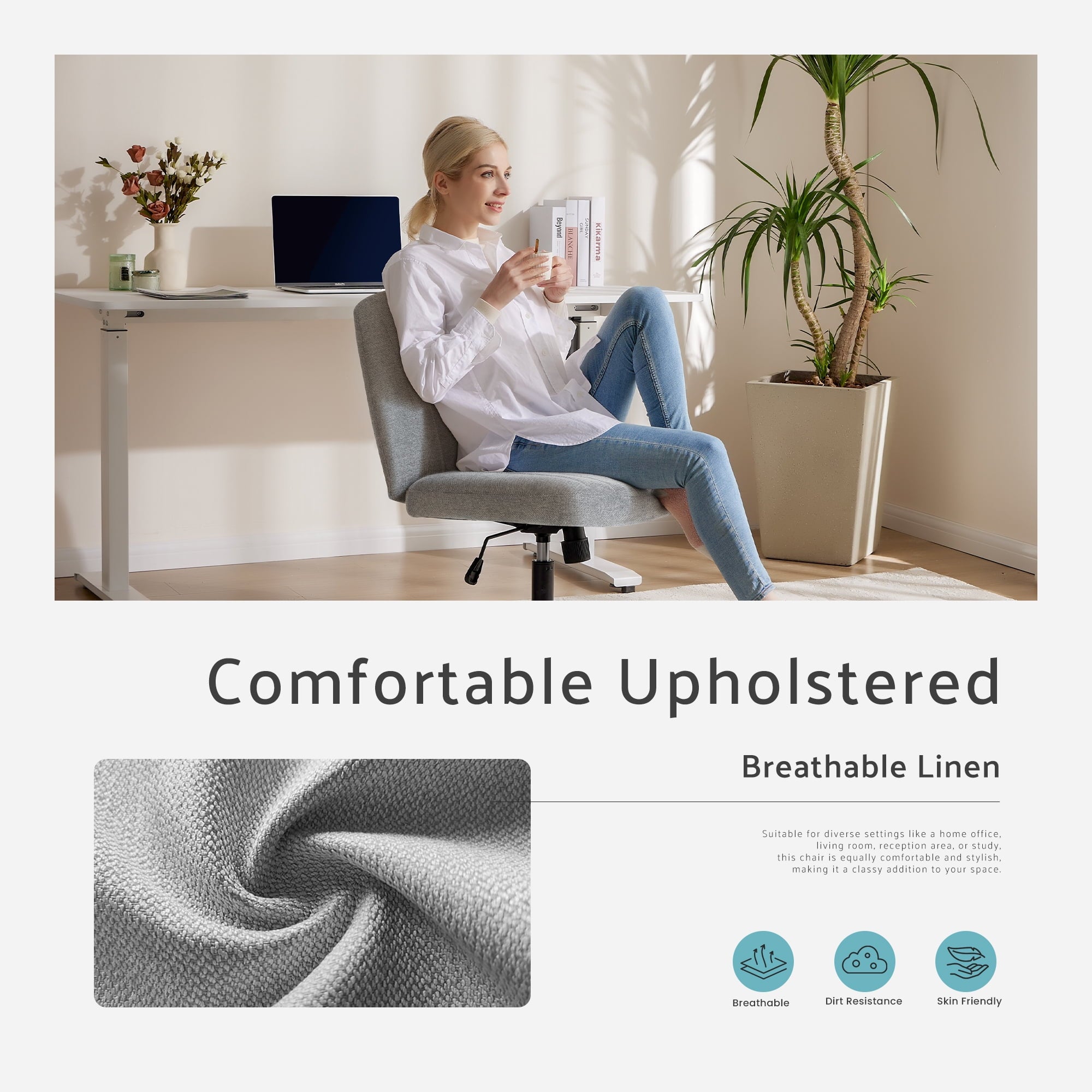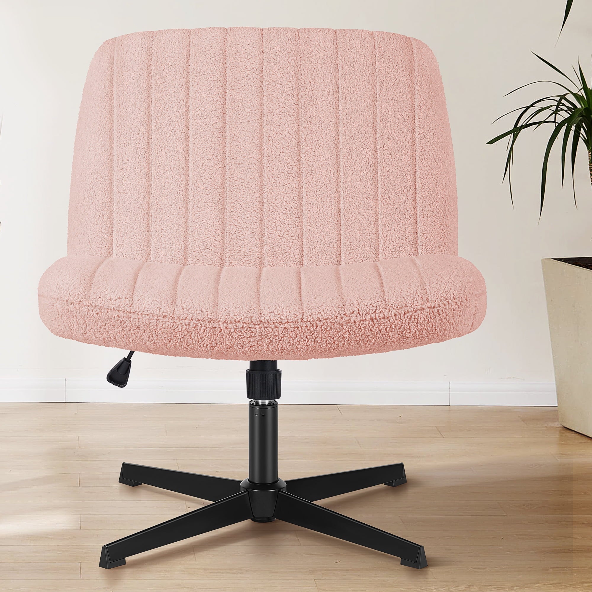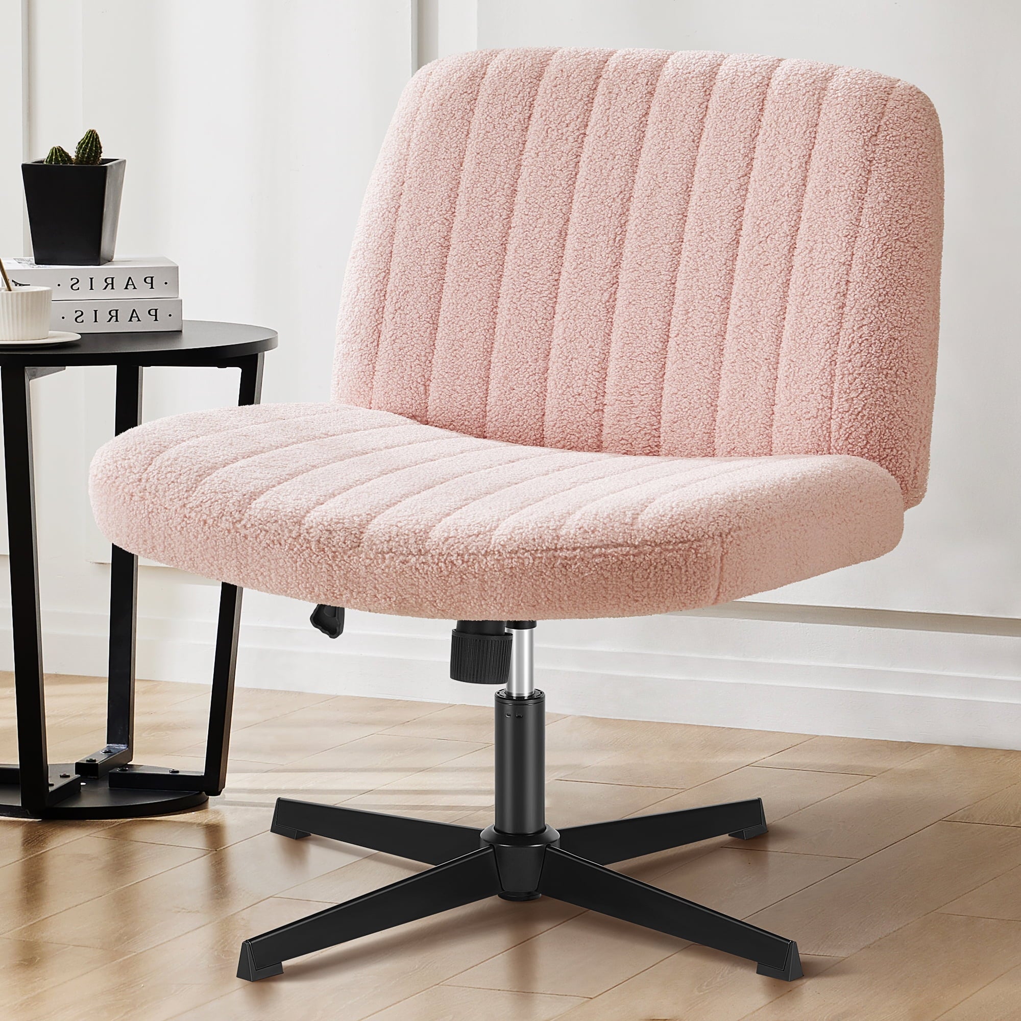 • [Sturdy & Stylish] – Built with an SGS-certified gas spring and a durable metal cross base, this chair supports up to 300 lbs. Its non-slip, scratch-resistant rubber feet provide stability and protect your floors. Unlike traditional office chairs, this modern cross-legged design and soft, skin-friendly fabric add a dynamic touch to any room. Perfect for your home office, living room, bedroom, study, or powder room.