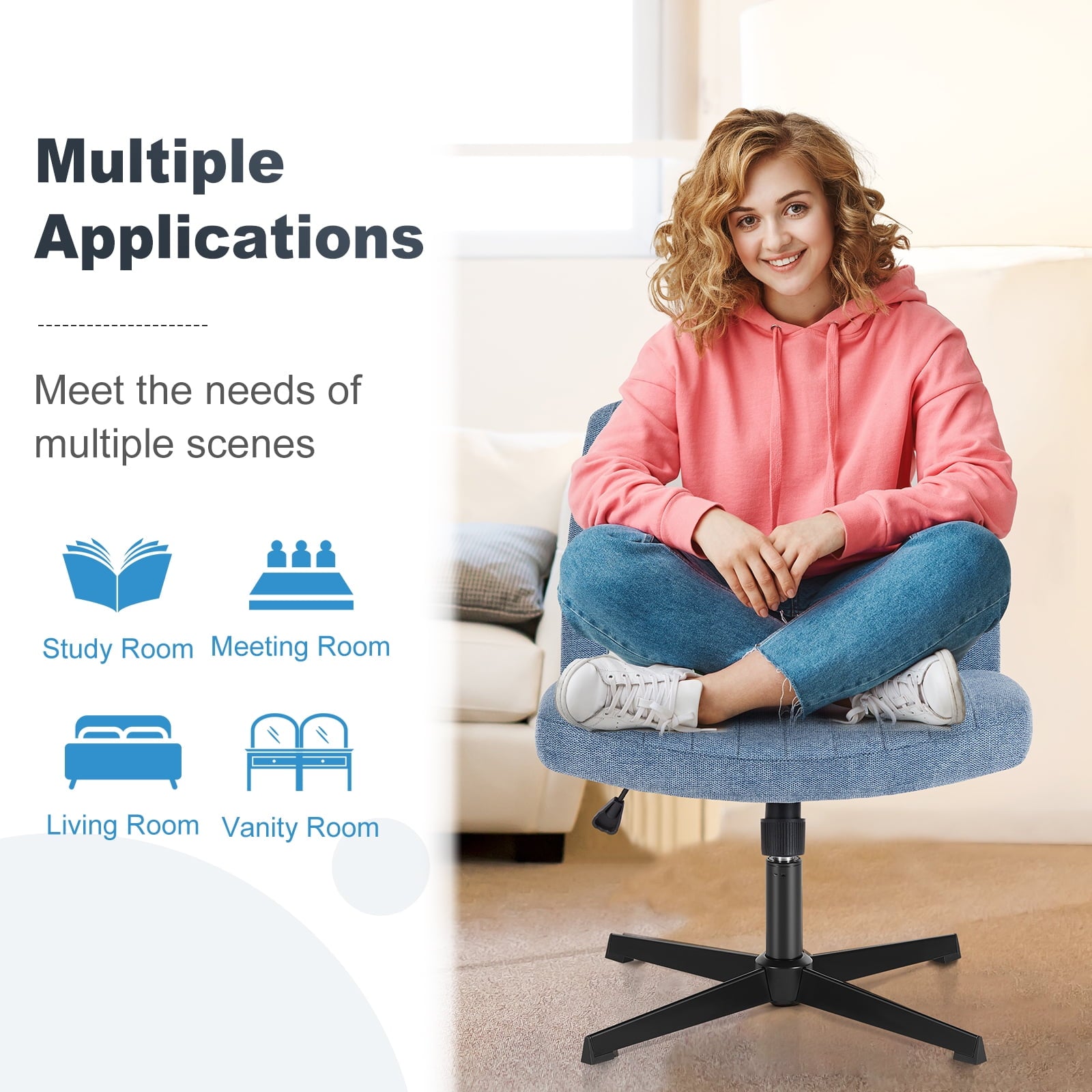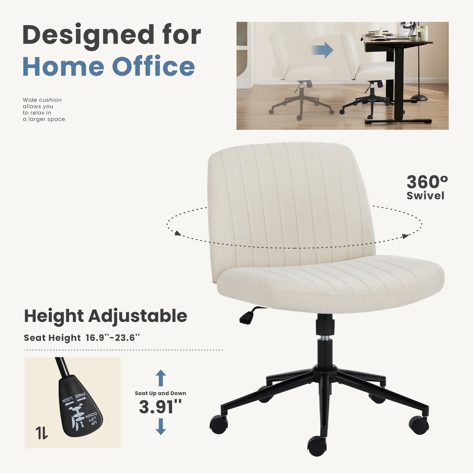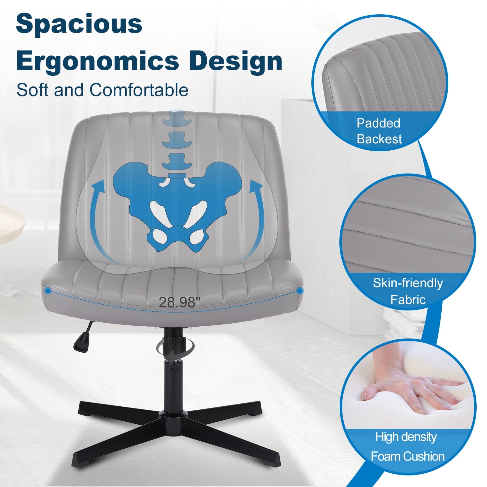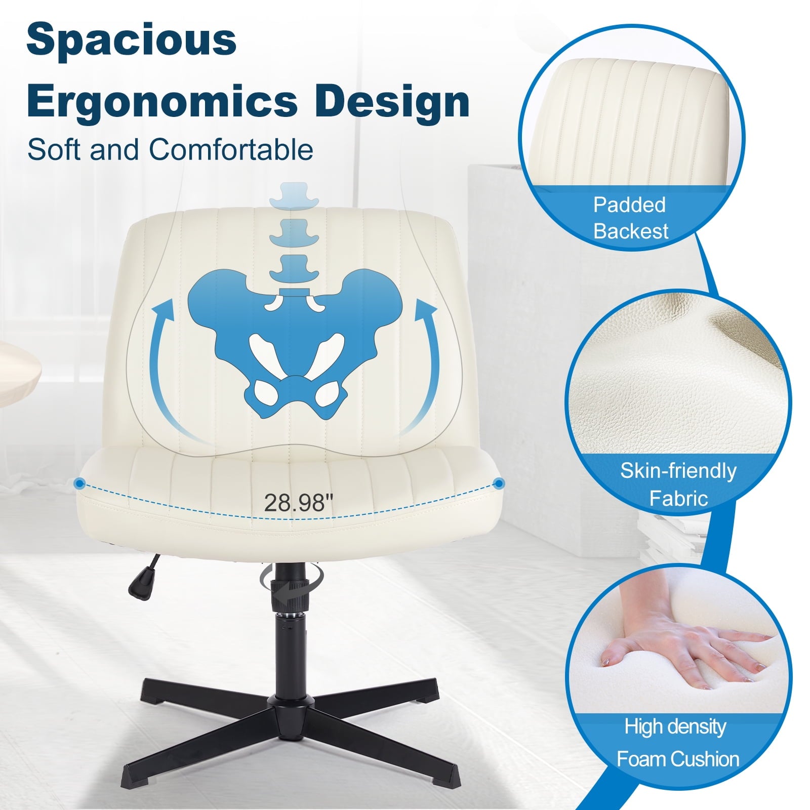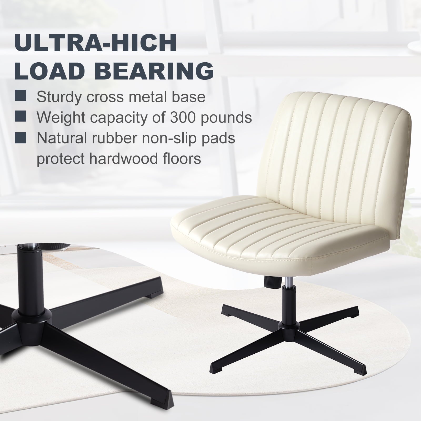 • [Sturdy & Stylish] – Built with an SGS-certified gas spring and a durable metal cross base, this chair supports up to 300 lbs. Its non-slip, scratch-resistant rubber feet provide stability and protect your floors. Unlike traditional office chairs, this modern cross-legged design and soft, skin-friendly fabric add a dynamic touch to any room. Perfect for your home office, living room, bedroom, study, or powder room.