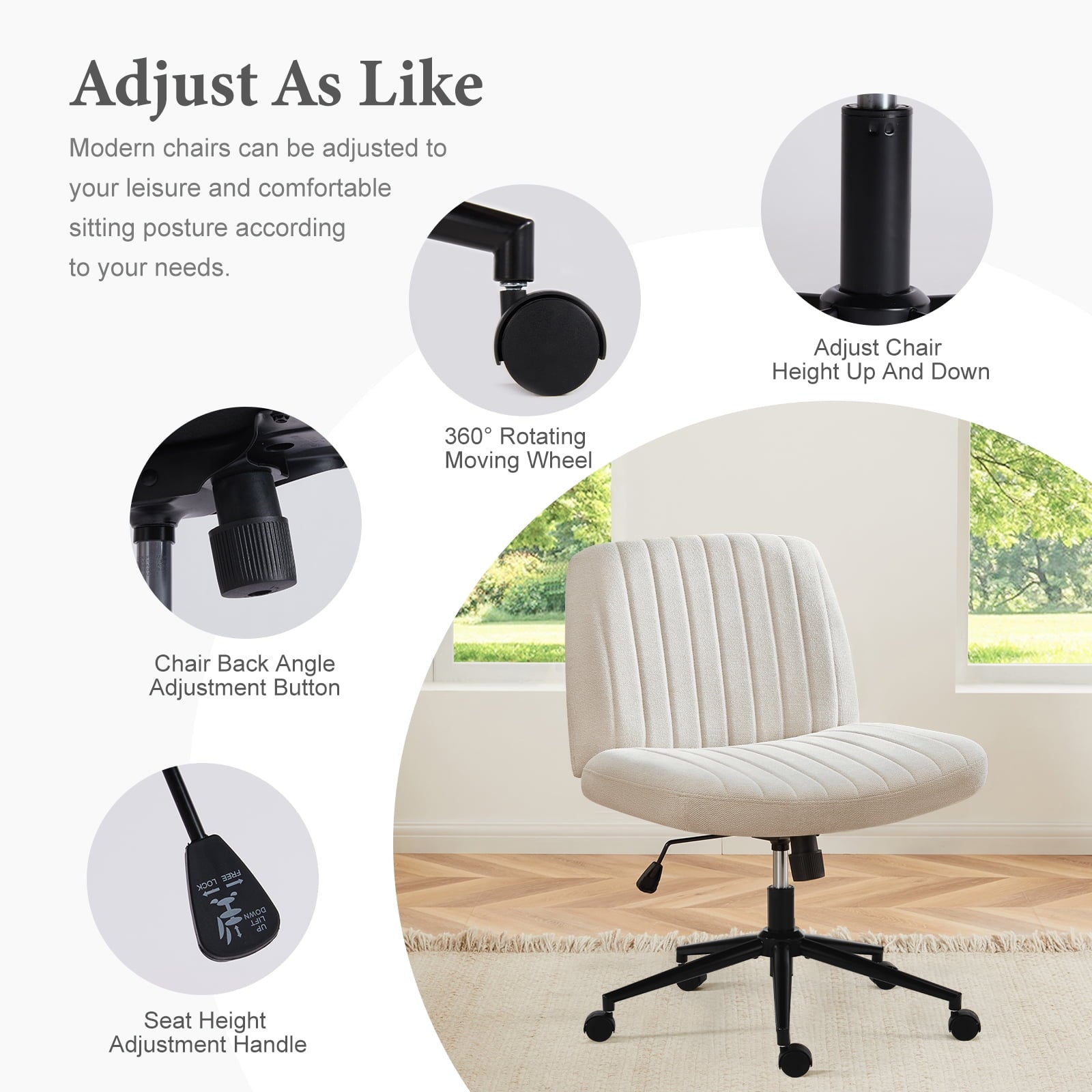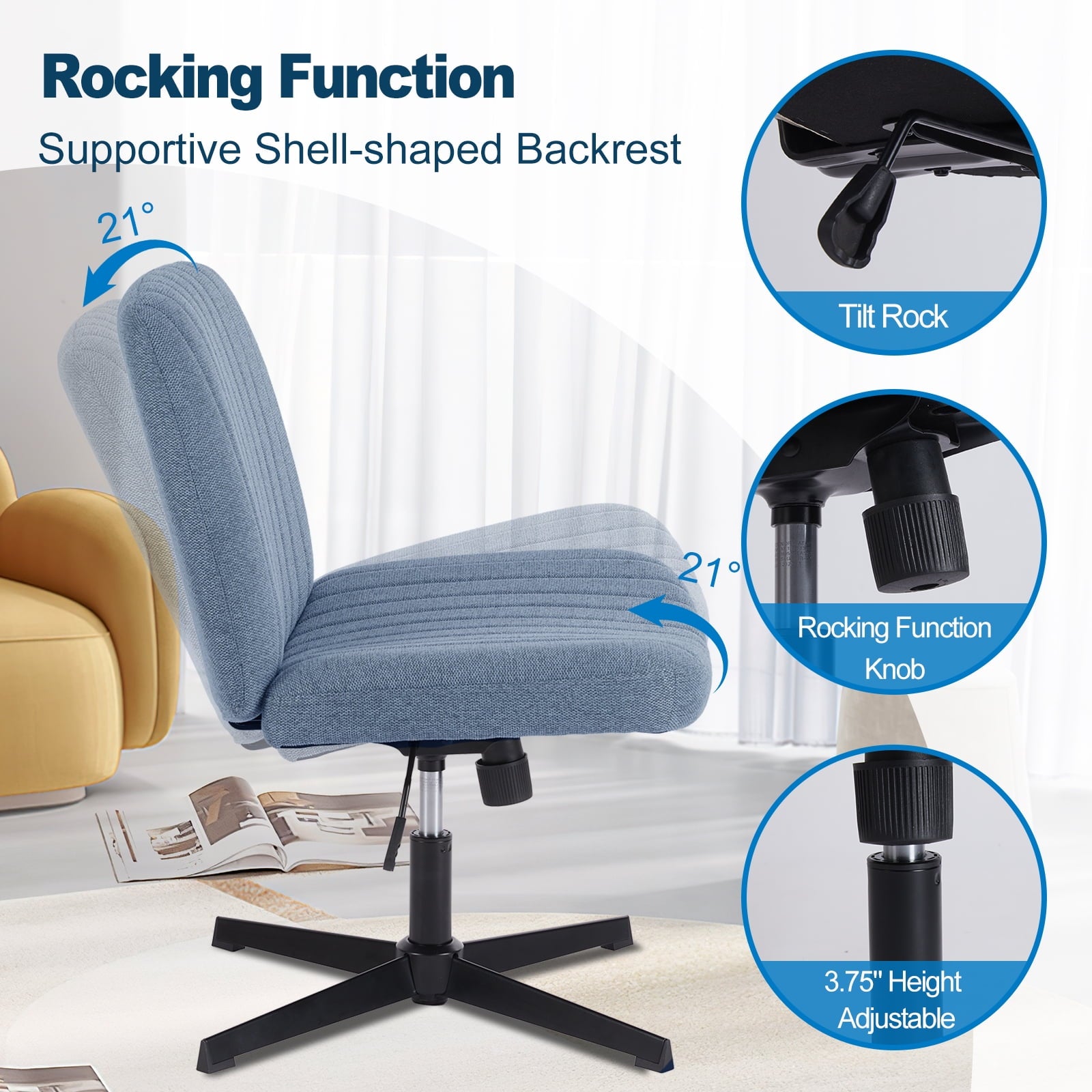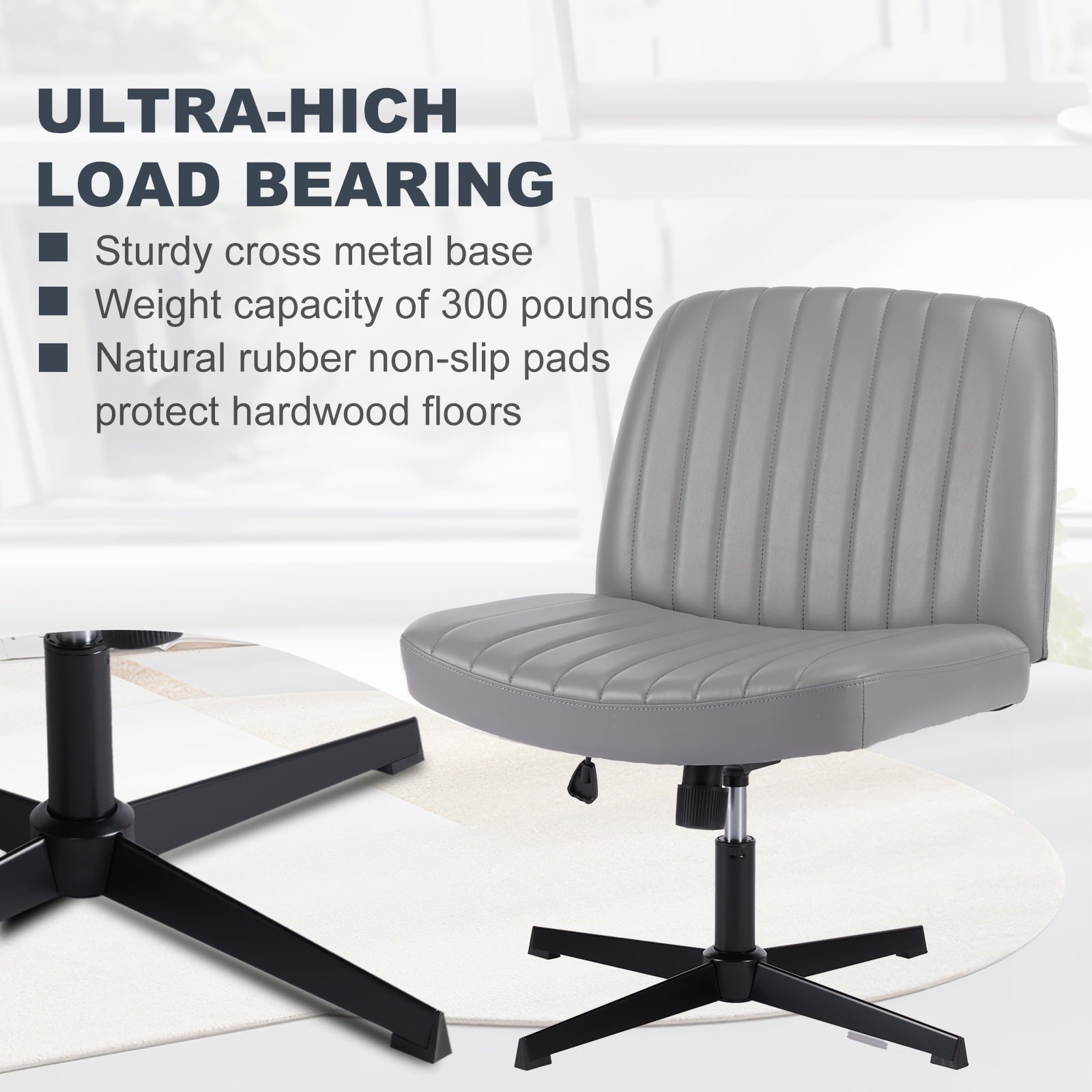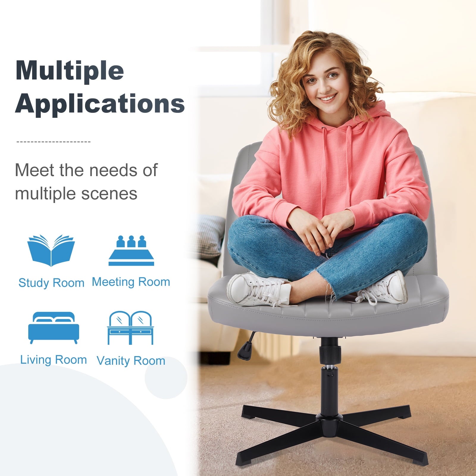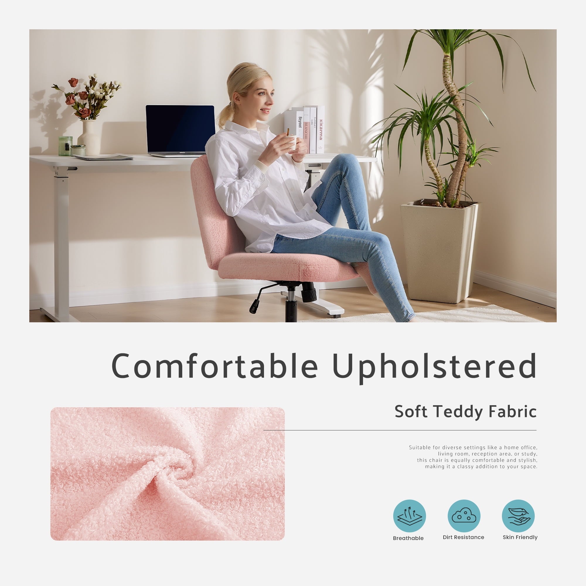 • [Sturdy & Stylish] – Built with an SGS-certified gas spring and a durable metal cross base, this chair supports up to 300 lbs. Its non-slip, scratch-resistant rubber feet provide stability and protect your floors. Unlike traditional office chairs, this modern cross-legged design and soft, skin-friendly fabric add a dynamic touch to any room. Perfect for your home office, living room, bedroom, study, or powder room.