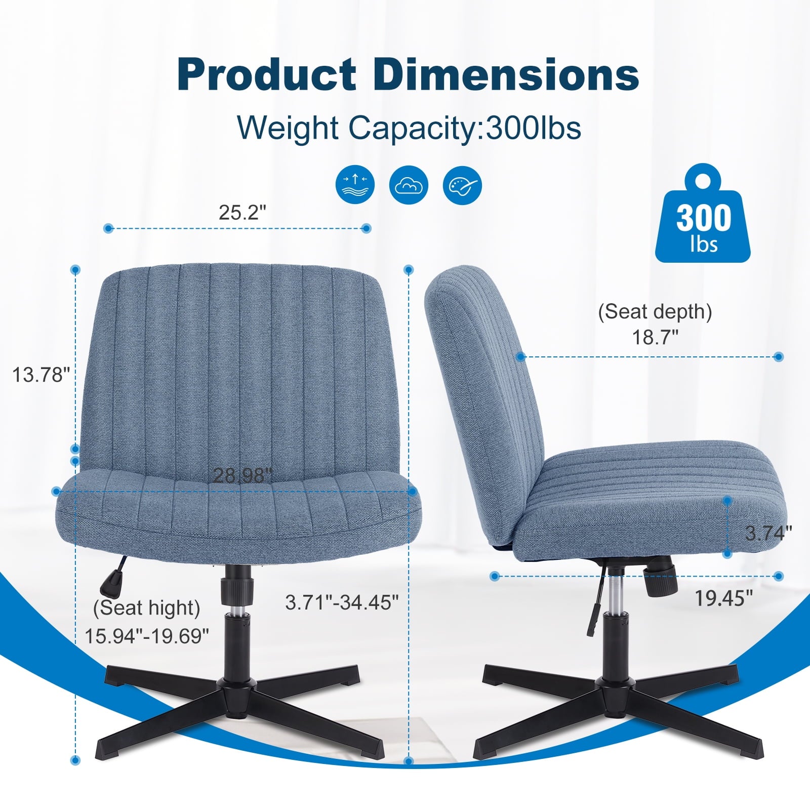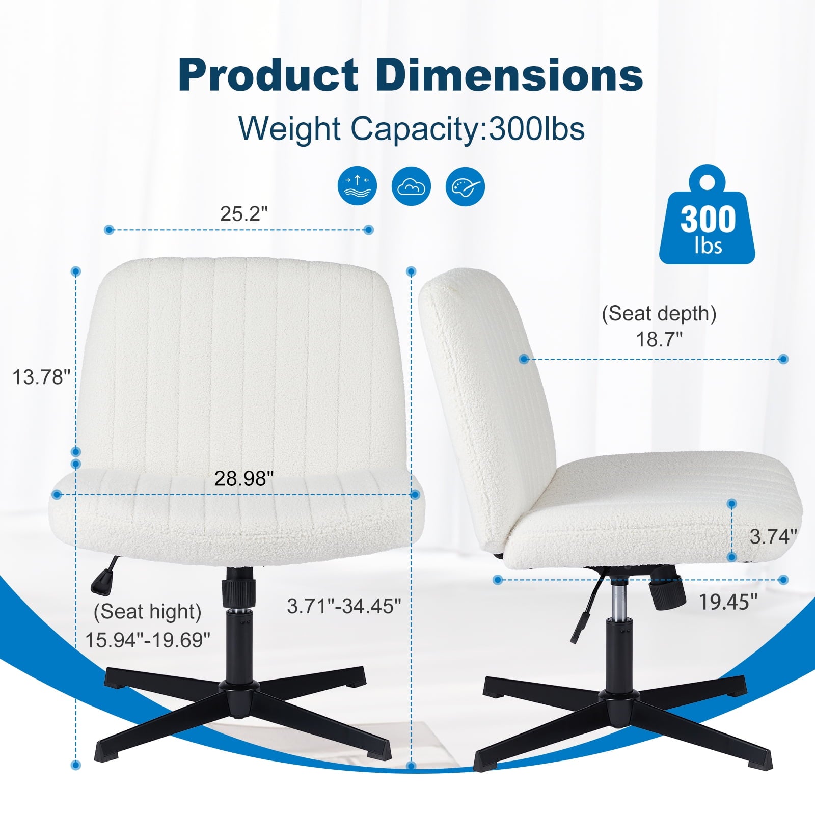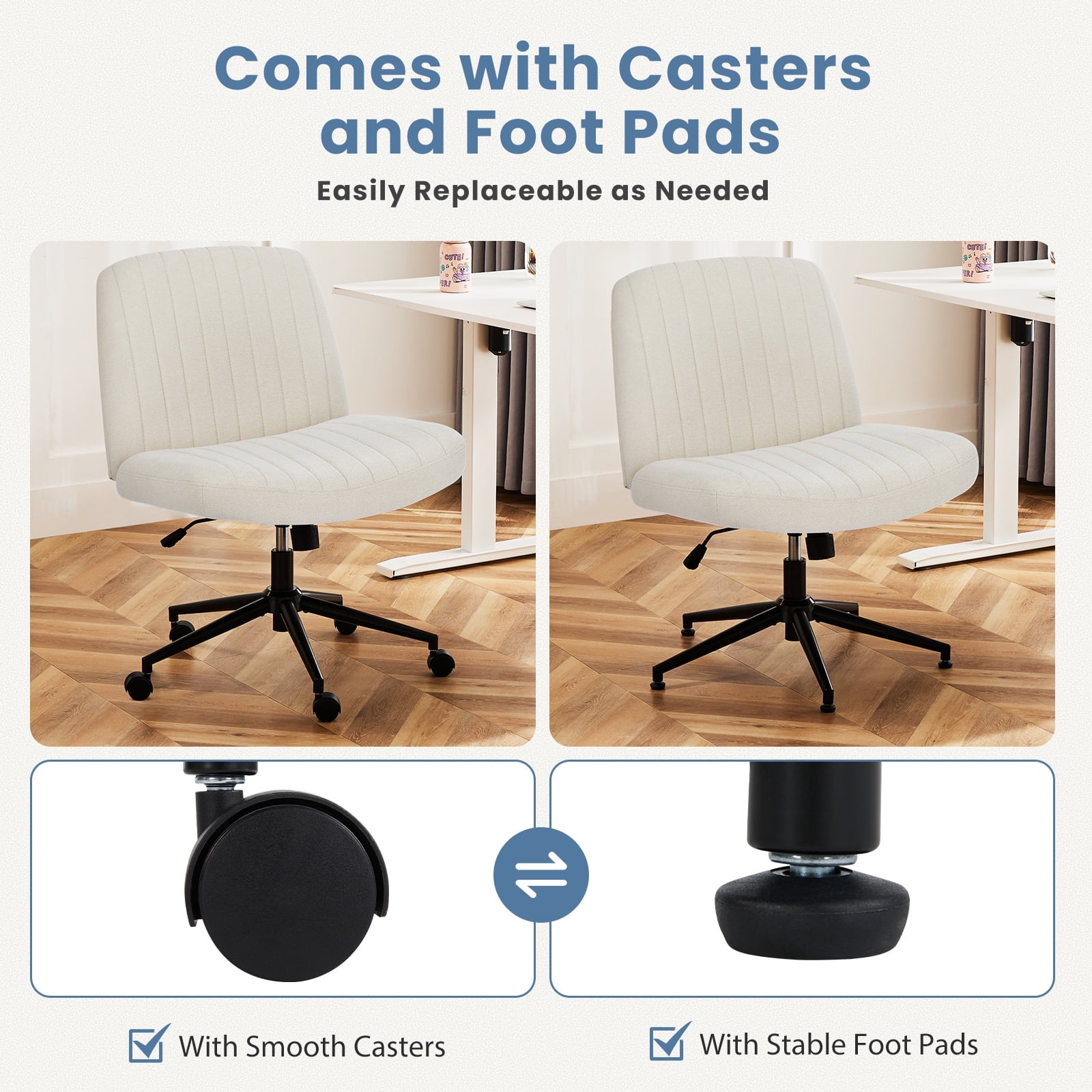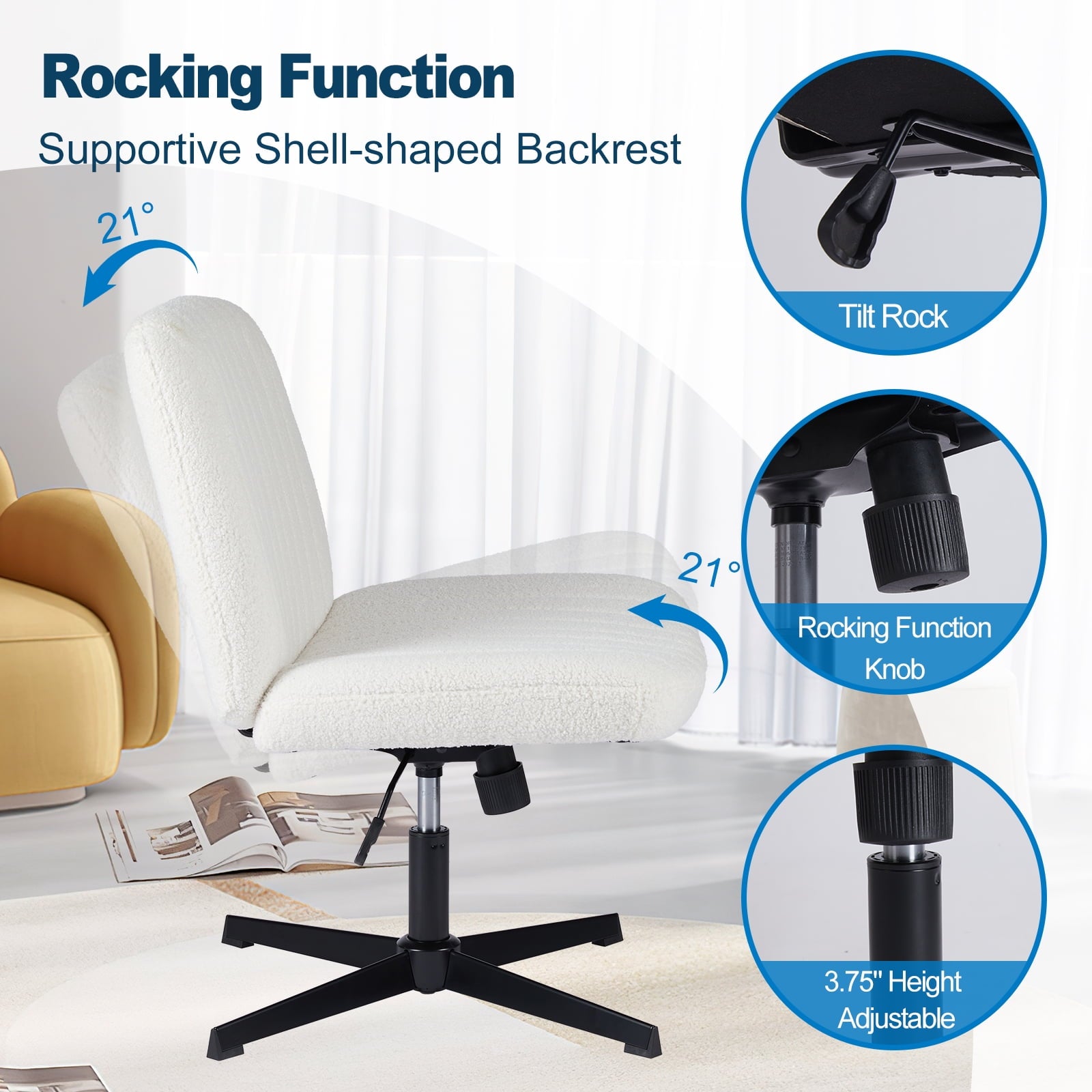 • [Sturdy & Stylish] – Built with an SGS-certified gas spring and a durable metal cross base, this chair supports up to 300 lbs. Its non-slip, scratch-resistant rubber feet provide stability and protect your floors. Unlike traditional office chairs, this modern cross-legged design and soft, skin-friendly fabric add a dynamic touch to any room. Perfect for your home office, living room, bedroom, study, or powder room.