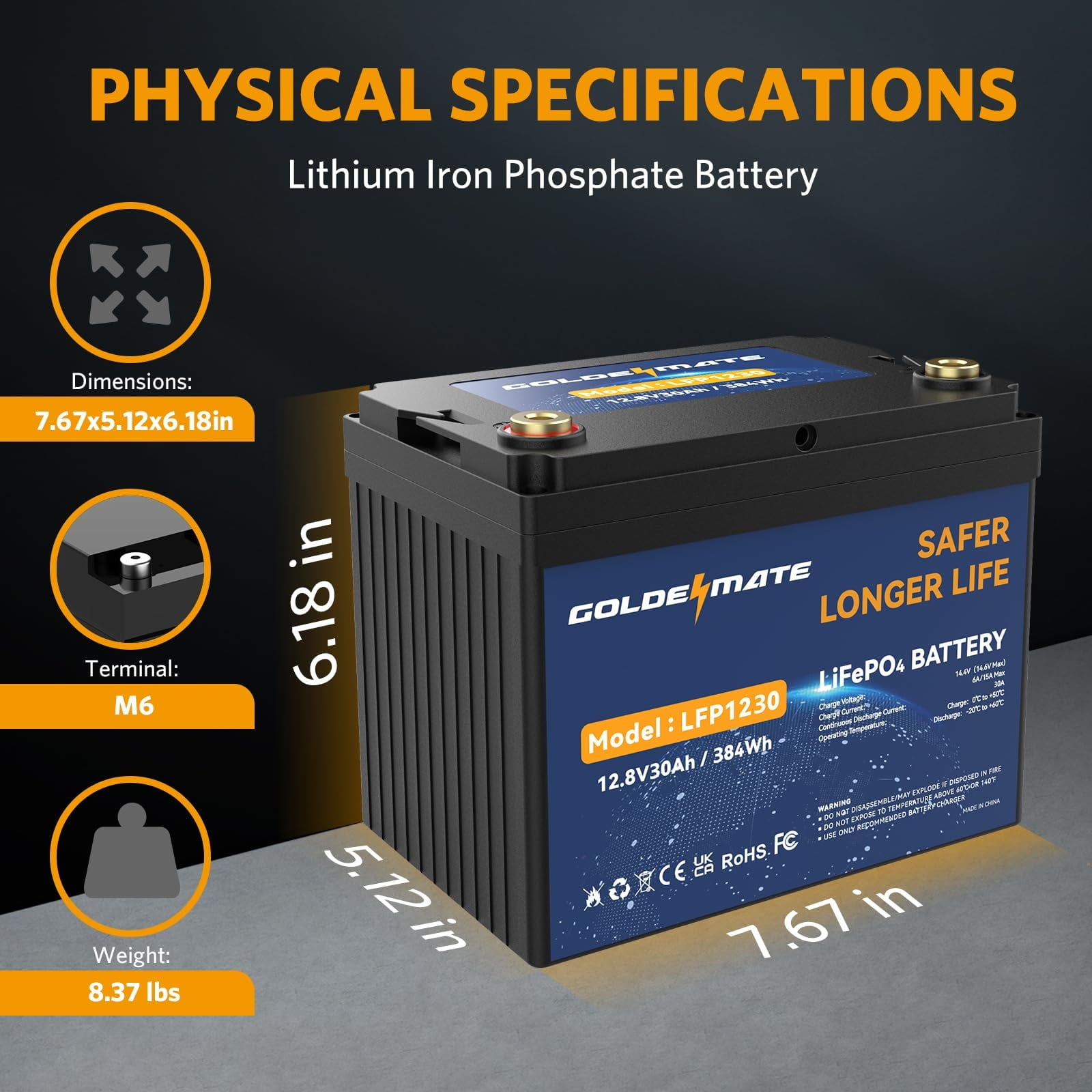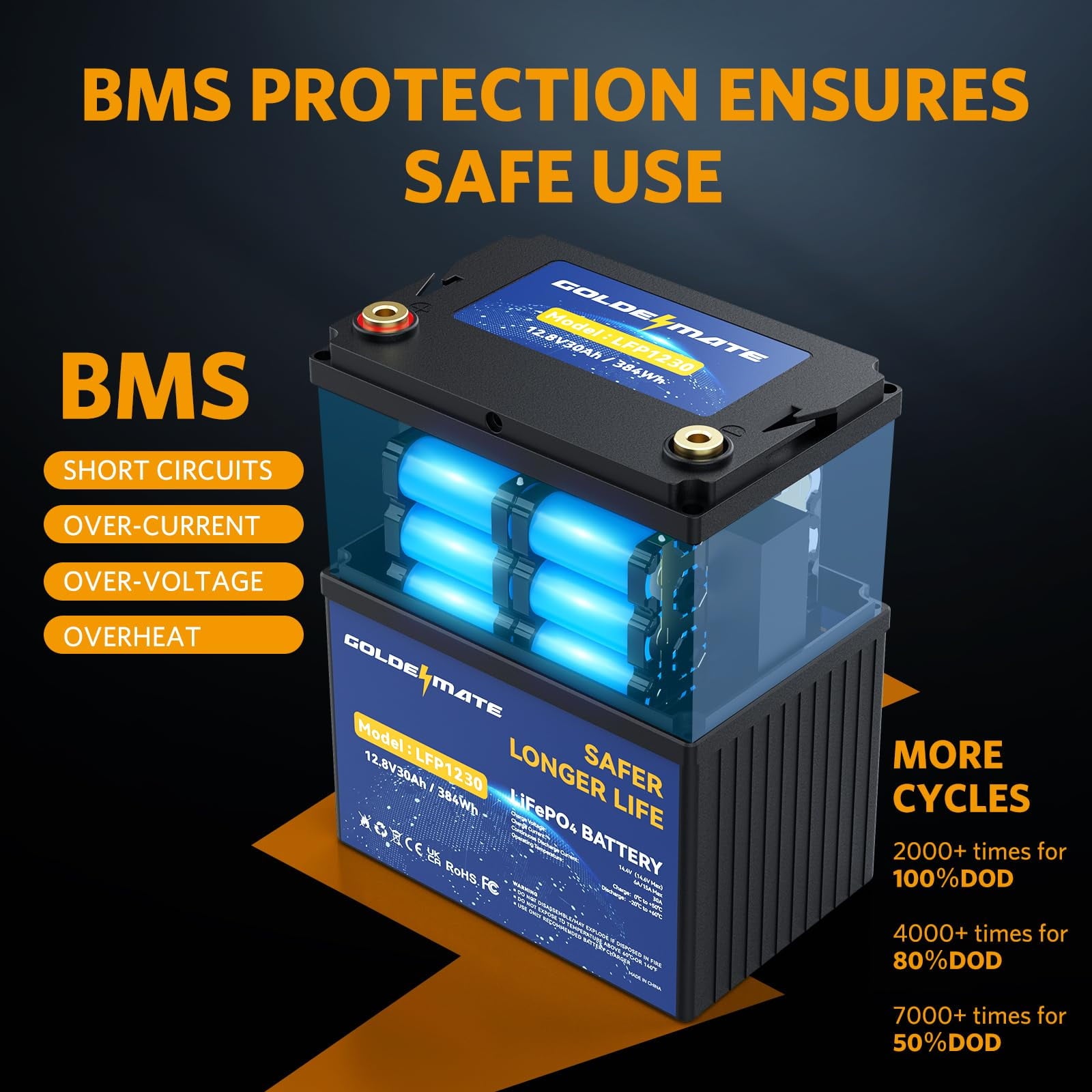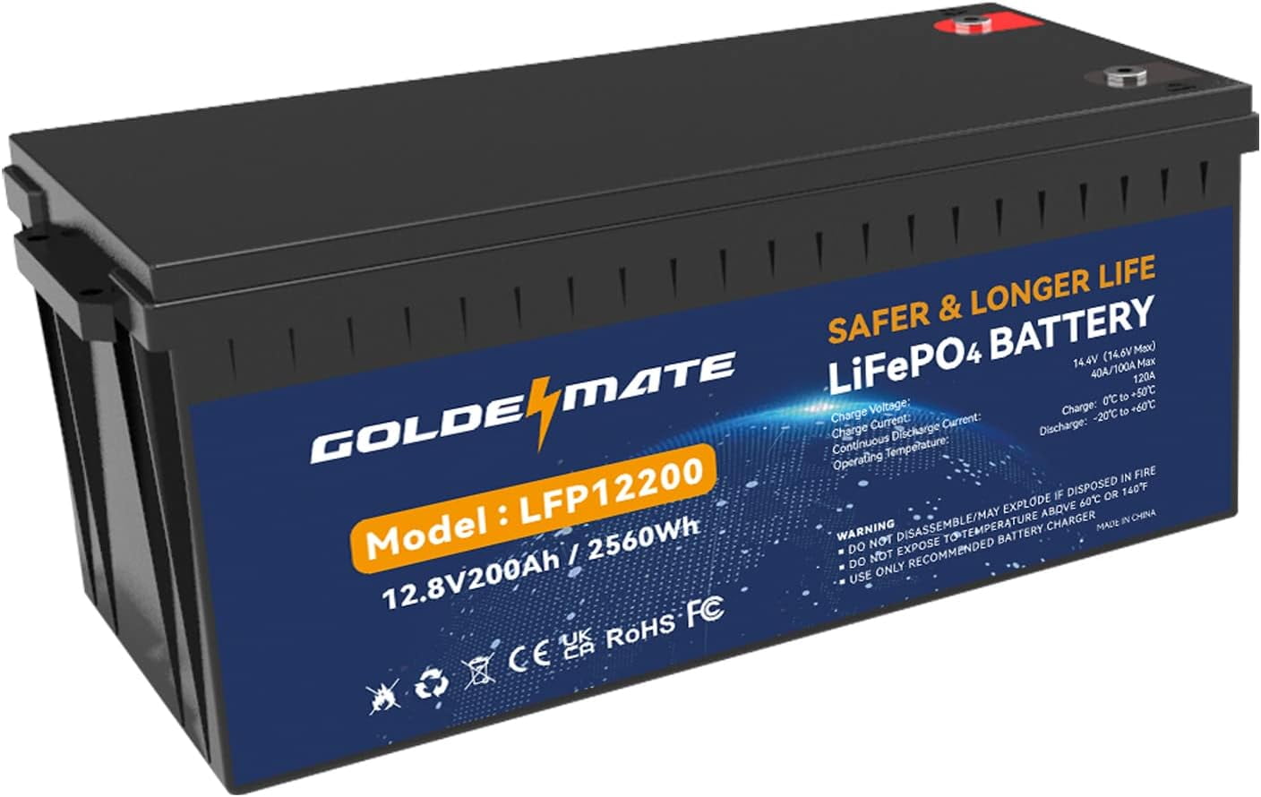 • [100% Protection] Goldenmate LiFePO4 battery comes equipped with a BMS that ensures completed protection against overcharging, over-discharge, over-current, overheating, and short-circuiting. Additionally, the battery boasts an exceptional self-discharge rate, enabling up to 1 year of storage without the need for maintenance after being fully charged. Also, the high & low-temperature protection can prevent the battery from being used when the temperature is too high or too low.