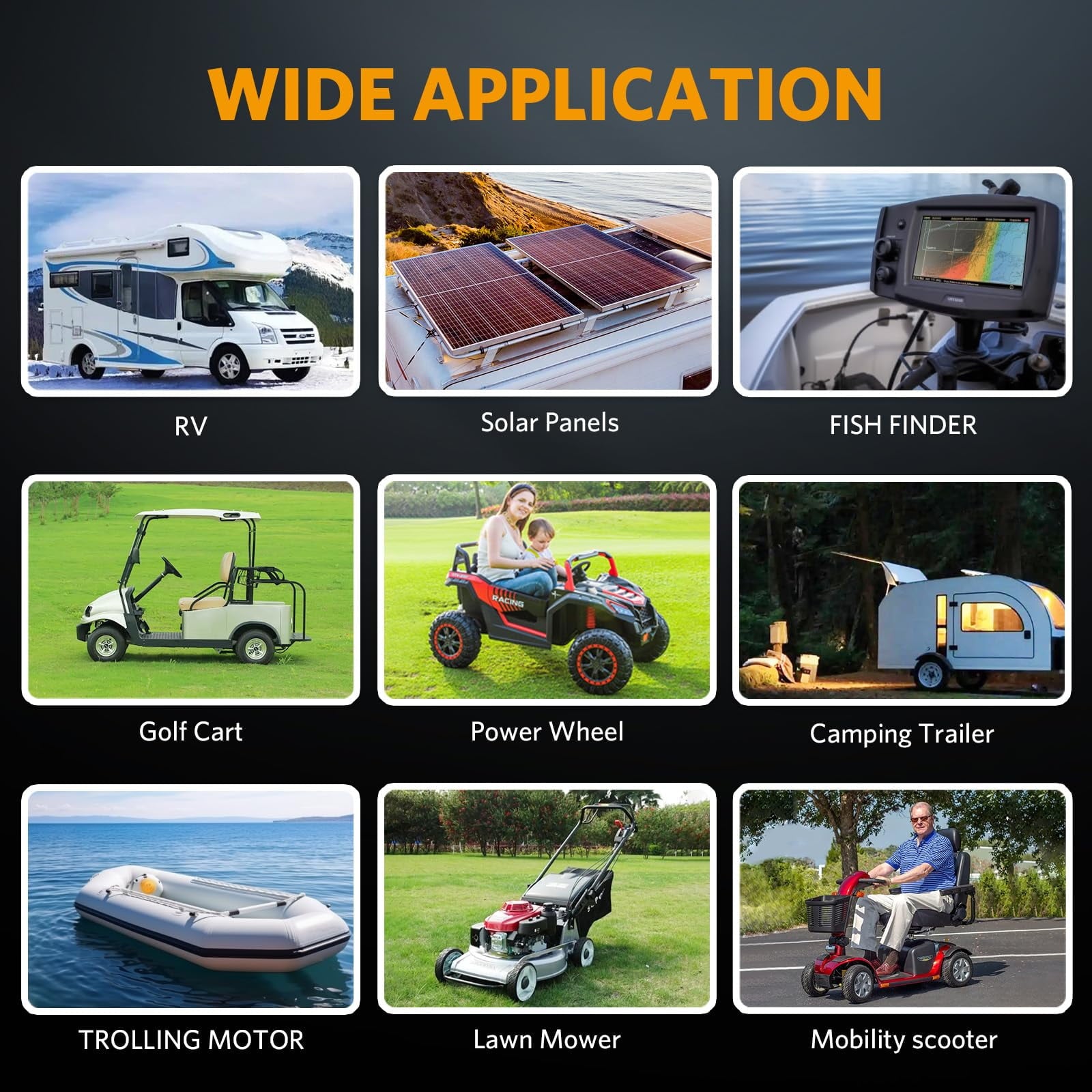 • [Wide Applications] Thanks to its remarkable energy density, prolonged cycle life, and exceptional performance, the 12v lifepo4 battery is widely applicable in various fields, including wheelchairs, emergency lighting, RV/outdoor camping, marine, golf carts, trolling motor, home energy storage, computer power backup, off-grid applications, solar panel wind energy storage solutions, among others.