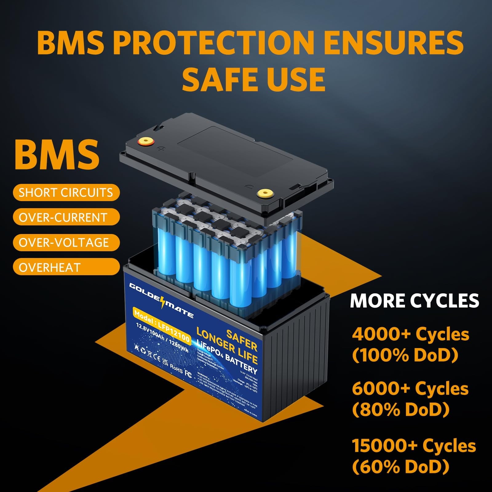 12V 100Ah LiFePO4 Lithium Battery, 100A BMS, 15000+ Deep Cycles, GOLDENMATE Battery for RV, Solar, Marine, Trolling Motor, Golf Carts, Backup Power