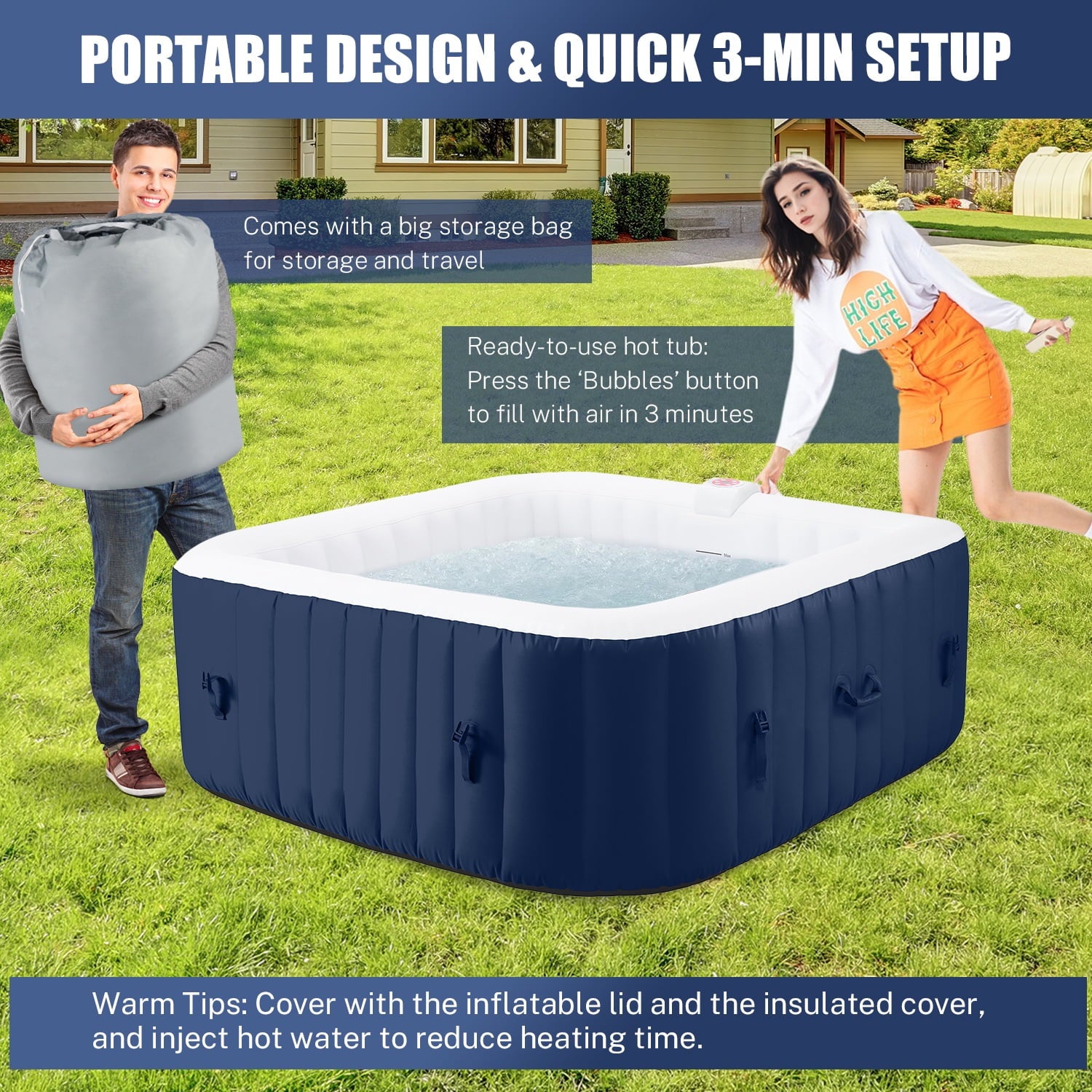 - ♨️【Portable & Quick Setup】: Requiring a mere 3-minute setup, this hot tub has side handles for easy moving. Using the included zip ties and storage bag, your family can enjoy the hot spring spa experience anytime, anywhere!