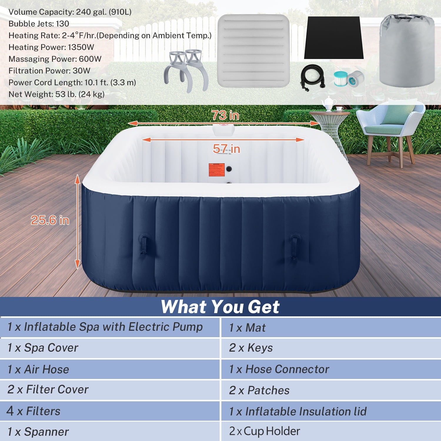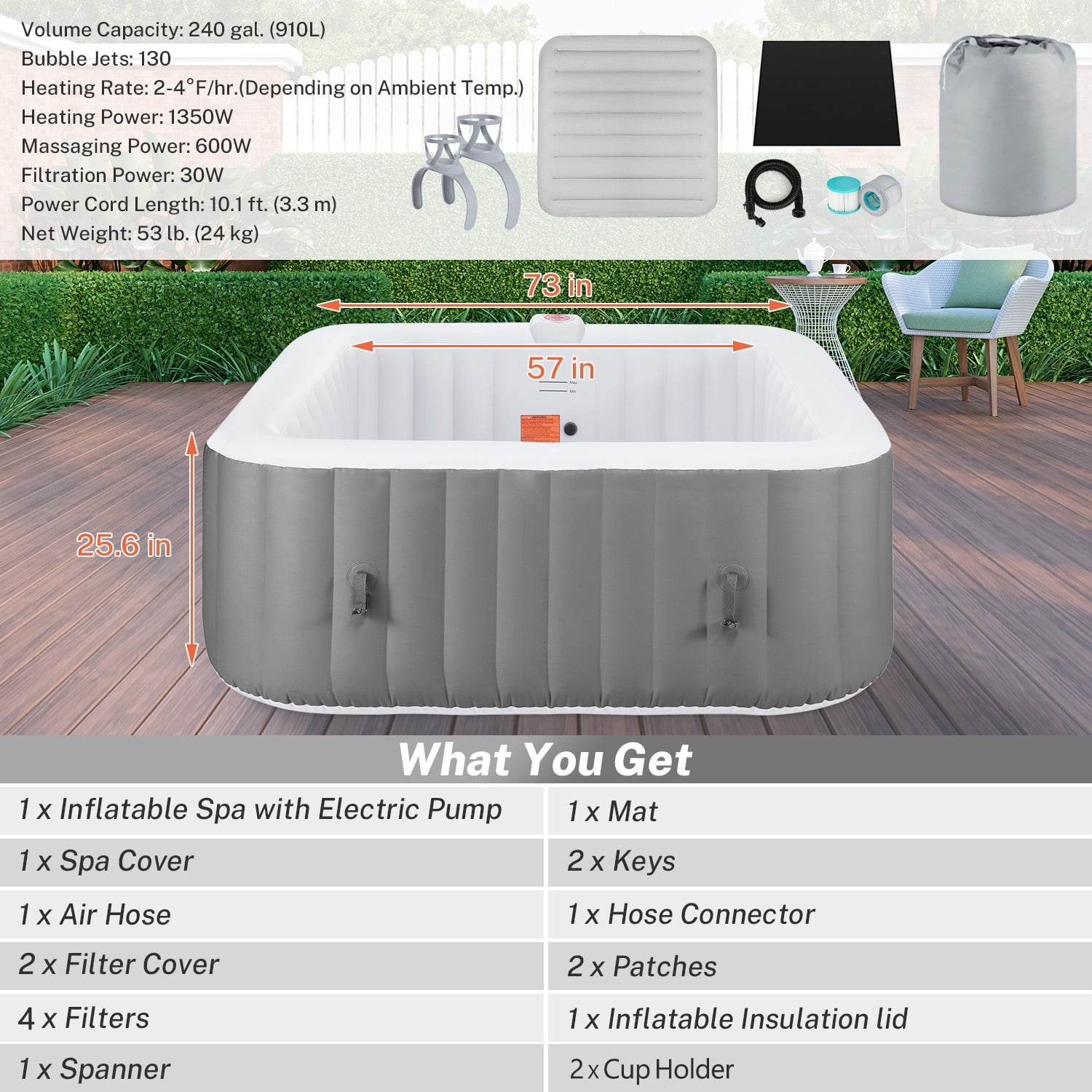 1. Large size family spa: 73” x 73” square 240gal for 4-6 people.