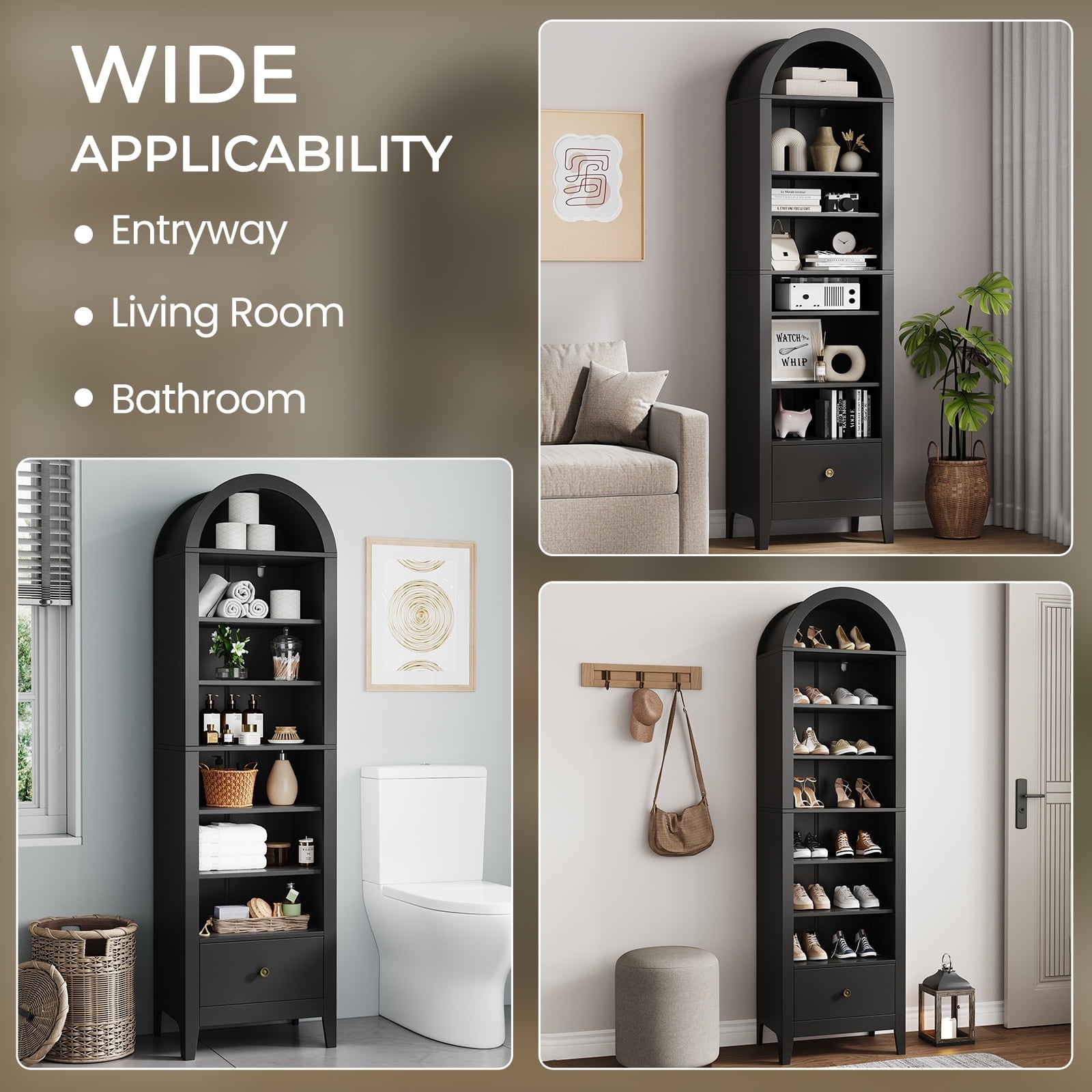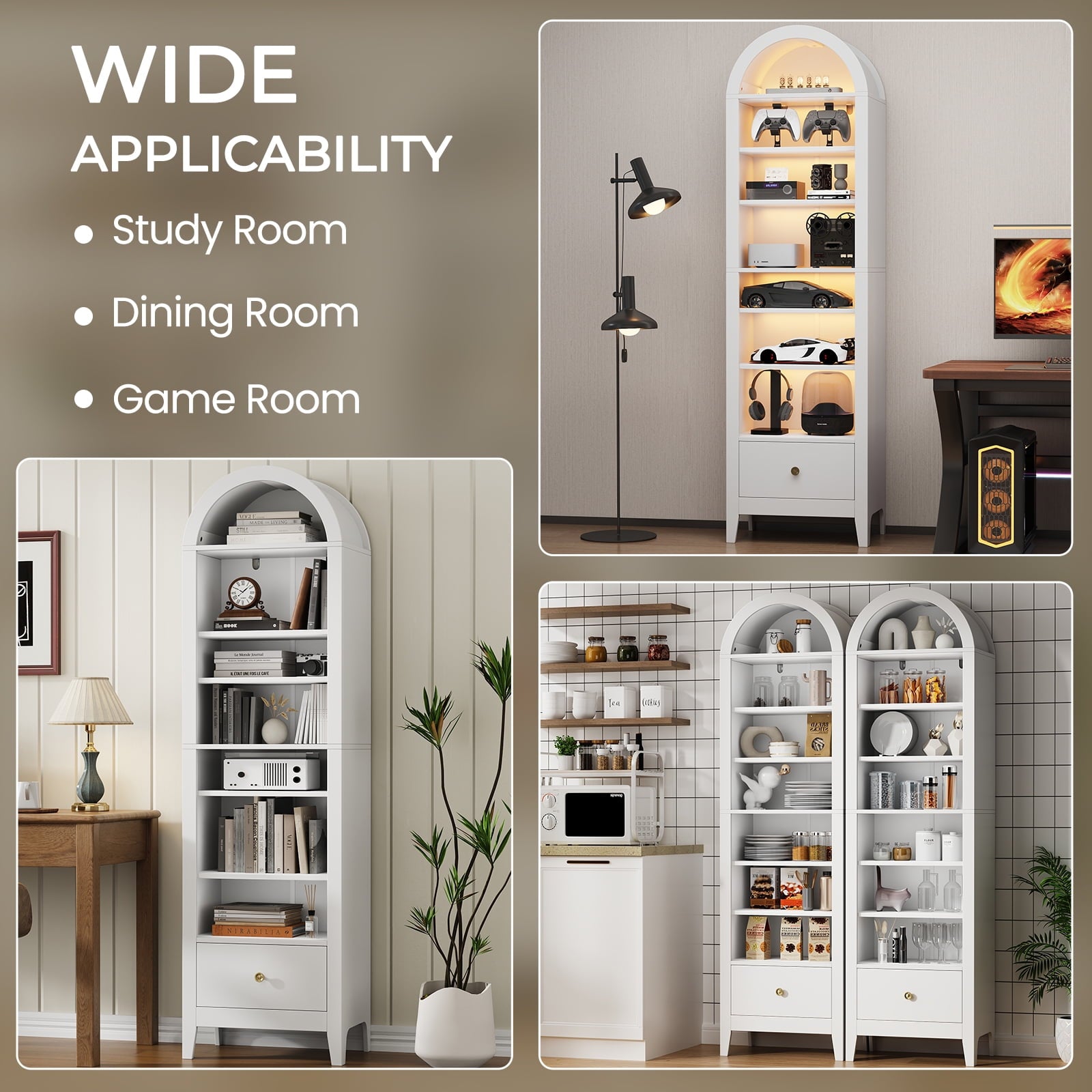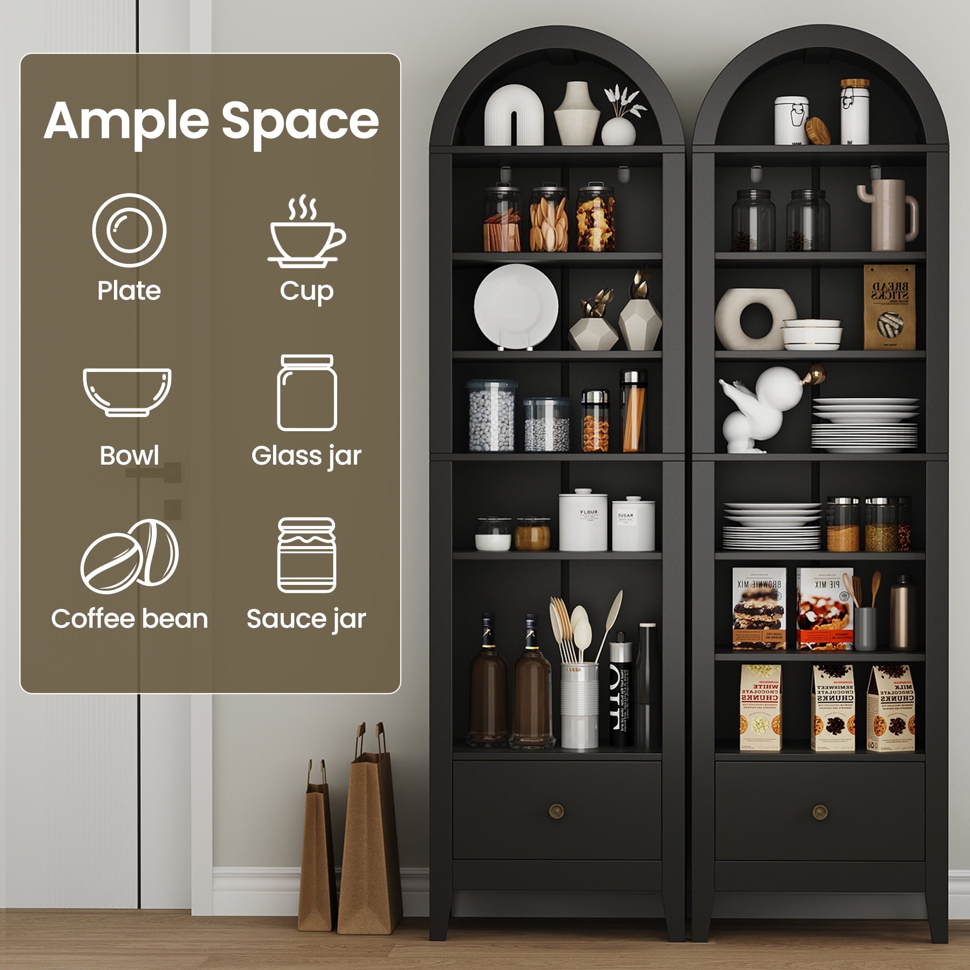 - 🌟Widely used: This arched display cabinet can not only be used as a storage rack, but also as a bookshelf, antique cabinet, shoe rack, filing cabinet, pantry, etc. Perfect for your living room, game room, kitchen, dining room, or any other space. Make your space look well-organized.