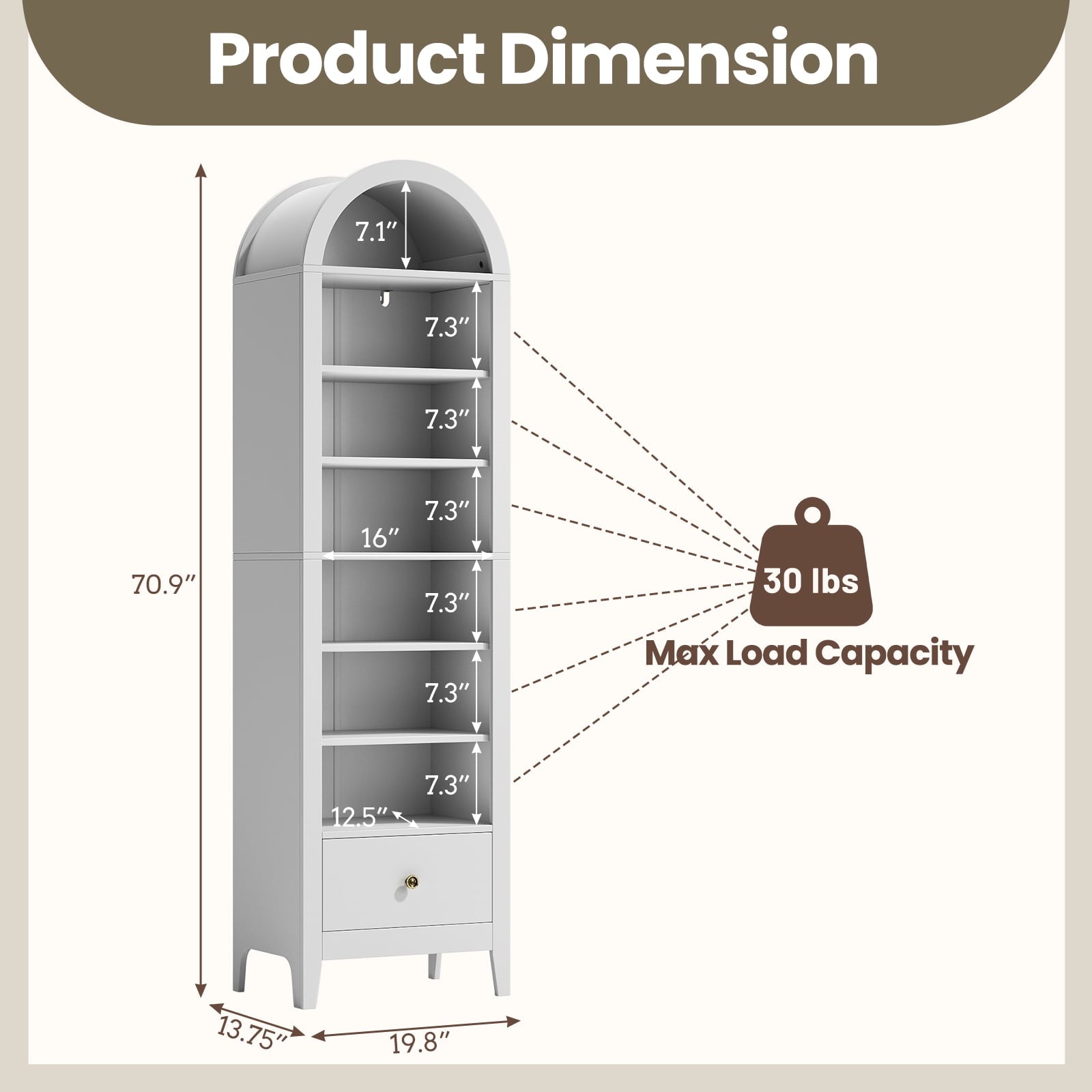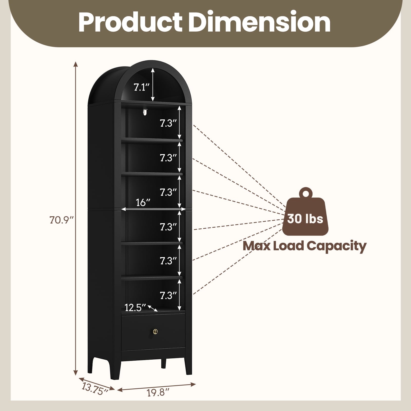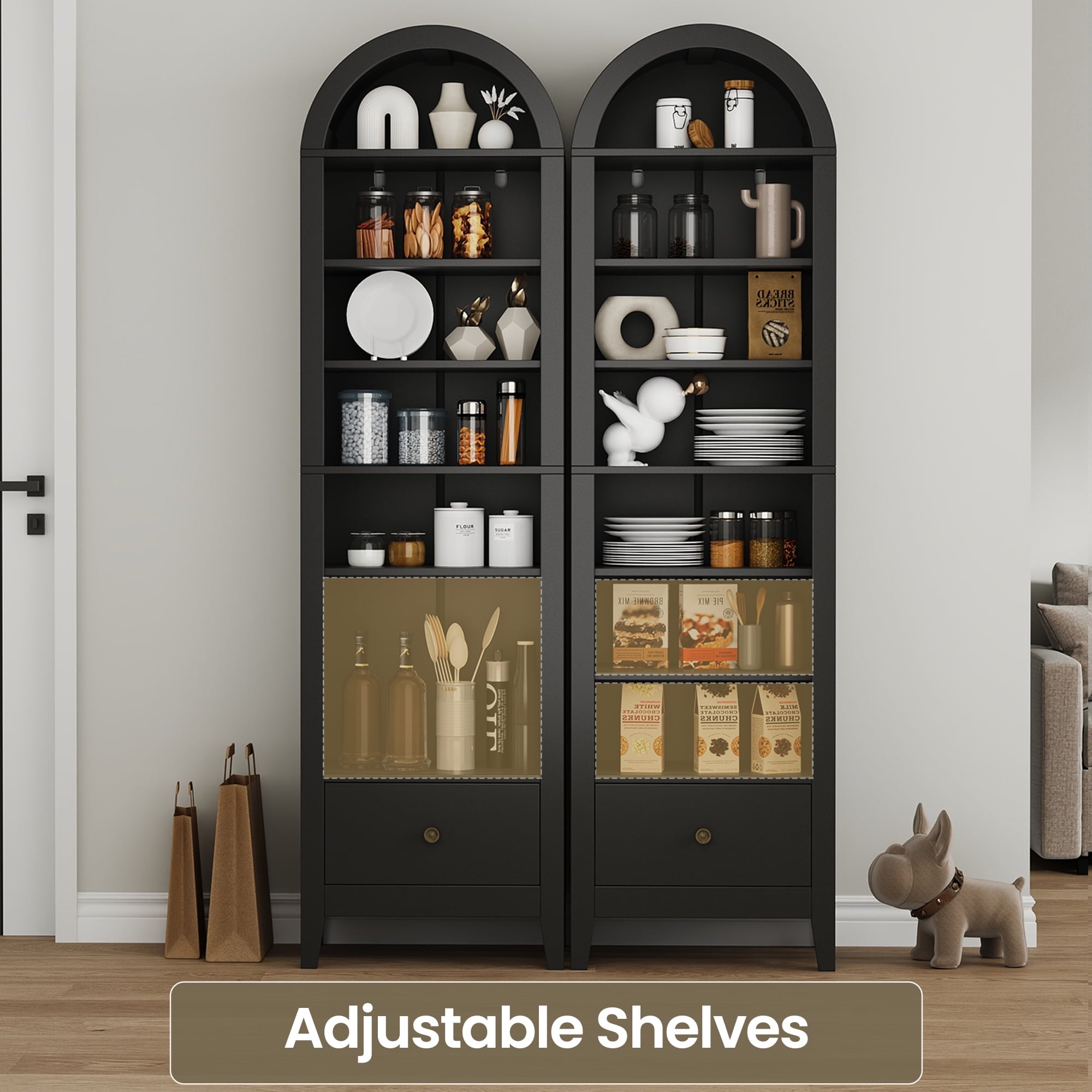 Arched storage cabinet is 70.9 inches high, with well-designed dimensions and a load-bearing capacity of up to 30 pounds per layer. It has ample multi-level space to store various types of items. The shelves of this arched cabinet can also be adjusted to meet your different needs. The curved dome design is unique, and the classic appearance is versatile. Suitable for various scenarios such as lobbies, living rooms, bathrooms, study rooms, dining rooms, game rooms, etc., it easily meets your storage needs and adds cleanliness and beauty to your home.