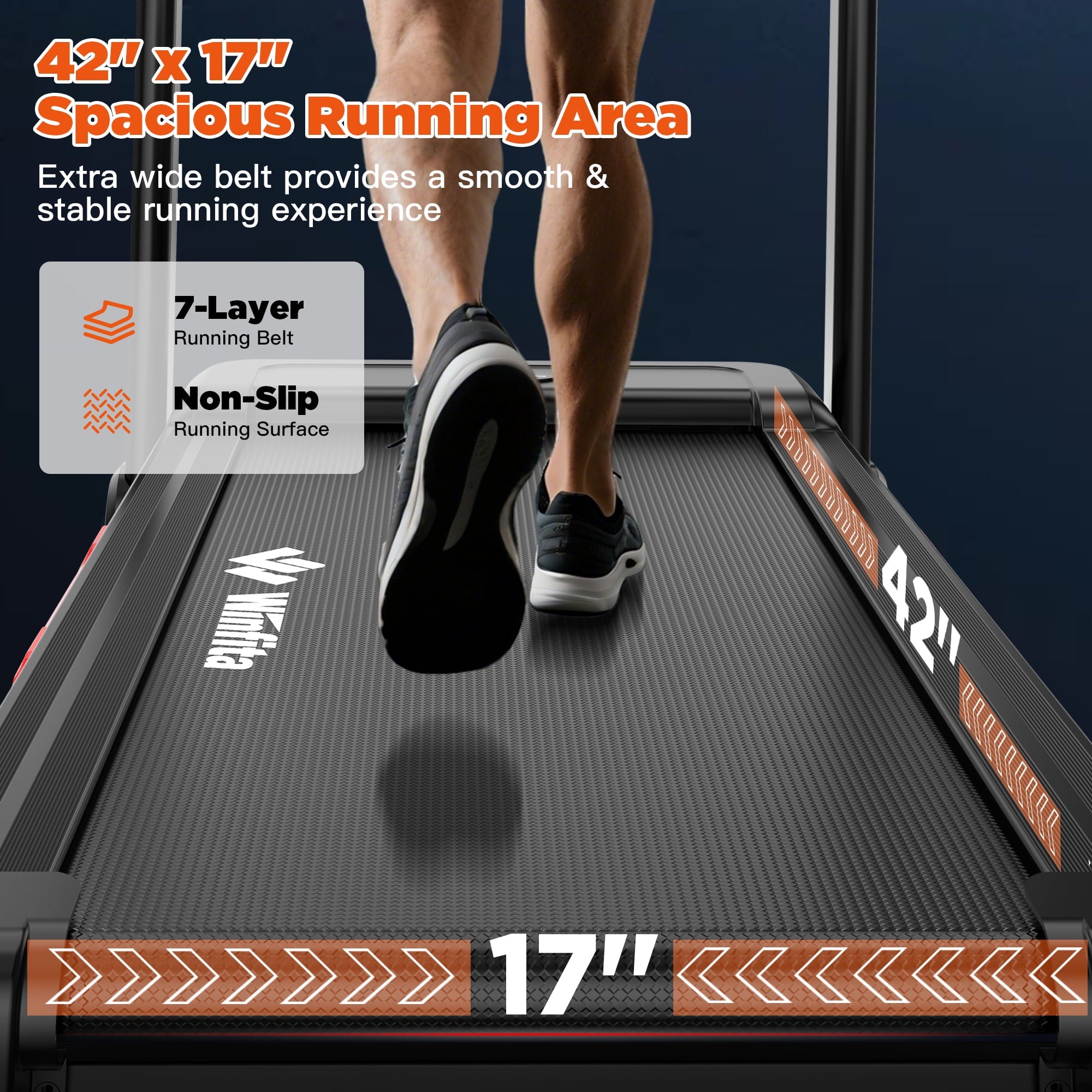 Running Area Size: Spacious 17” x 42” (Width X Length) running area for a comfortable stride.
