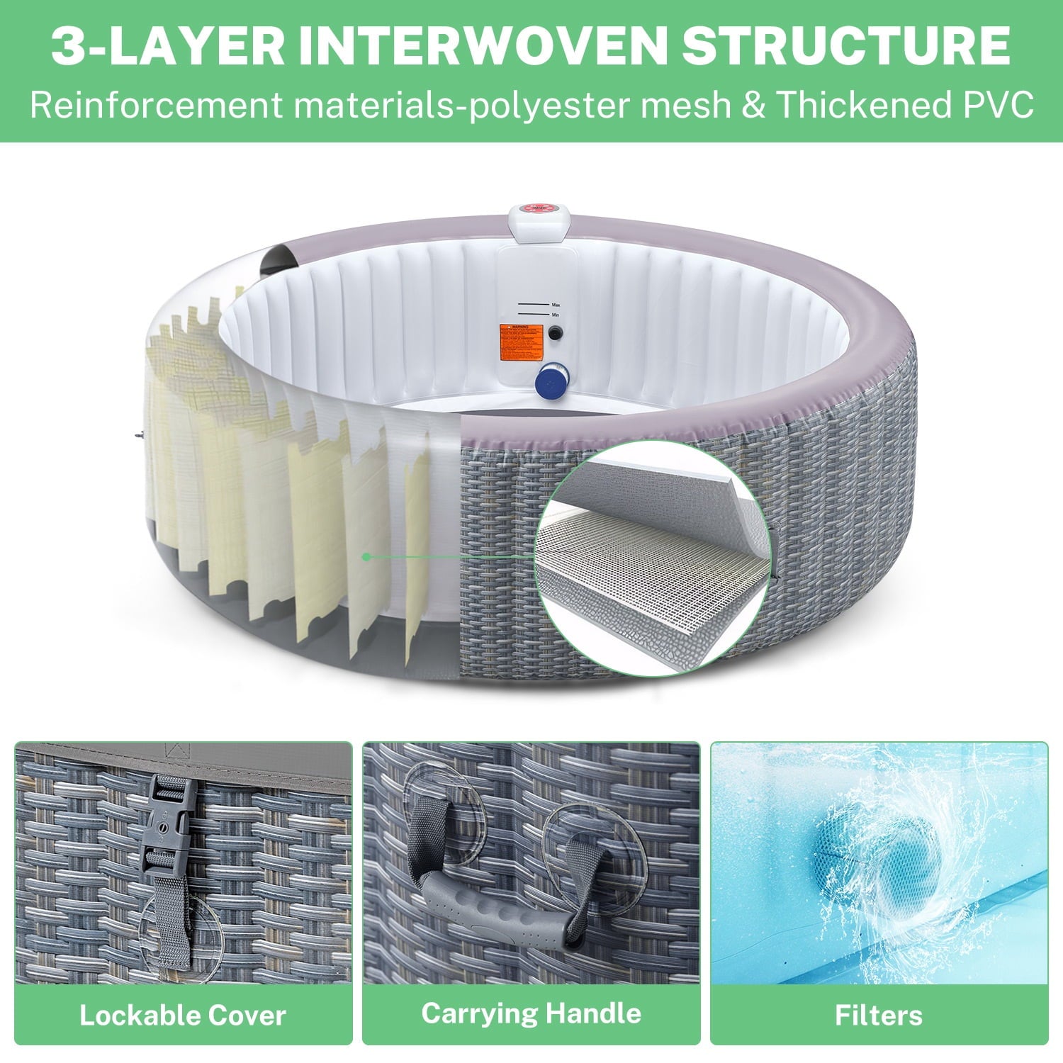 - ♨️【Portable & Quick Setup】: Requiring a mere 3-minute setup, this hot tub has side handles for easy moving. Using the included zip ties and storage bag, your family can enjoy the hot spring spa experience anytime, anywhere!
