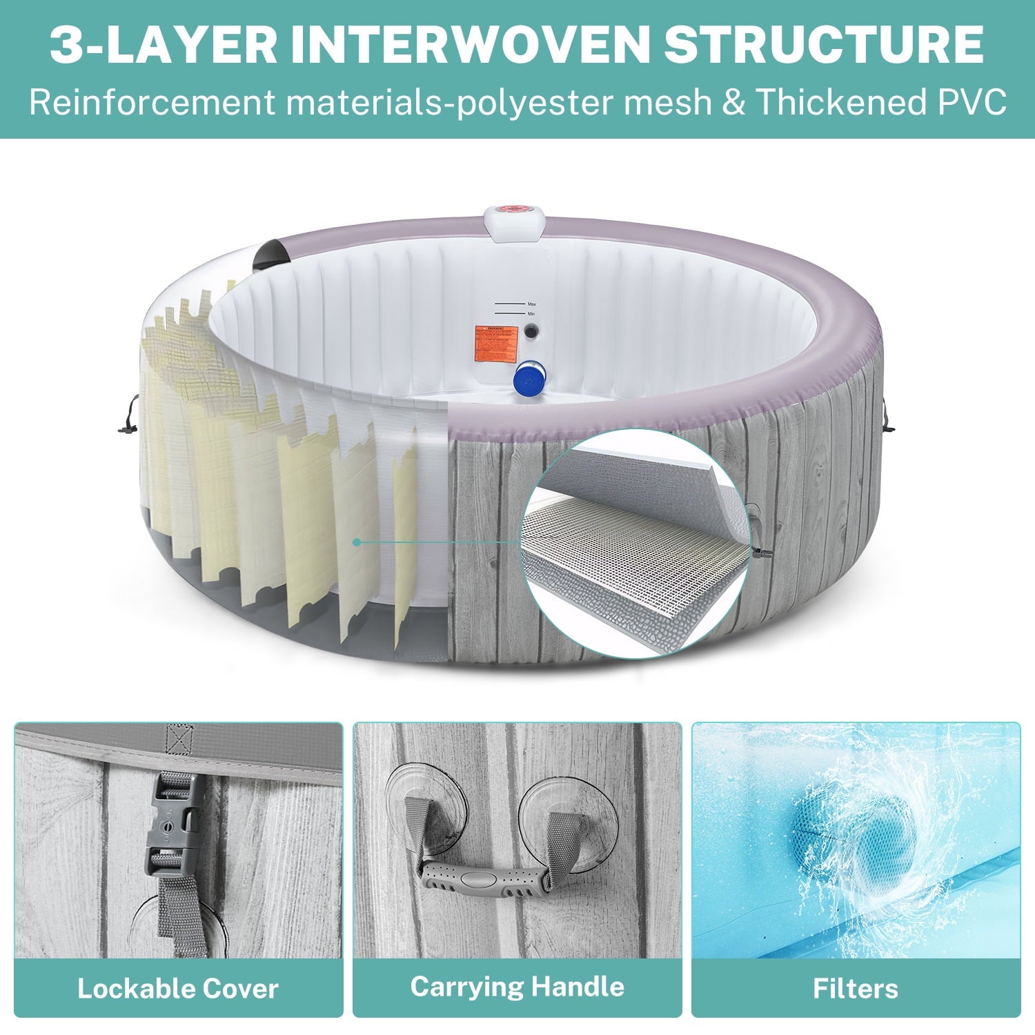 - ♨️【Year-Round Spa】: An anti-freeze automatic heating feature safeguards internal components from freezing, allowing year-round use of the inflatable spa even in cooler temperatures (above 40℉) in the fall or winter. Its durable laminated PVC inflatable wall ensures outstanding longevity and comfort. Recommended for use on flat ground (patio, poolside, deck, backyard, etc.), the included mat protects the hot tub bottom.