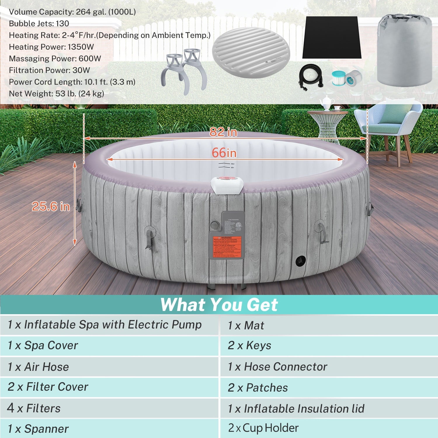 1. Large size family spa: 82Dia round 264gal for 6-8 people.