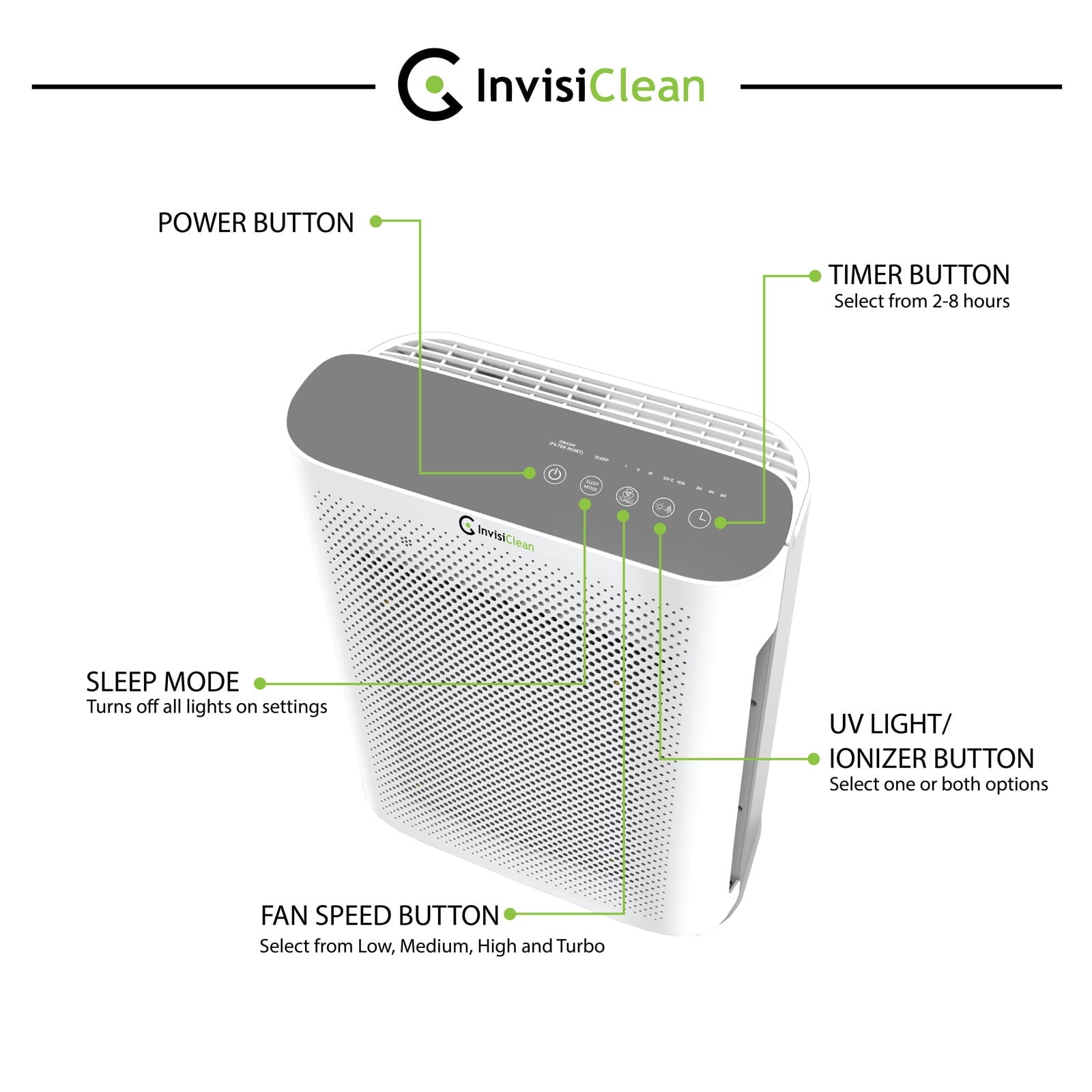 Your InvisiClean Aura Air Purifier also offers other features that boost its power and practicality such as filter change indicator, auto timer shutoff (2, 4, 8 hours), sleep mode (turns off all lights while running), and independent UV light and ionizer controls.