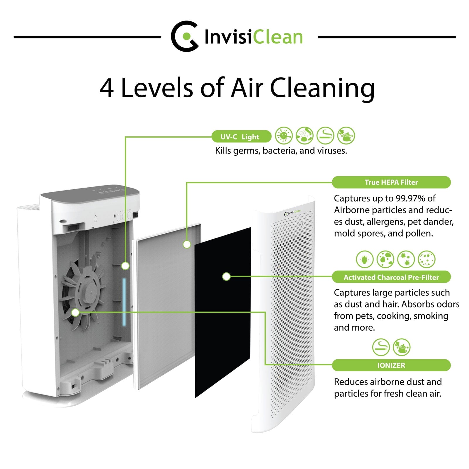 - Powerful 4 in 1 Cleaning Action: InvisiClean Aura II Air Purifiers for bedroom filters and removes bacteria, odors, smoke, and other common household allergens. Our air cleaners for home eliminate common allergy triggers, including dust, pollen, and pet dander, so that you can breathe better air.