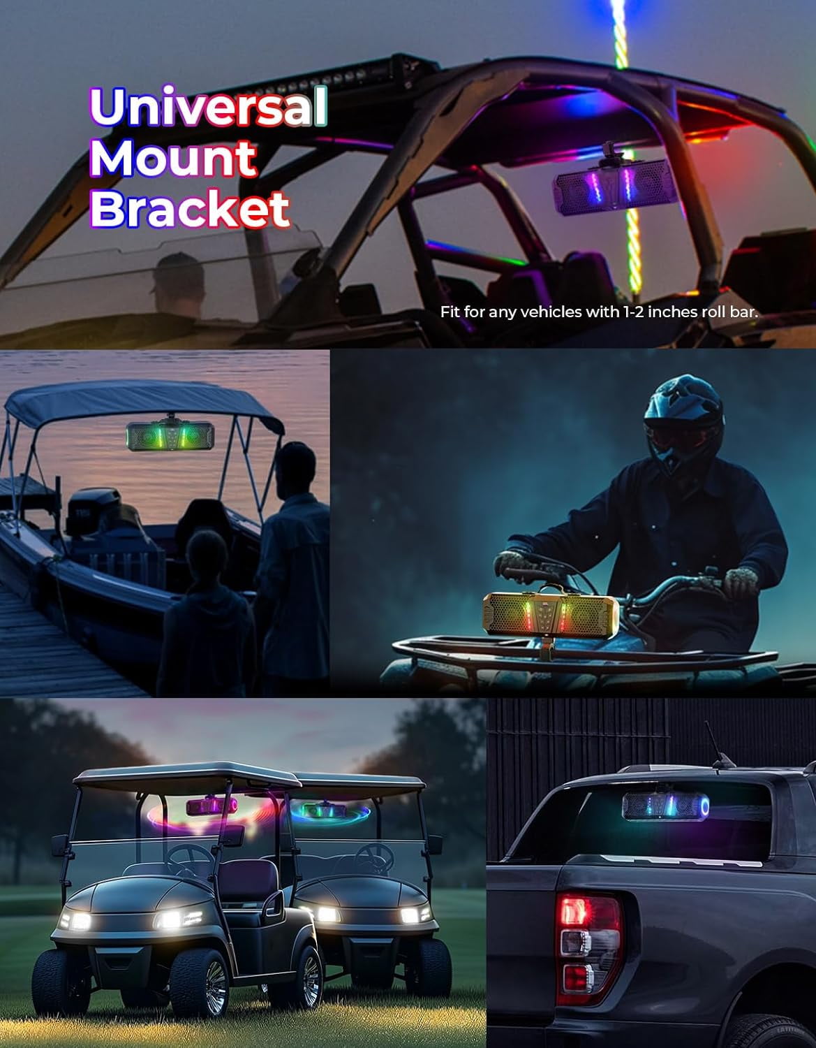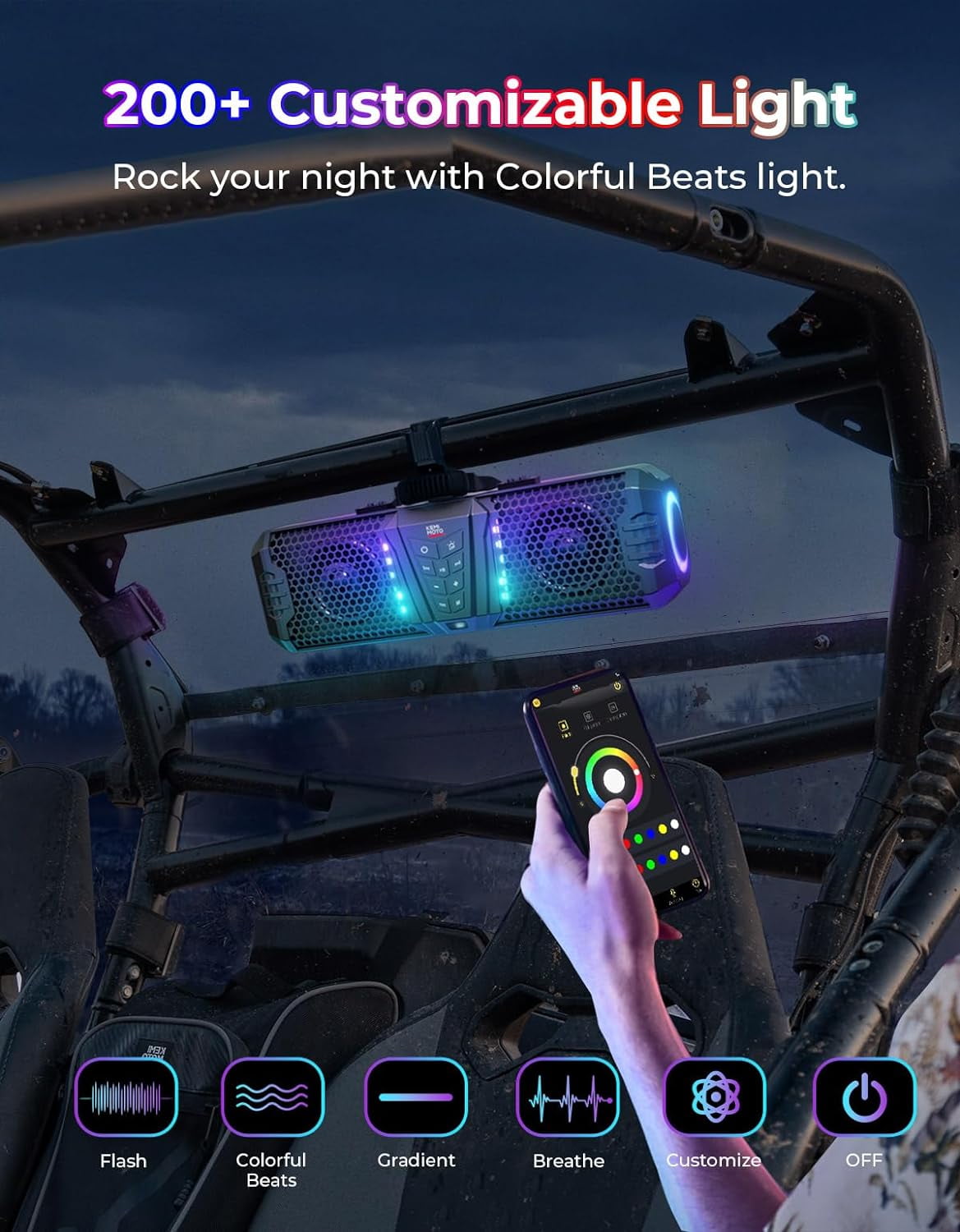 • 200+ Lighting Modes: KEMIMOTO Midnight 40B UTV sound bar features a 5-side ambient ARGB light with 200+ lighting modes (iRISBeat music sync, fade, flash, jump, solid, or OFF etc.) via APP. In Colorful Beats Mode, the LED lights synchronize with music beats, creating a lively and dynamic ambiance for parties and rides. Plus, in low-light conditions, you can turn on the all-white reading light in DOME Mode to read maps, or manuals to enhance the visibility.