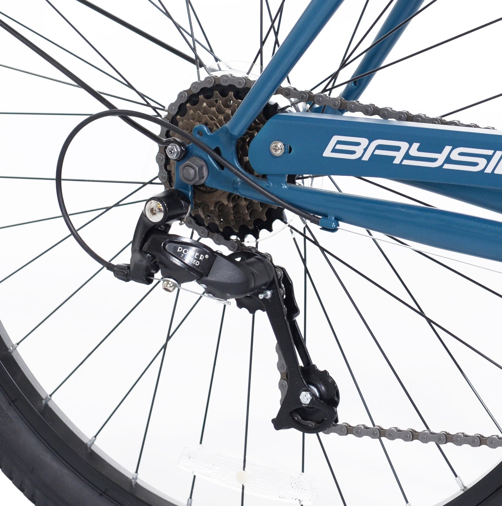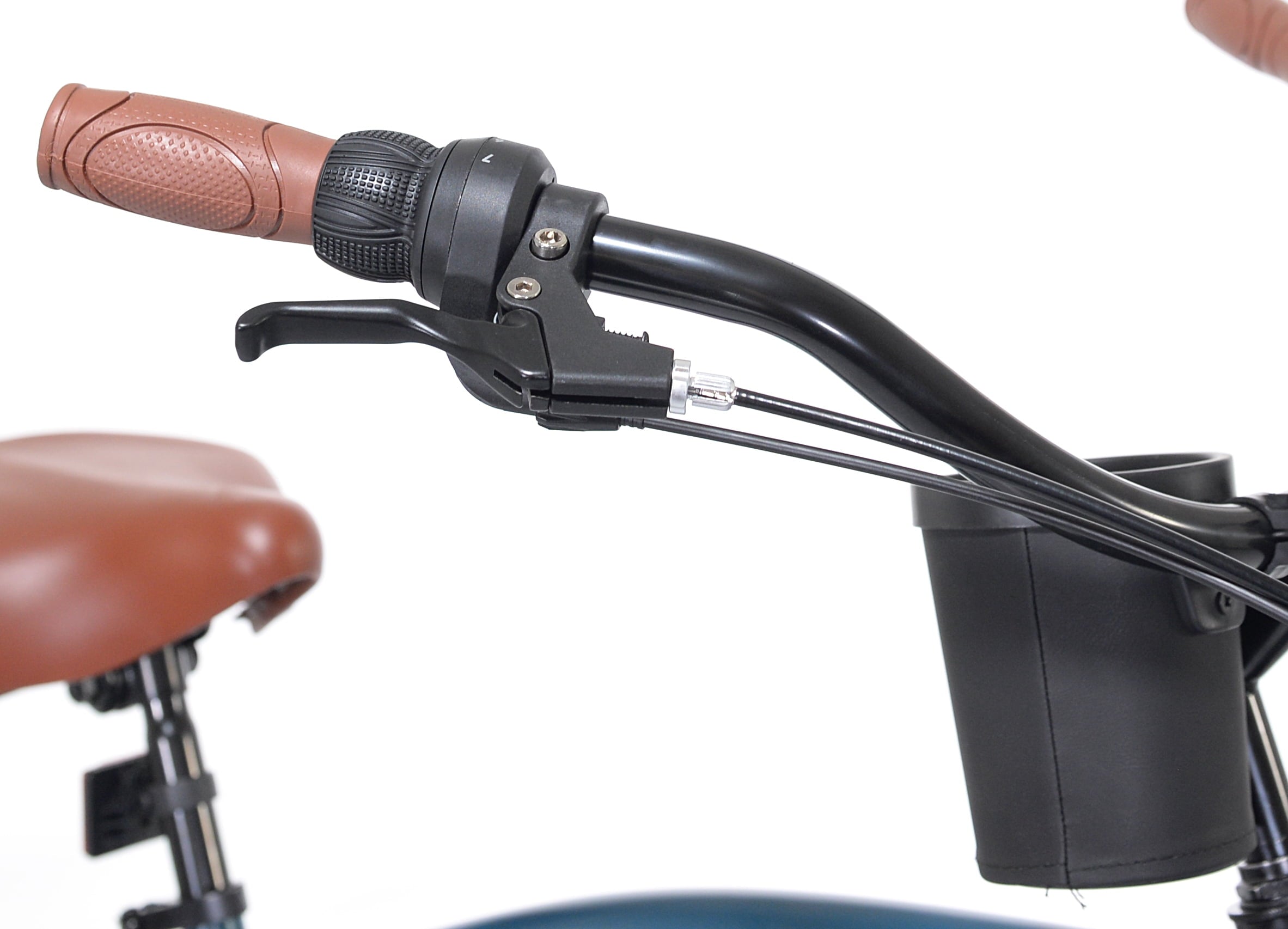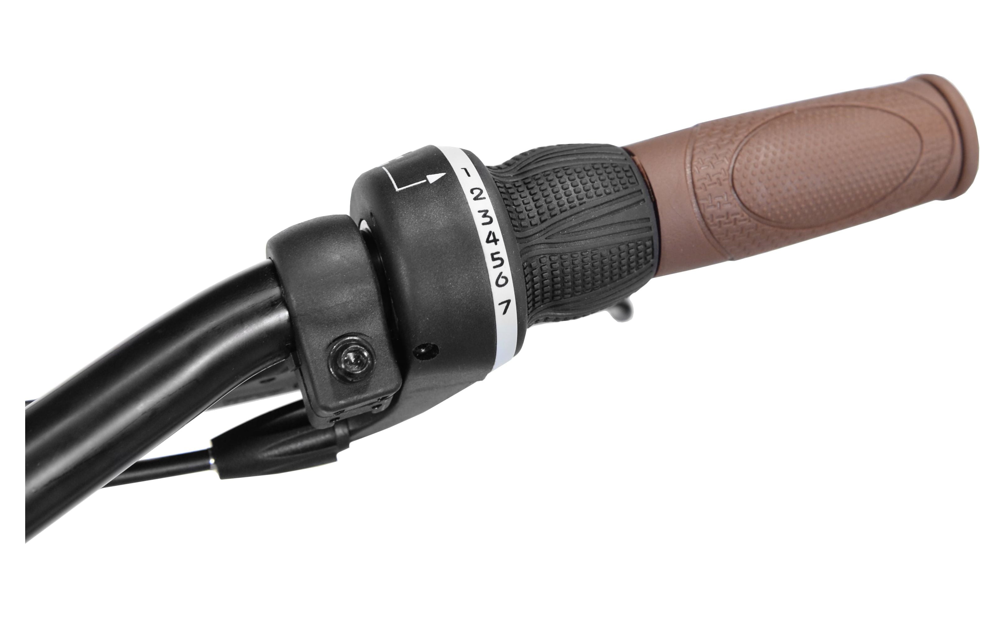 - 7-speed drivetrain with easy twist shifters and Shimano rear derailleur