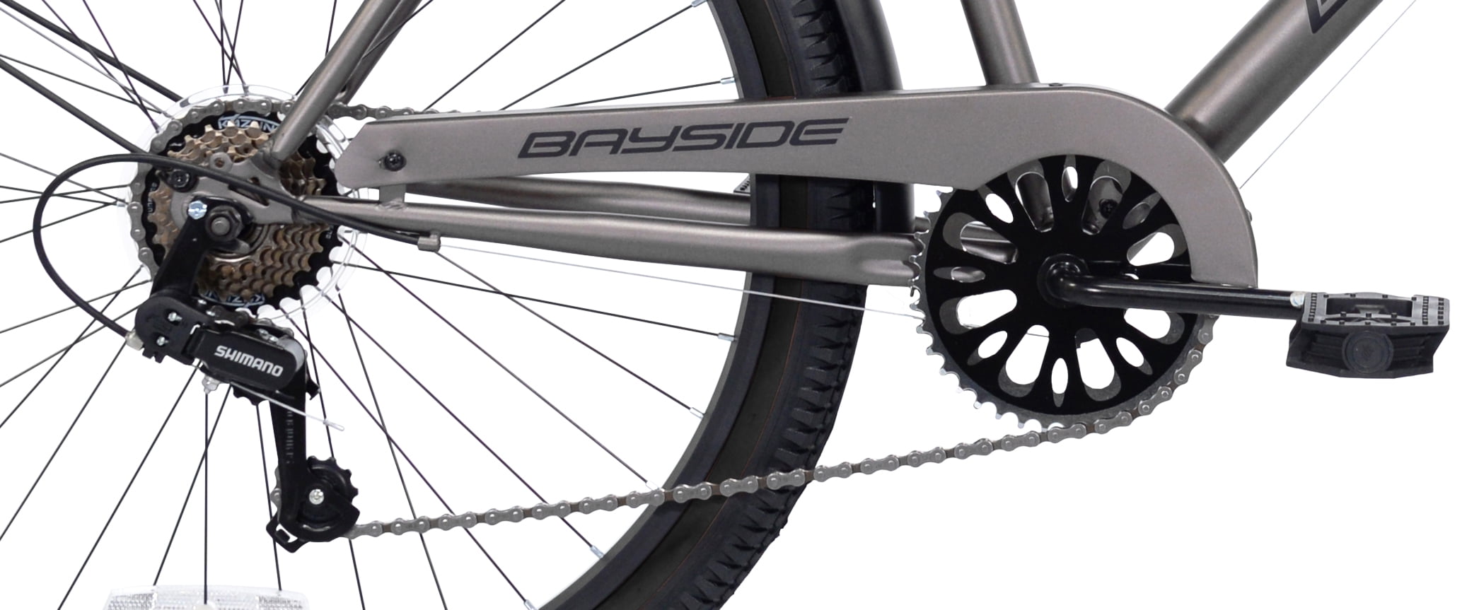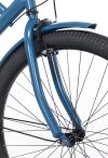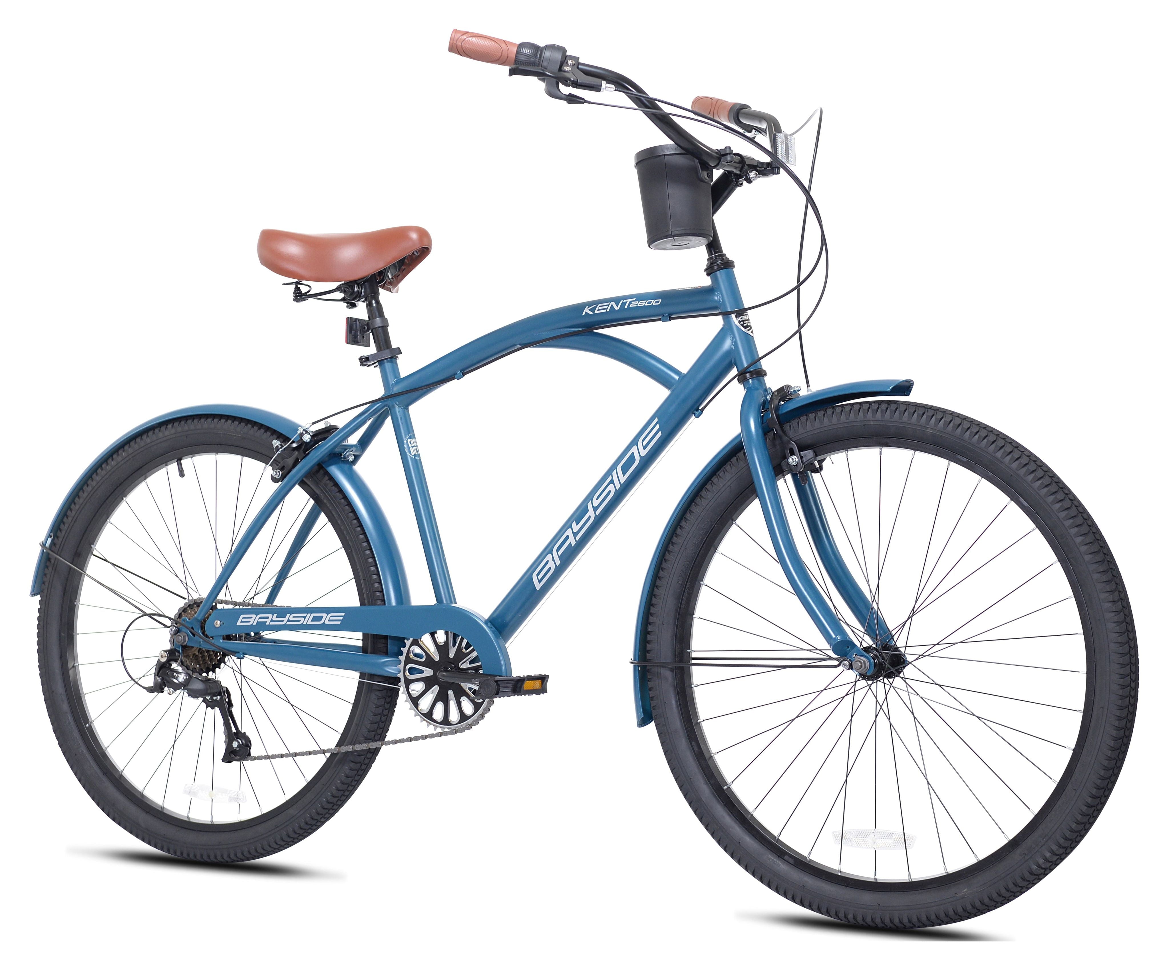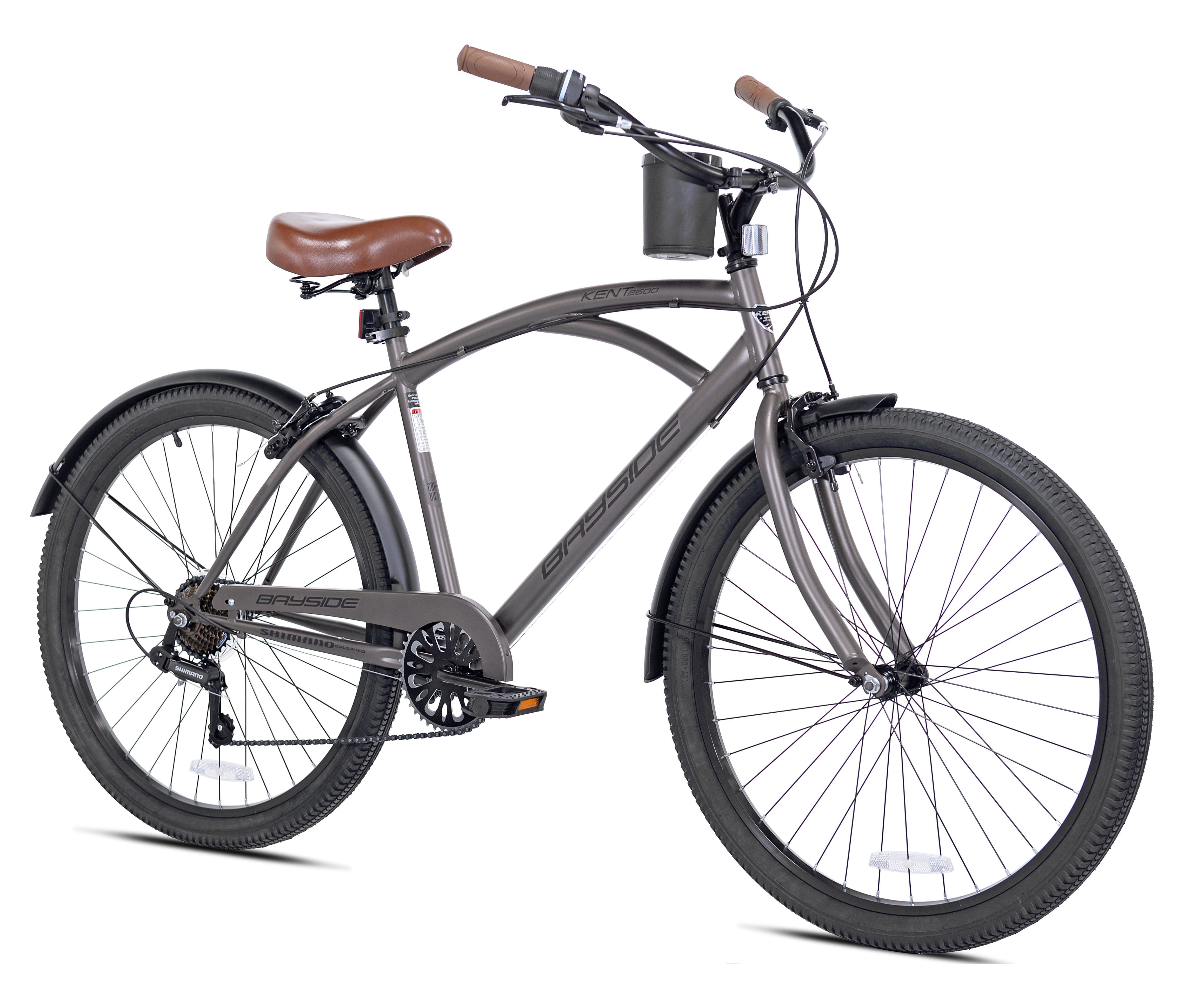 The Kent bayside adult cruiser bike is a hot rod cruiser that looks fast while it’s standing still. It features a flat black cantilevered steel frame, sweet black rims, fenders, and swept-back handlebars. This bike also has a brown seat and brown grips to add to the classic style. It has a seven-speed drivetrain with an easy twist shifter and a Shimano rear derailleur. The front and rear alloy side pull handbrakes on this men’s 26″ bike keep it under control, while the comfy springer style saddle is ideal for longer adventures. The seat height is quickly adjusted with no tools, courtesy of the quick-release seat post clamp.