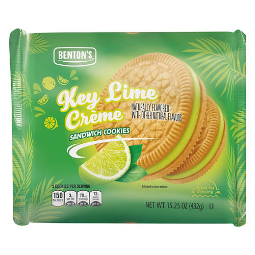Put a fruity twist on your favorite dessert with Benton’s Key Lime Sandwich Crèmes. Each treat features sweet key lime crème sandwiched between two crispy cookies. Try dunking yours in a cold glass of milk for a tasty and refreshing summertime treat!