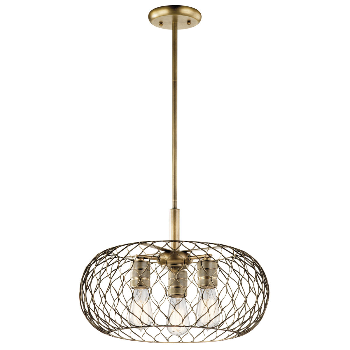 Kichler Lighting-43958NBR-Collection: Devin, Material: Steel, Finish Color: Natural Brass, Width: 18″, Height: 12.75″, Chain Length: 36″, Lamping Type: Incandescent, Number Of Bulbs: 3, Wattage: 100 Watts, Moisture Rating: Dry Rated, Desc: This 3 light mini pendant from the Devin collection features a vintage industrial design with an open cage with tumbled Natural Brass and Olde Bronze.,-Devin – 3 Light Pendant In Vintage Industrial Style-12.75 Inches Tall and 18 Inches Wide