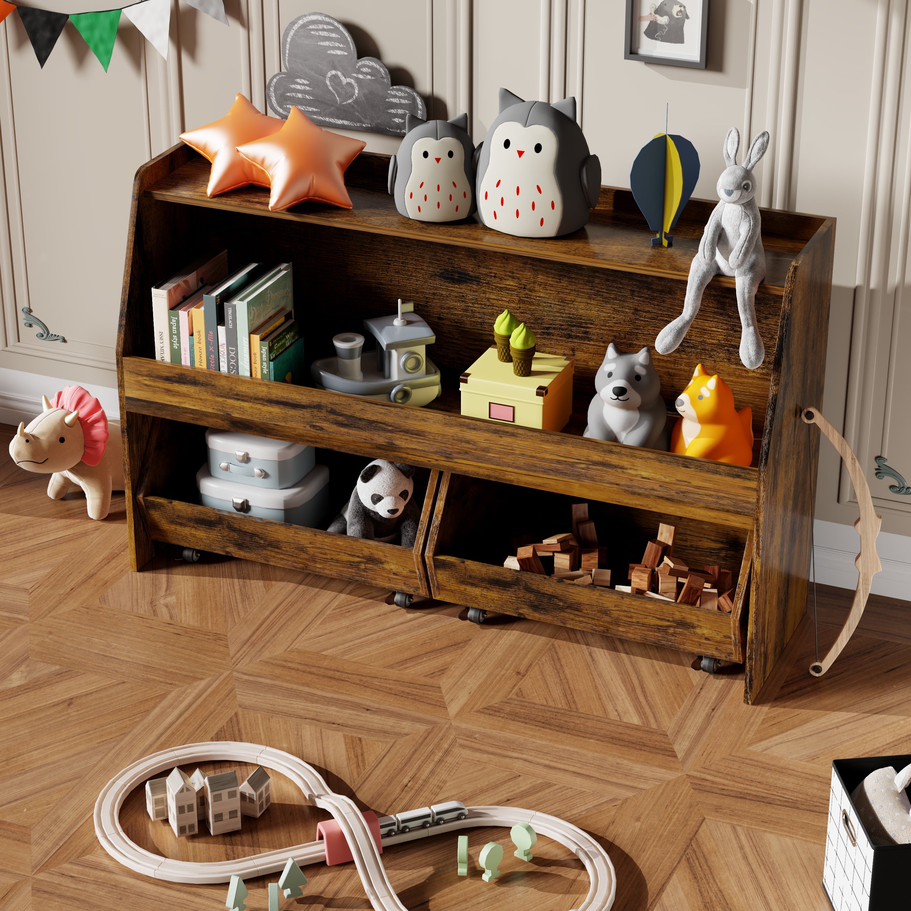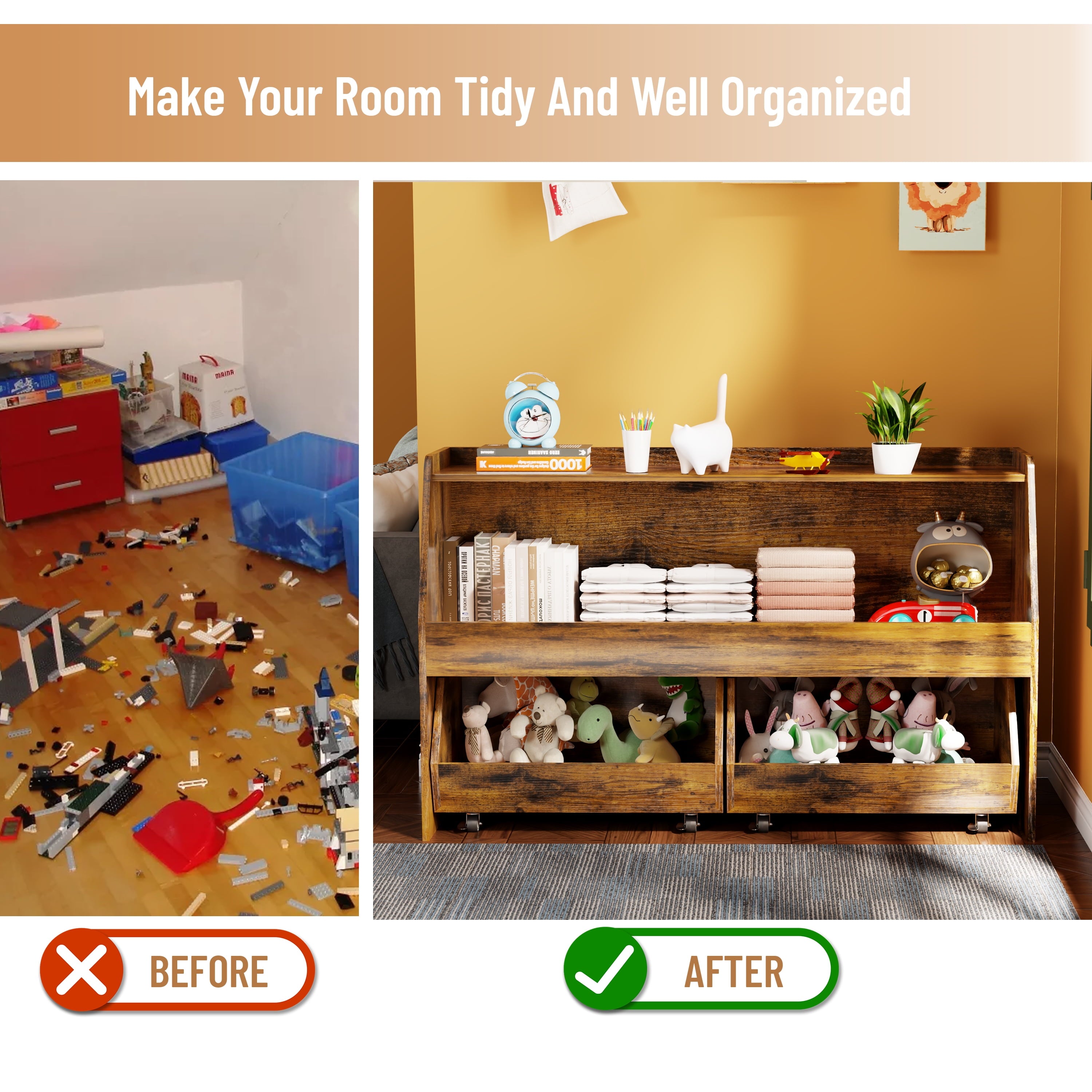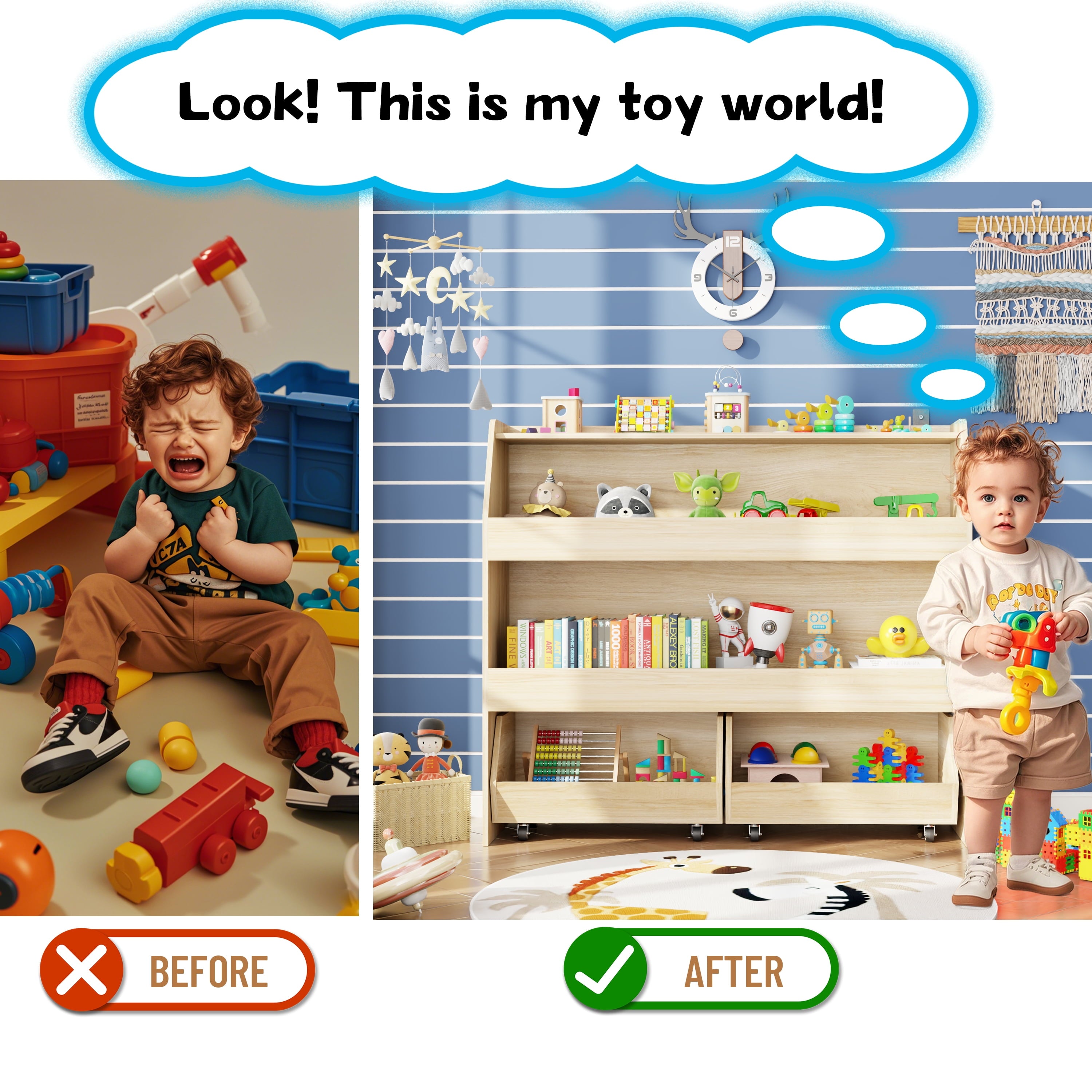 🧶 【WITH MOVABLE DRAWERS TOY SHELF】 – Make organizing a breeze! The drawers slide smoothly and easily, allowing your child to access their favorite toys and books with ease. They can even help with putting things away, fostering a sense of responsibility and independence.