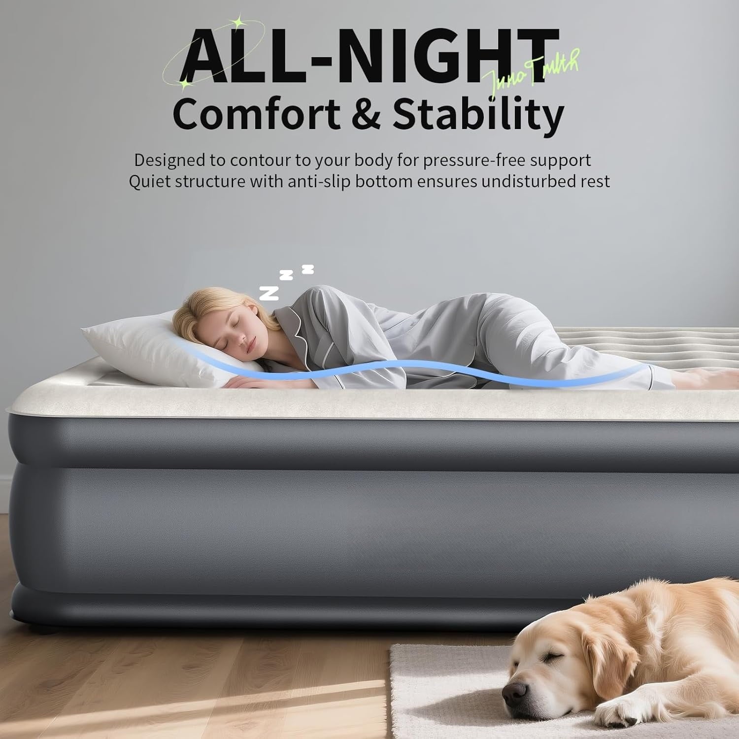 - 𝐏𝐫𝐞𝐦𝐢𝐮𝐦-𝐆𝐫𝐚𝐝𝐞 𝐌𝐚𝐭𝐞𝐫𝐢𝐚𝐥𝐬: Made with 10% thicker, upgraded PVC, the airbed provides enhanced durability and reliable support.Its reinforced surface resists daily wear and tear, while the quiet, non-slip base keeps the mattress securely in place throughout the night