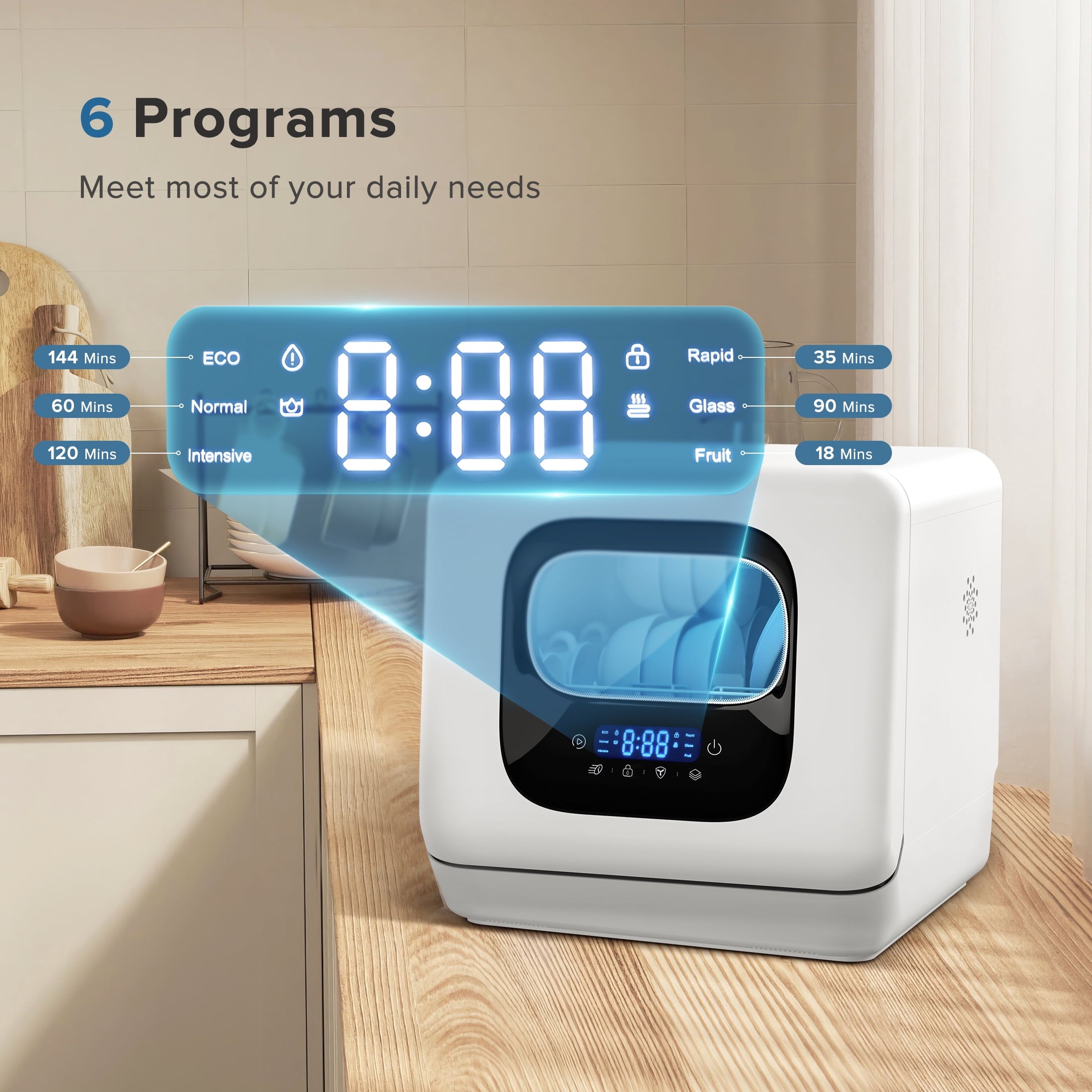 - The dishwasher has a total of 6 programs that you can choose from according to your needs, including Eco mode, Normal mode, Intensive mode, Rapid mode, Glass mode, Fruit mode.