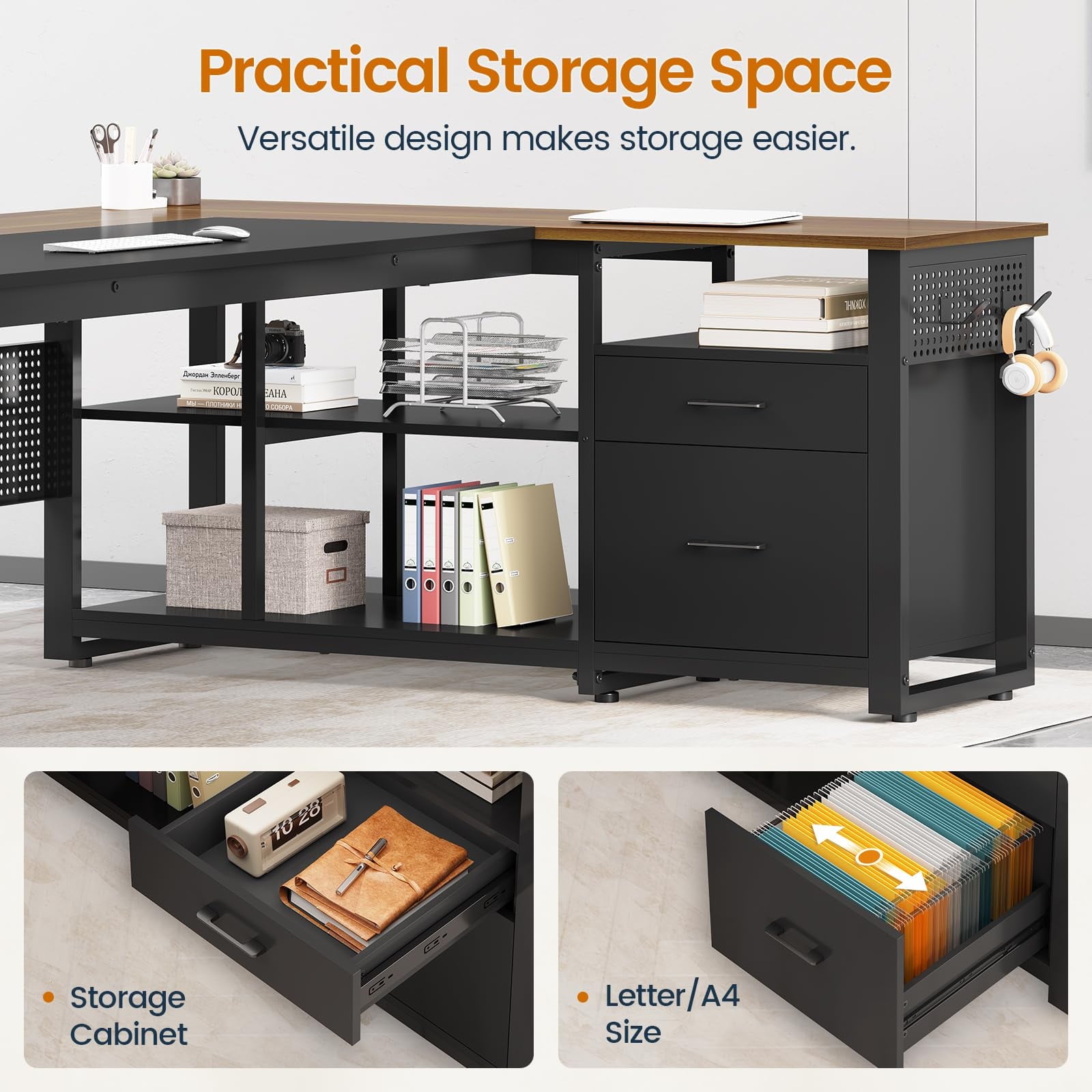 - 【Ample Storage Space】The decent layout L shaped computer desk provides a variety of storage space, including a storage cabinet, printer space, pegboard, storage shelves and hooks.