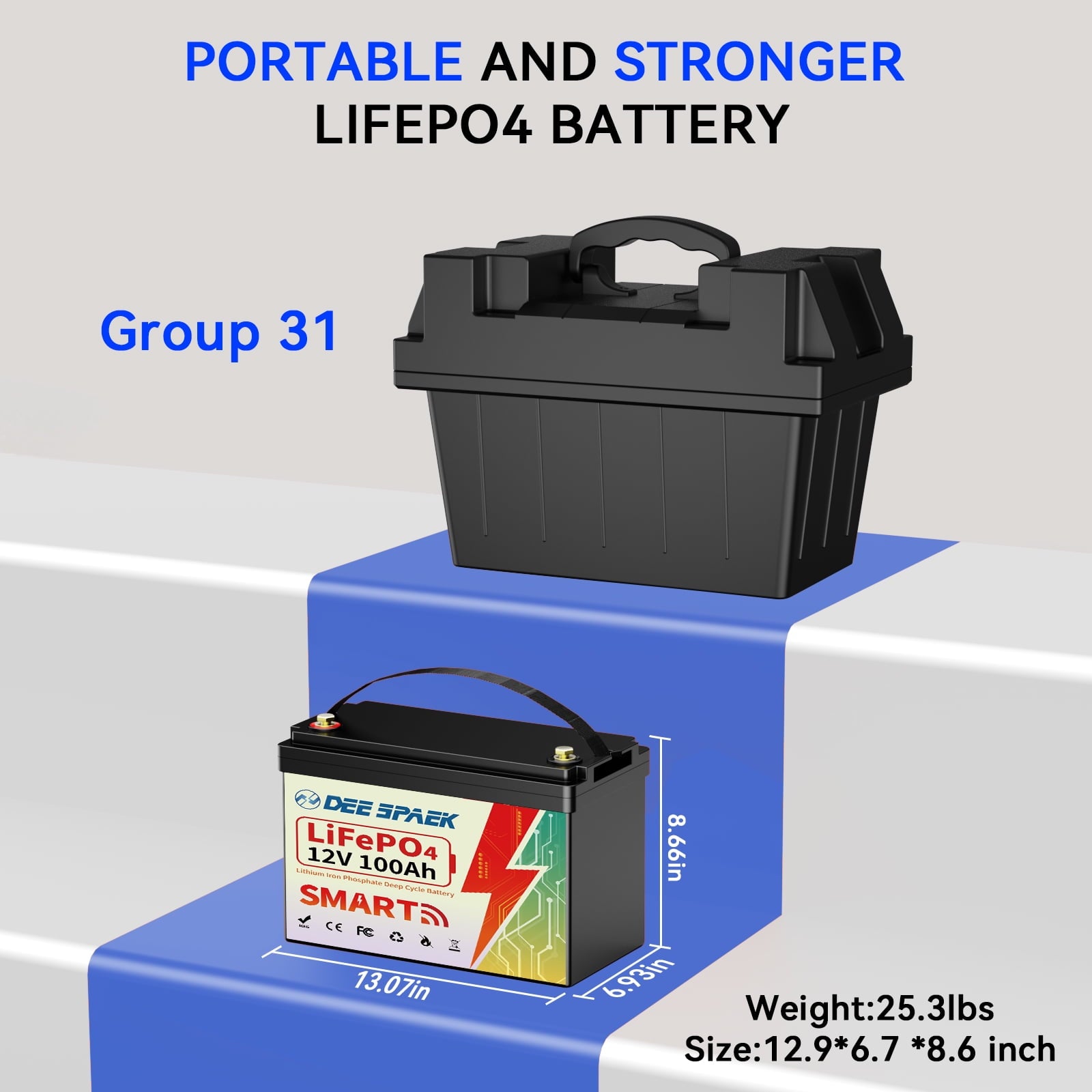Group 31 compact design, 332*176*220mm/13.07*6.9*8.7in,reduce the case size by 1/3 when compared to the standard 12.8V 100Ah lithium battery case. More adaptable in terms of battery system installation & application.