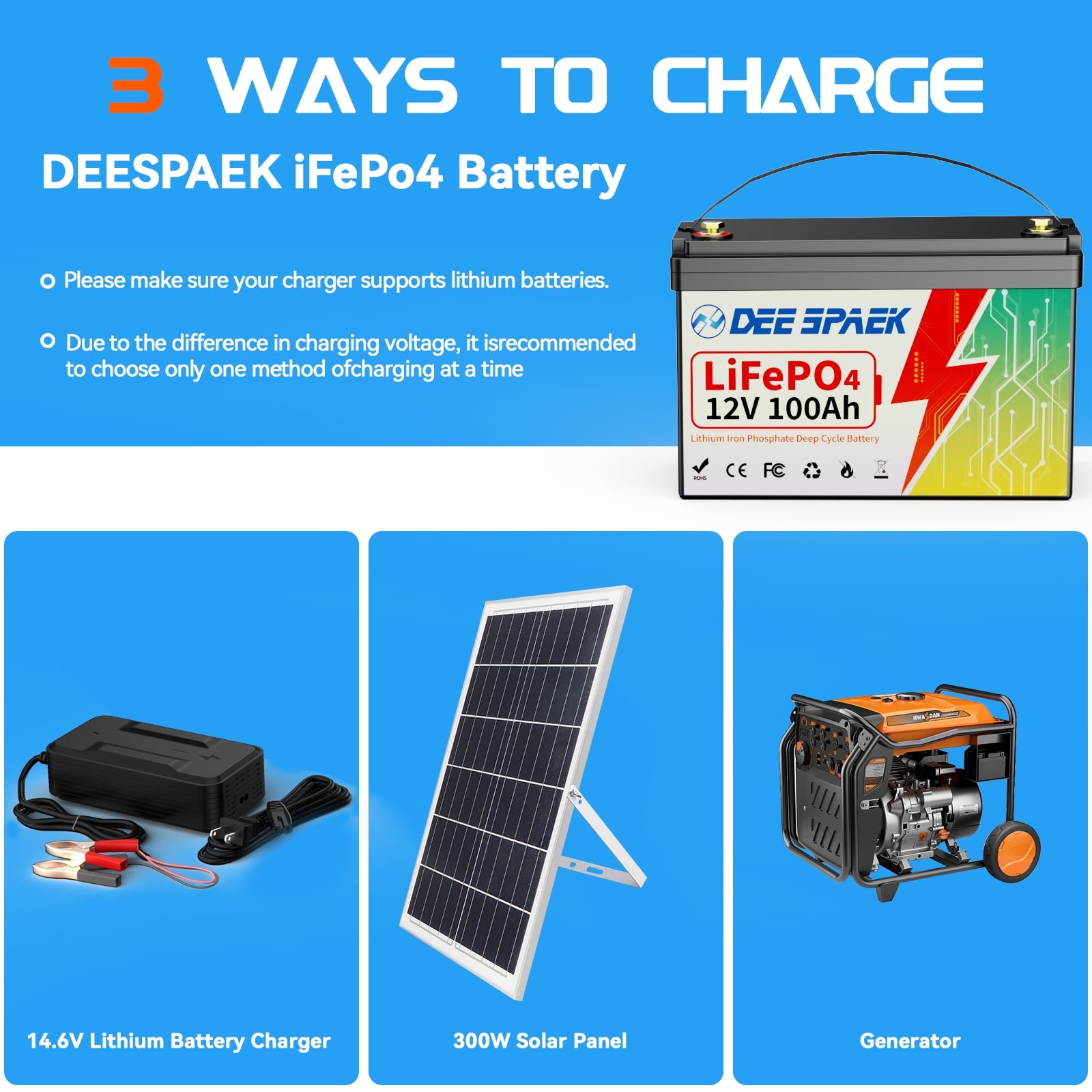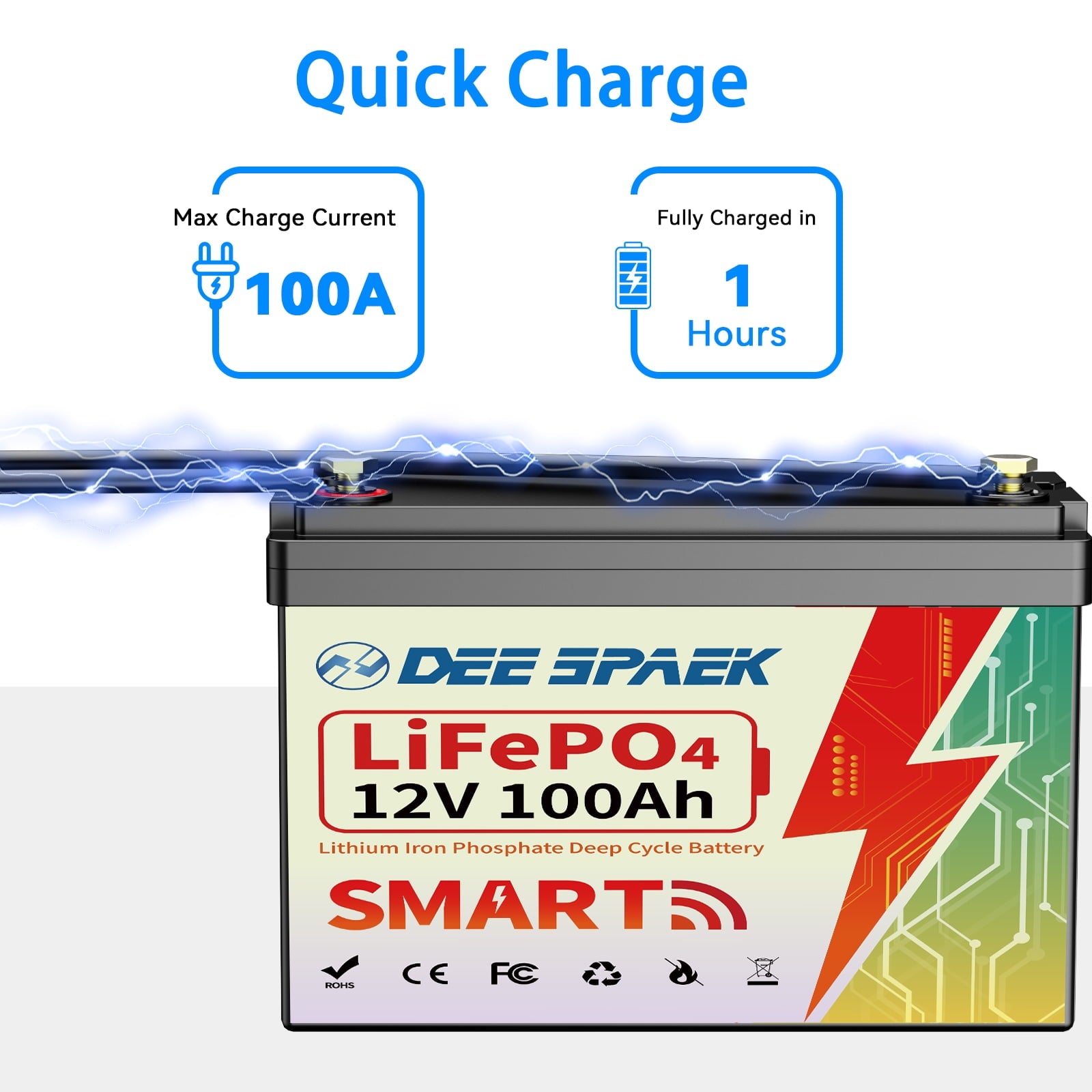 Brand: DEESPEAKCapacity: 100AhModel: 12V 100AhCycles Life: More than 8000 CyclesDimension: 13.07*6.93*8.66inWeight: 25LBSCharge Method: CC/CVDC Charge Voltage: 14.2V-14.6VDC Charge Current: 5A-100ANominal voltage: 12.8VBMS: 100AStandard charge voltage:14.4VMaximum protection voltage: 14.6VDischarge cut-off voltage: 10VRecommend Charge Current: 20AMax. charge current: 100AMax. Discharge current: 100APeak discharge current: 200ACharging Temperature:0℃~45℃Discharge temperature: -20°C to 60°C.Storage Temperature: -20°C to 45°C
