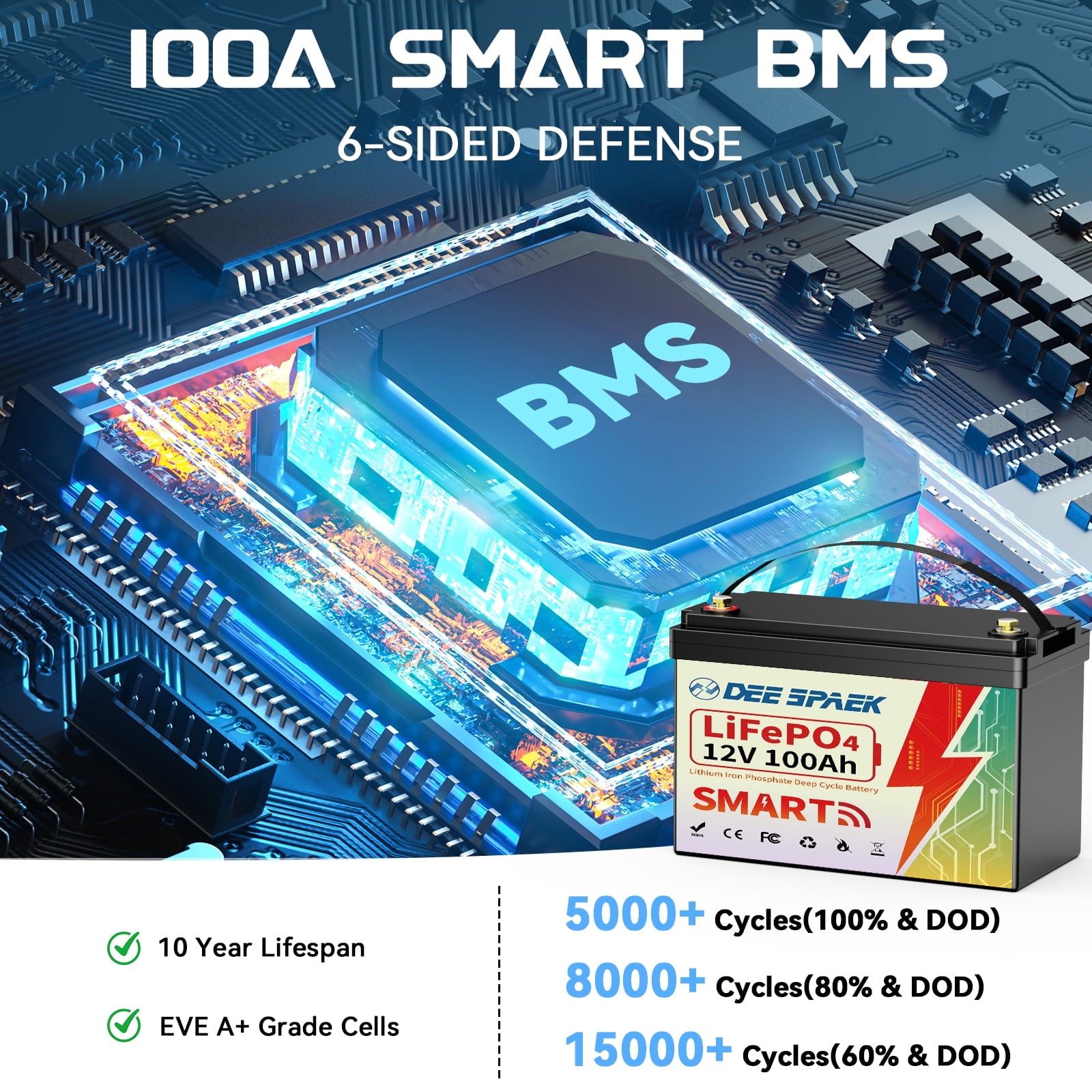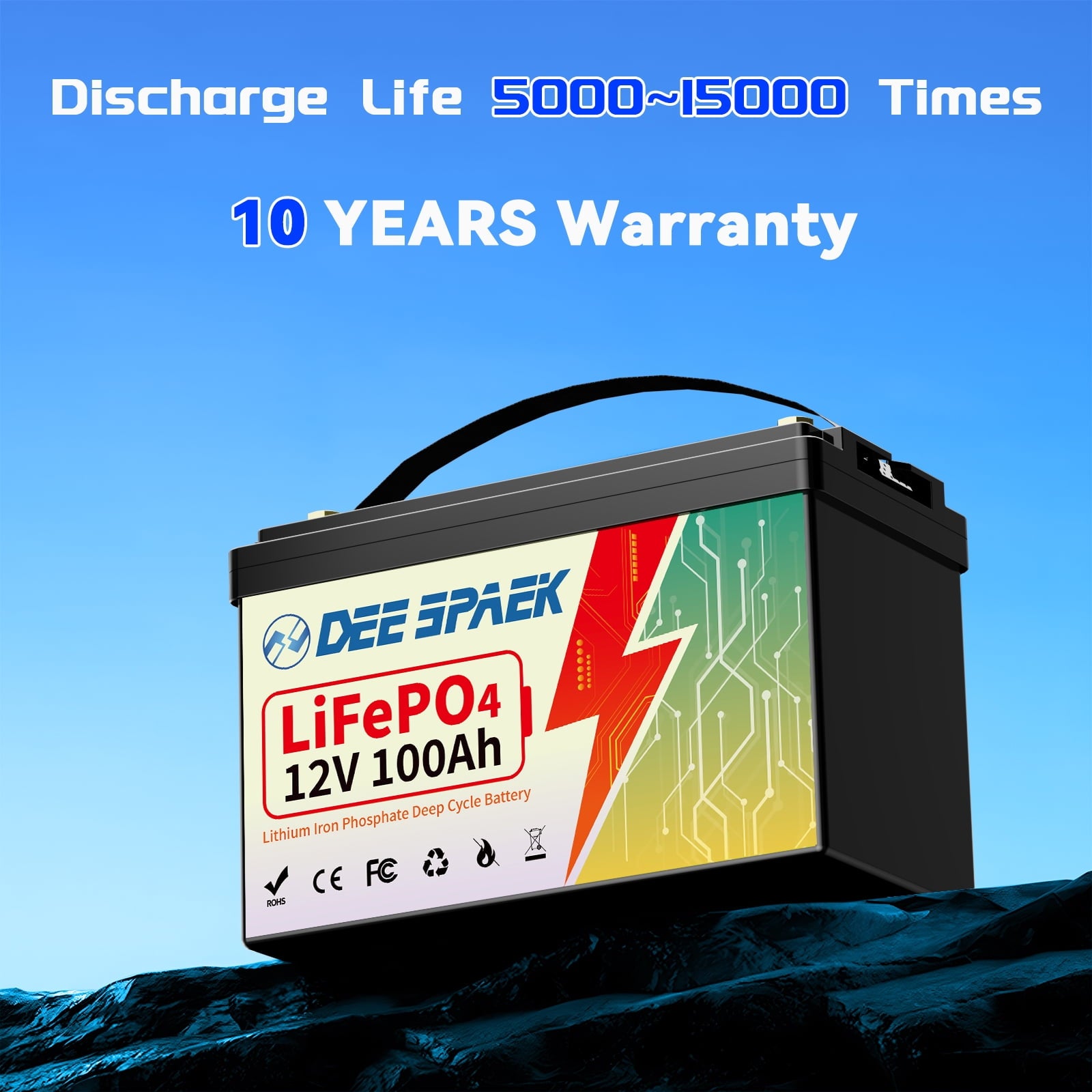 12.8V 100Ah LiFePO4 battery provides 5000~15000 cycles (10 times longer) 4000 Time Cycles at 100% DOD, 6000 Time Cycles at 80% DOD, 15000 Time Cycles at 60% DOD & a 10-year lifetime compared to 200~500 cycles & a 3-year lifetime in the lead acid battery.