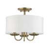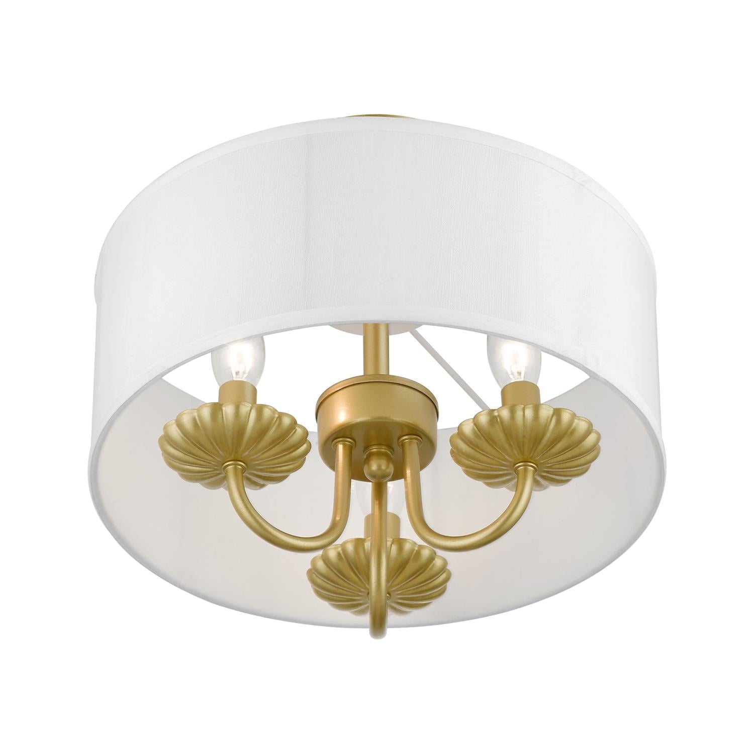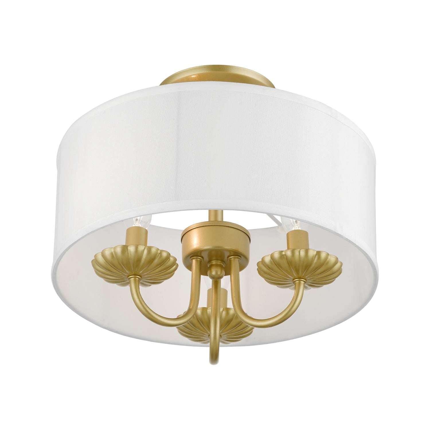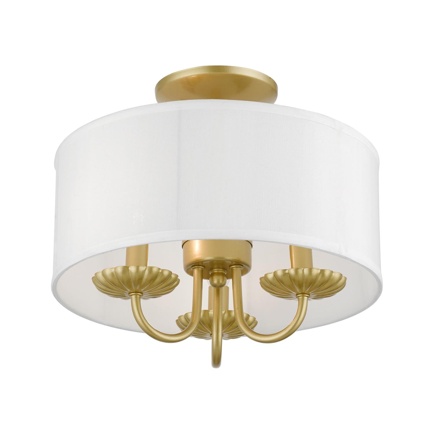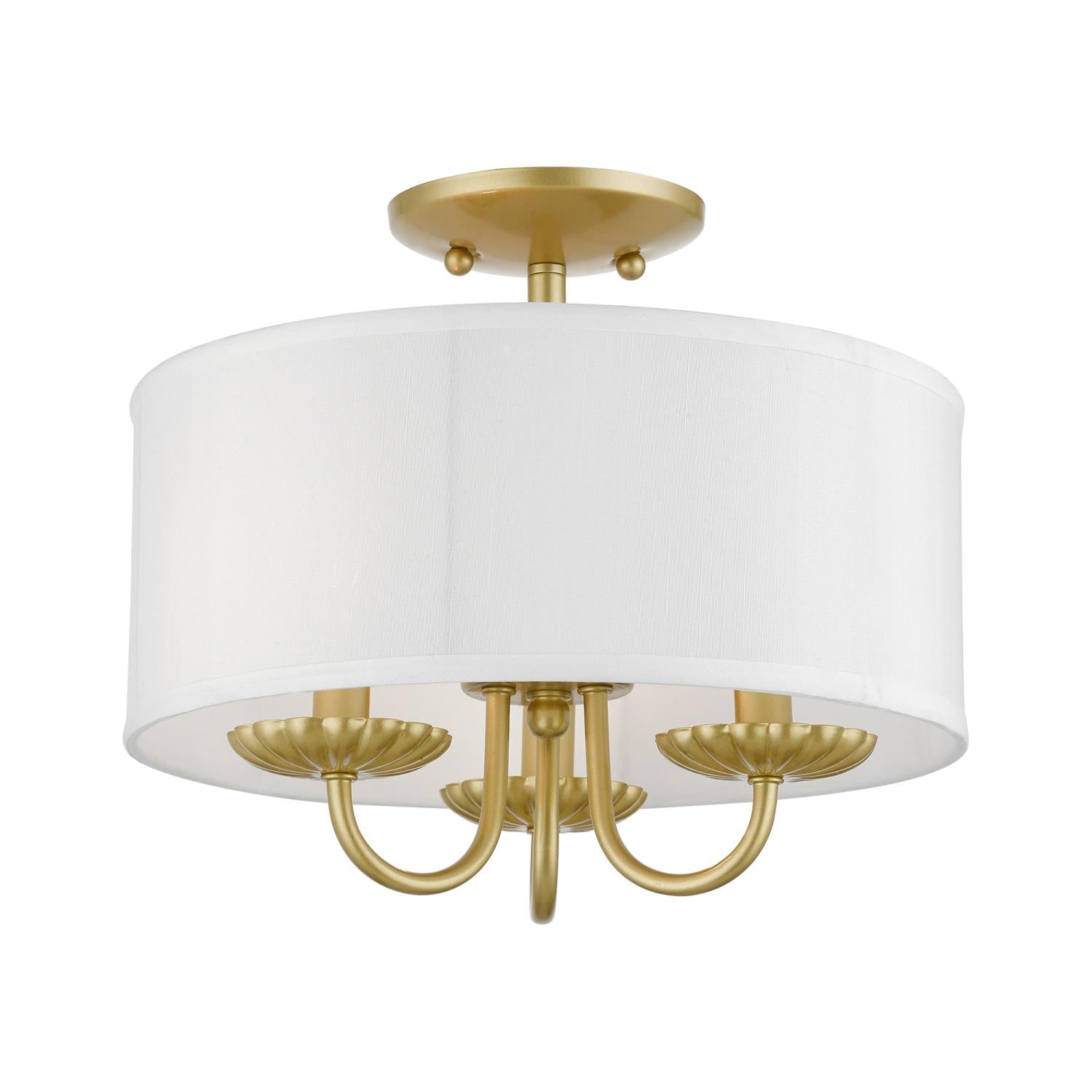 Livex Lighting-42987-33-Collection: Brookdale, Material: Steel, Finish Color: Soft Gold, Width: 13″, Height: 11″, Lamping Type: Incandescent, Number Of Bulbs: 3, Wattage: 40 Watts, Moisture Rating: Dry Rated, Desc: The three-light Brookdale semi-flush combines floral details and elements to create an updated look. The hand-crafted off-white fabric hardback drum shade is set off by an inner silky white fabric that combines with chandelier-like antique brass finish sweeping arms which creates a versatile effect. Perfect fit for the living room, dining room, kitchen or bedroom. Canopy Included: Yes / Canopy Diameter: 5.13 / Shade Included: Yes / Shade Dimensions: 13 x 5.5. ,-Brookdale – 3 Light Semi-Flush Mount In Transitional Style-11 Inches Tall and 13 Inches Wide-Soft Gold Finish