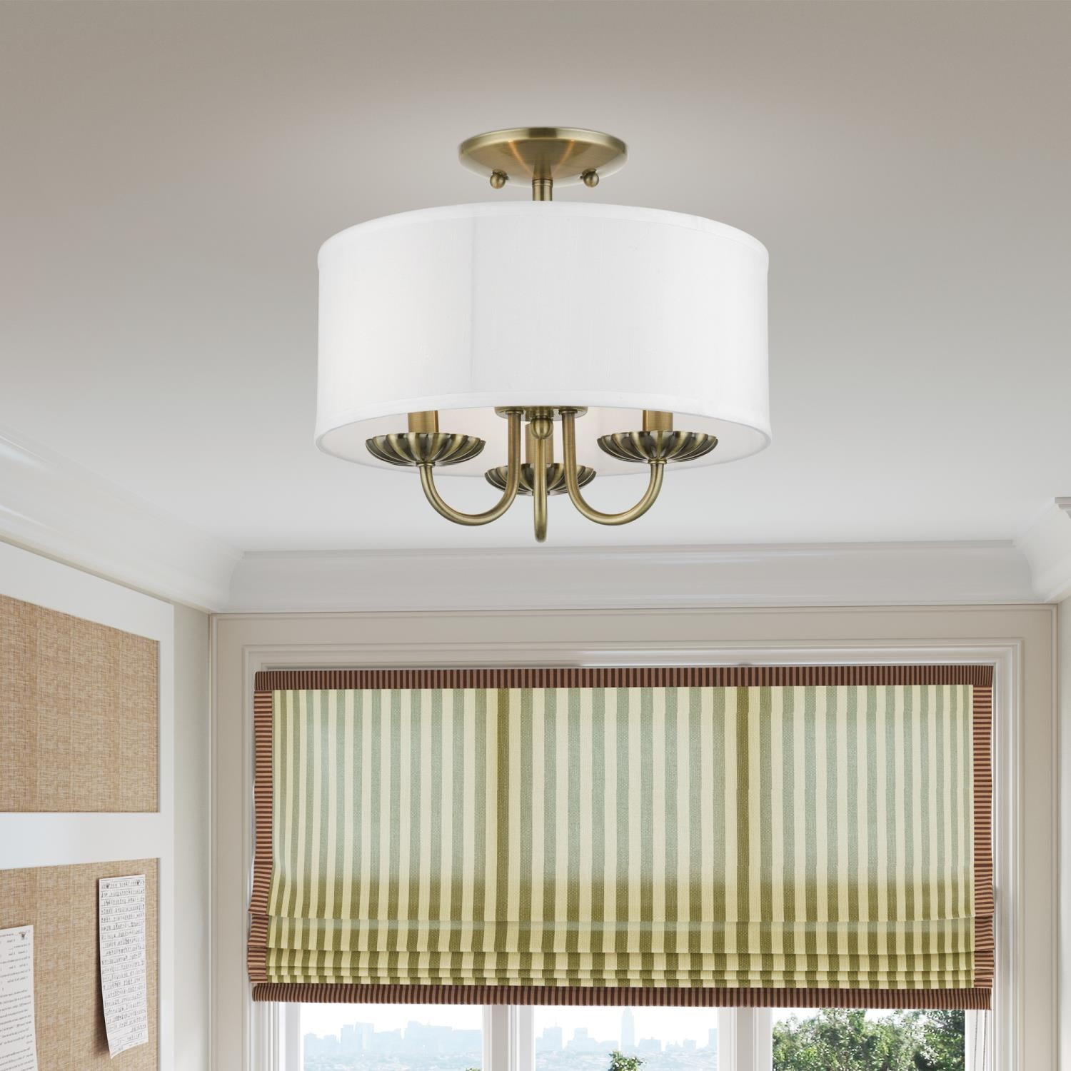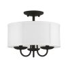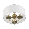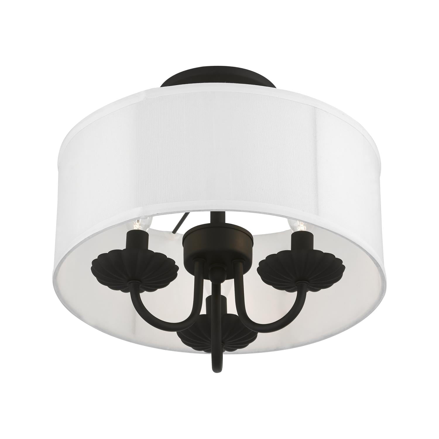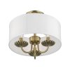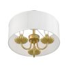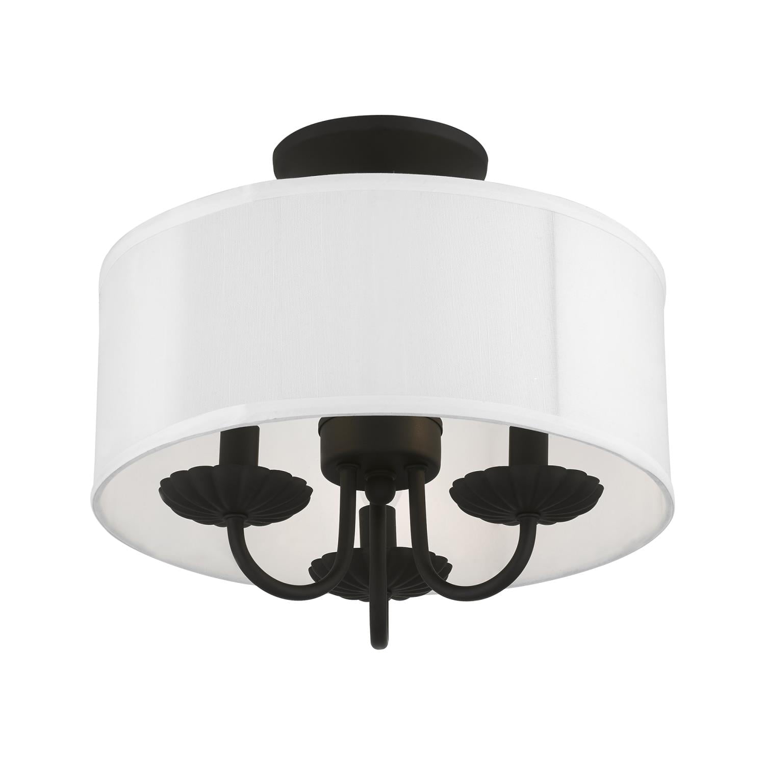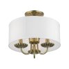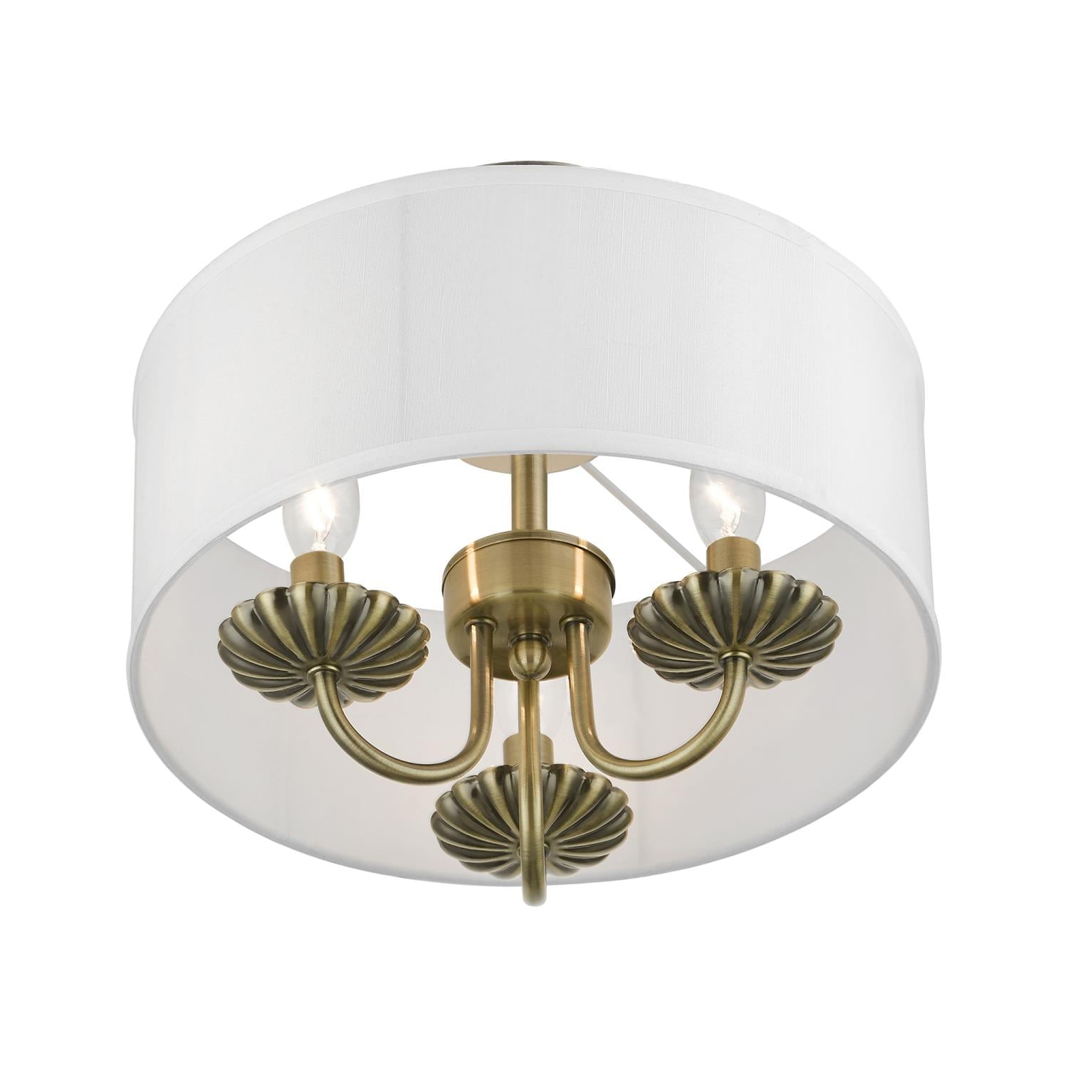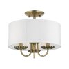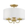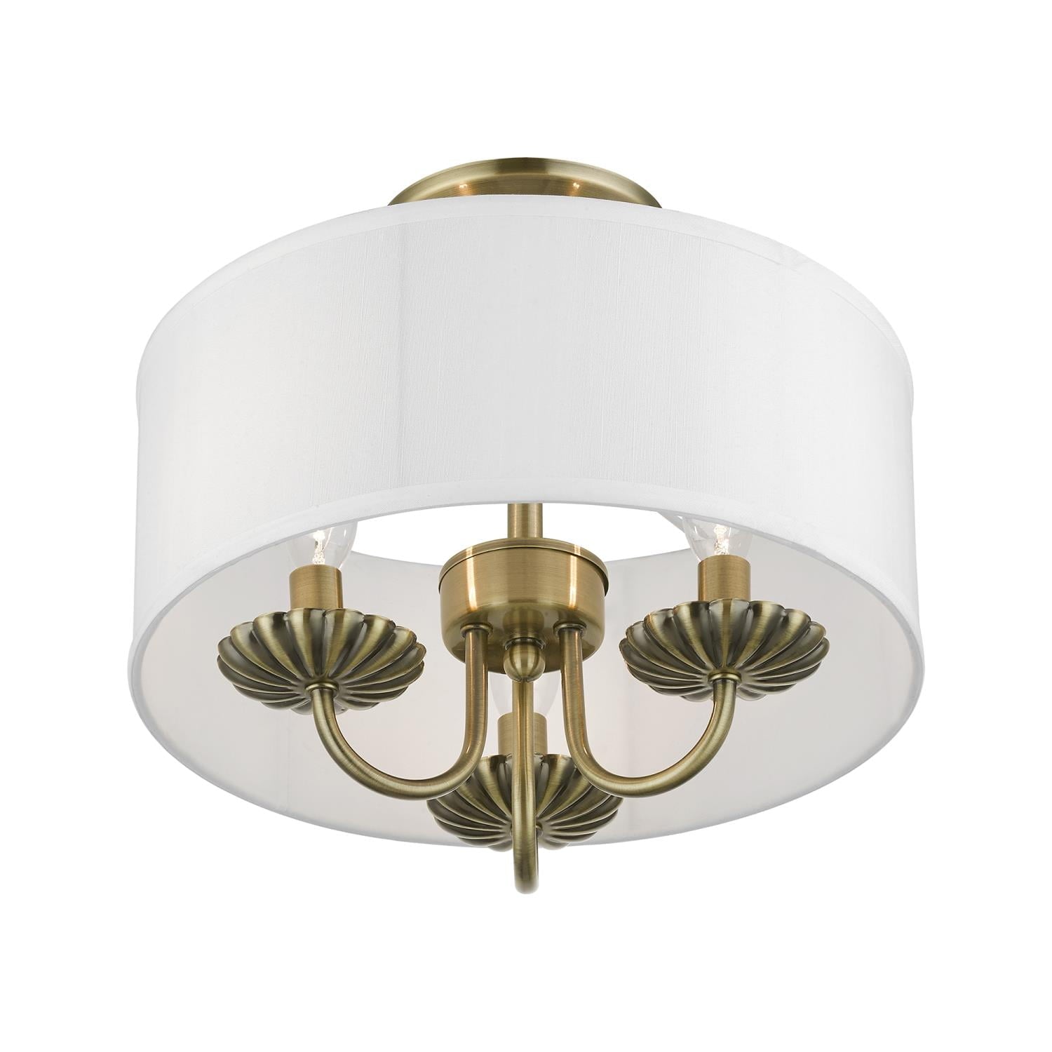 Livex Lighting-42987-33-Collection: Brookdale, Material: Steel, Finish Color: Soft Gold, Width: 13″, Height: 11″, Lamping Type: Incandescent, Number Of Bulbs: 3, Wattage: 40 Watts, Moisture Rating: Dry Rated, Desc: The three-light Brookdale semi-flush combines floral details and elements to create an updated look. The hand-crafted off-white fabric hardback drum shade is set off by an inner silky white fabric that combines with chandelier-like antique brass finish sweeping arms which creates a versatile effect. Perfect fit for the living room, dining room, kitchen or bedroom. Canopy Included: Yes / Canopy Diameter: 5.13 / Shade Included: Yes / Shade Dimensions: 13 x 5.5. ,-Brookdale – 3 Light Semi-Flush Mount In Transitional Style-11 Inches Tall and 13 Inches Wide-Soft Gold Finish