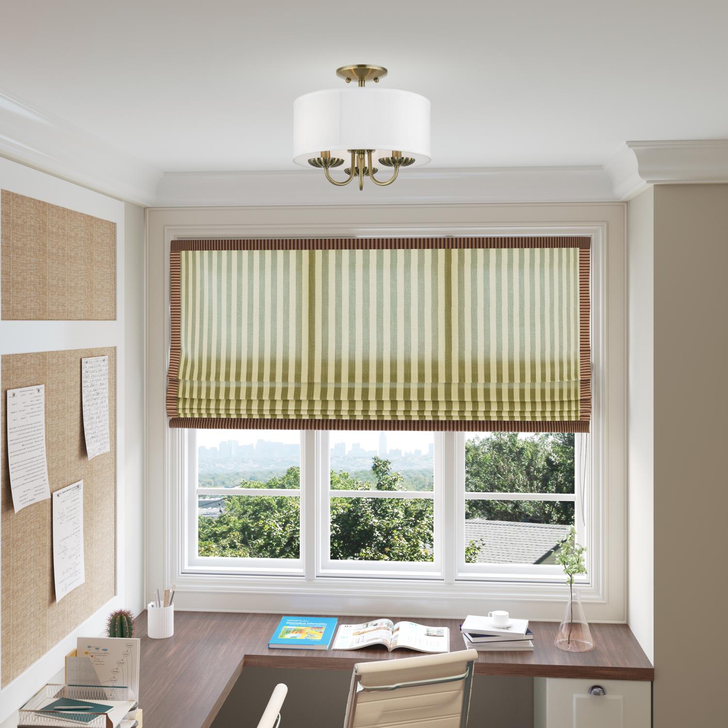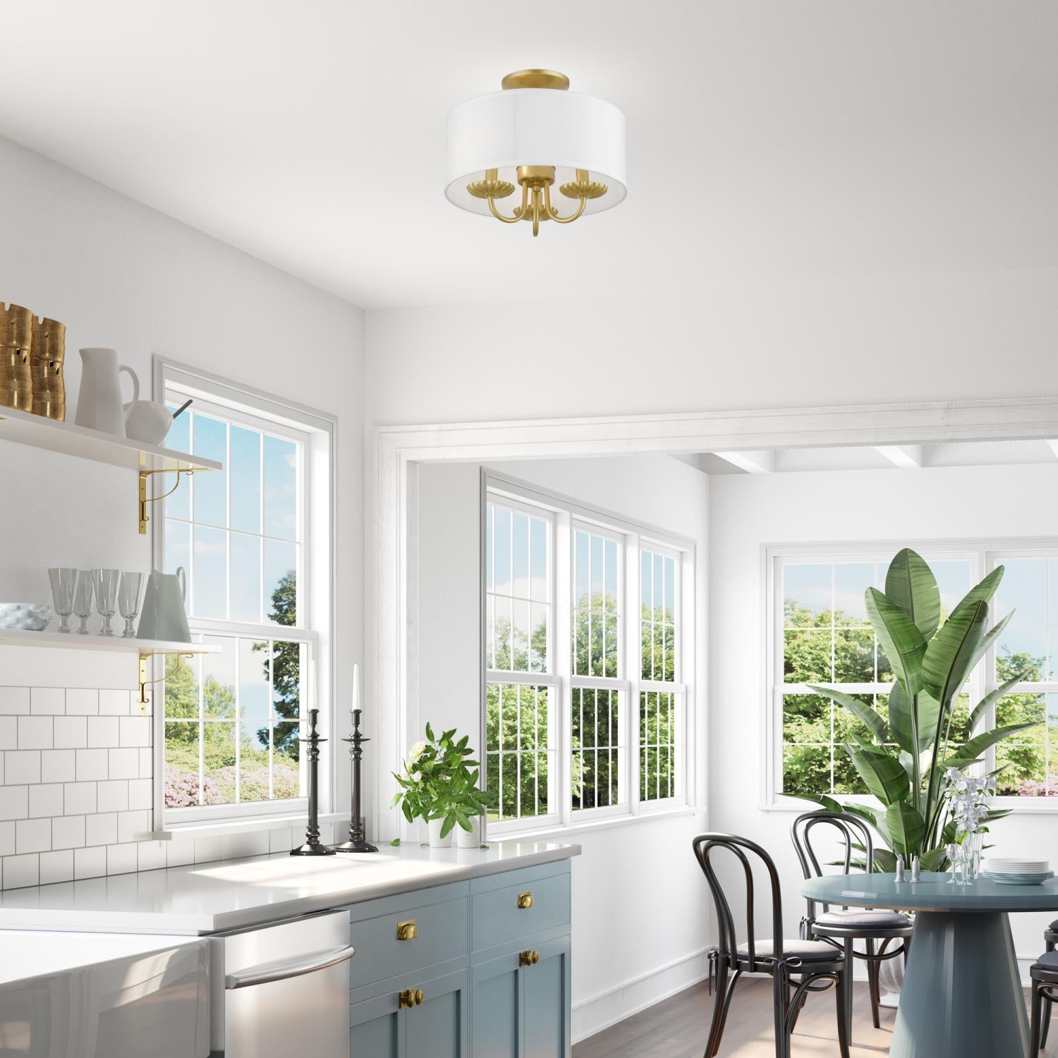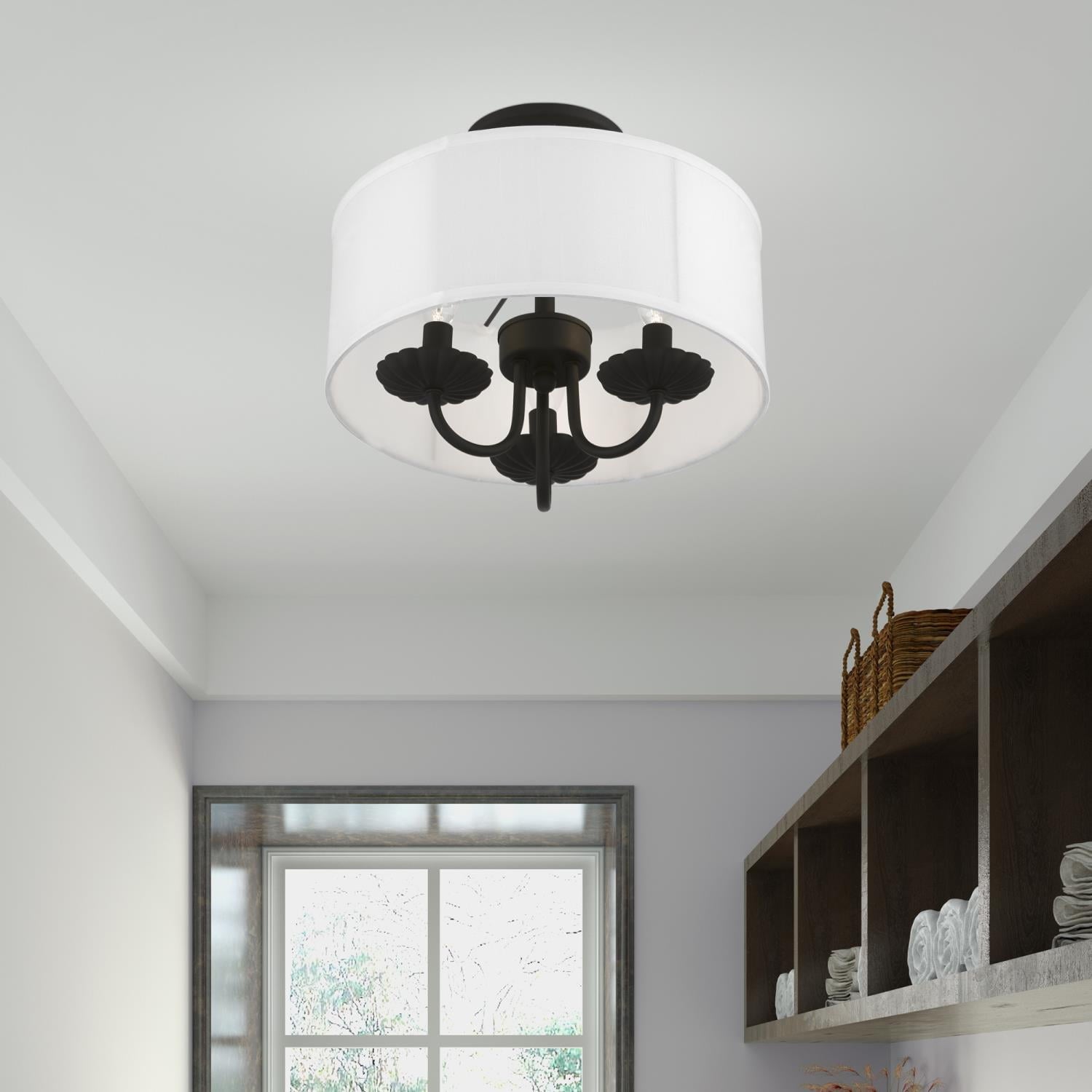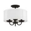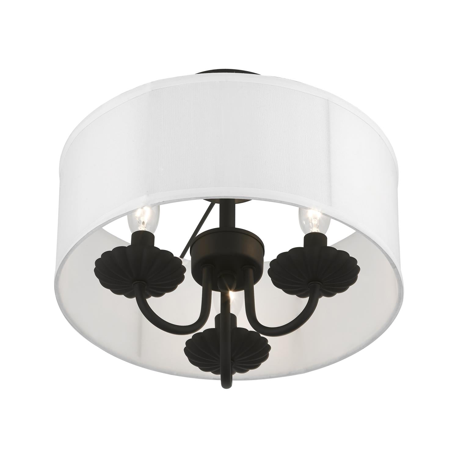 Livex Lighting-42987-33-Collection: Brookdale, Material: Steel, Finish Color: Soft Gold, Width: 13″, Height: 11″, Lamping Type: Incandescent, Number Of Bulbs: 3, Wattage: 40 Watts, Moisture Rating: Dry Rated, Desc: The three-light Brookdale semi-flush combines floral details and elements to create an updated look. The hand-crafted off-white fabric hardback drum shade is set off by an inner silky white fabric that combines with chandelier-like antique brass finish sweeping arms which creates a versatile effect. Perfect fit for the living room, dining room, kitchen or bedroom. Canopy Included: Yes / Canopy Diameter: 5.13 / Shade Included: Yes / Shade Dimensions: 13 x 5.5. ,-Brookdale – 3 Light Semi-Flush Mount In Transitional Style-11 Inches Tall and 13 Inches Wide-Soft Gold Finish
