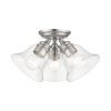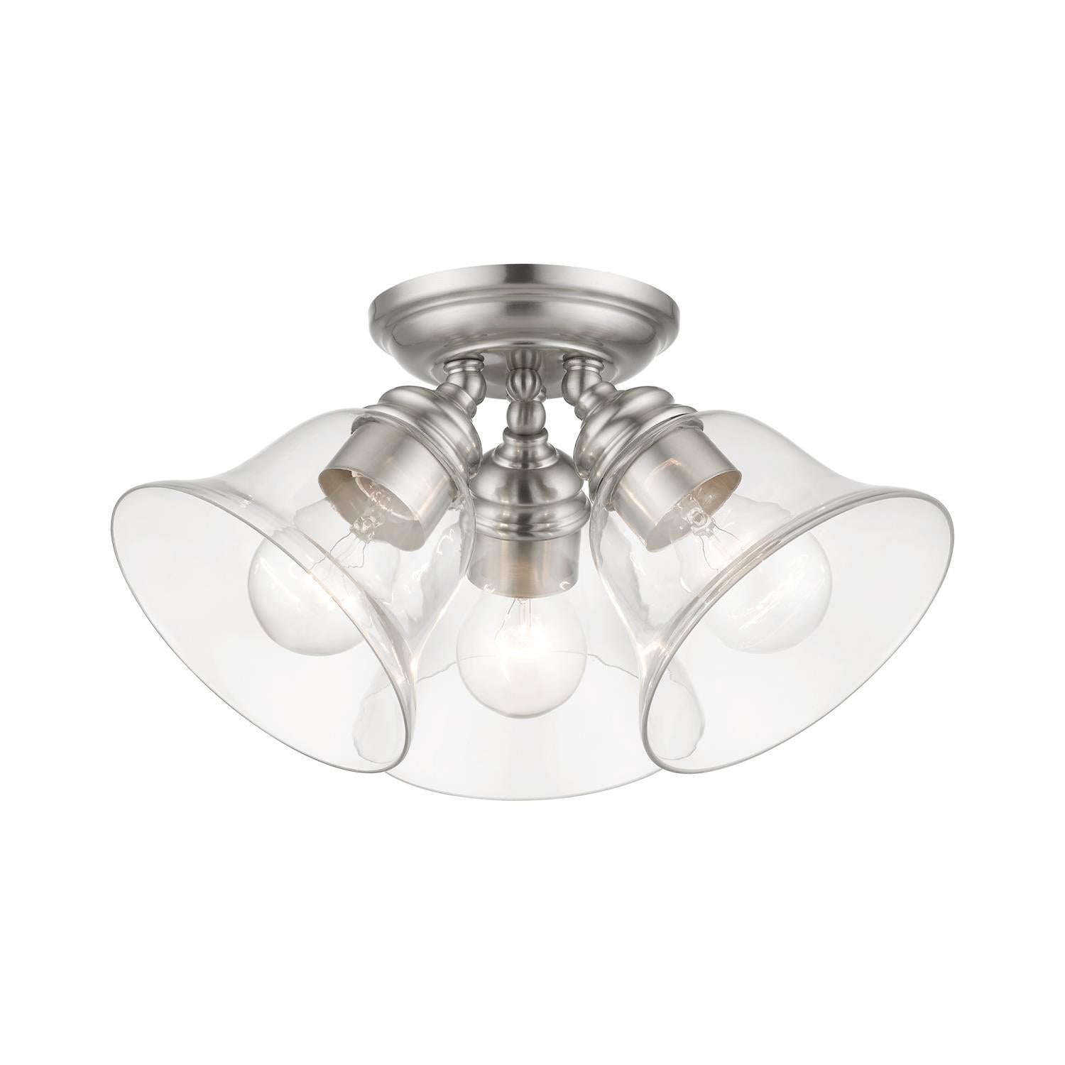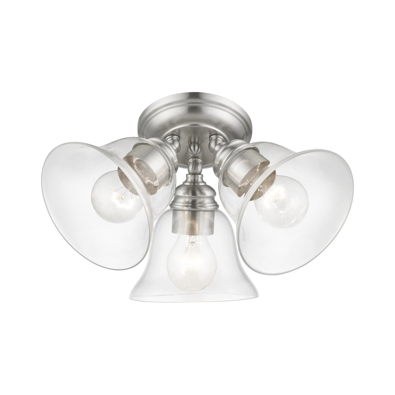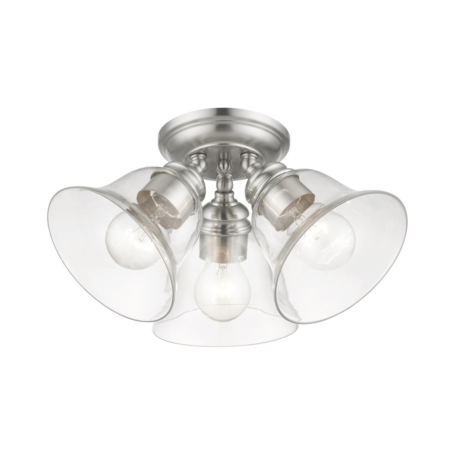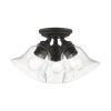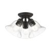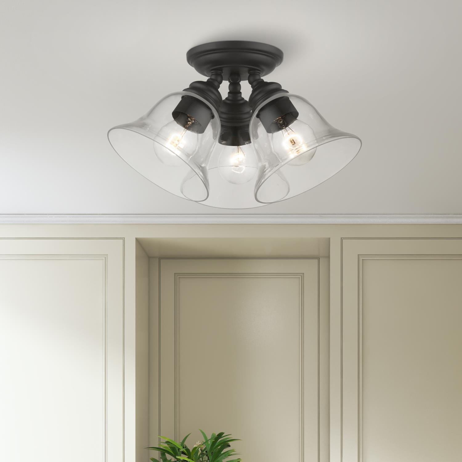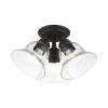 Livex Lighting-46489-04-Collection: Moreland, Material: Steel, Finish Color: Black, Width: 14.5″, Height: 7.5″, Lamping Type: Incandescent, Number Of Bulbs: 3, Wattage: 40 Watts, Moisture Rating: Dry Rated, Desc: Whether it’s style or practical lighting, this flush mount is the perfect addition to your bathroom, kitchen, hallway or bedroom. This three-light fixture from the Moreland Collection features clear hand-blown glass shades and is shown in a black finish. The clean graceful lines of the canopy complement the shades, creating an understated look that works well in most decors. Classic elegance combines with contemporary appeal to enhance any home in style.,-Moreland – 3 Light Large Semi-Flush Mount In Transitional Style-7.5 Inches Tall and 14.5 Inches Wide-Black Finish