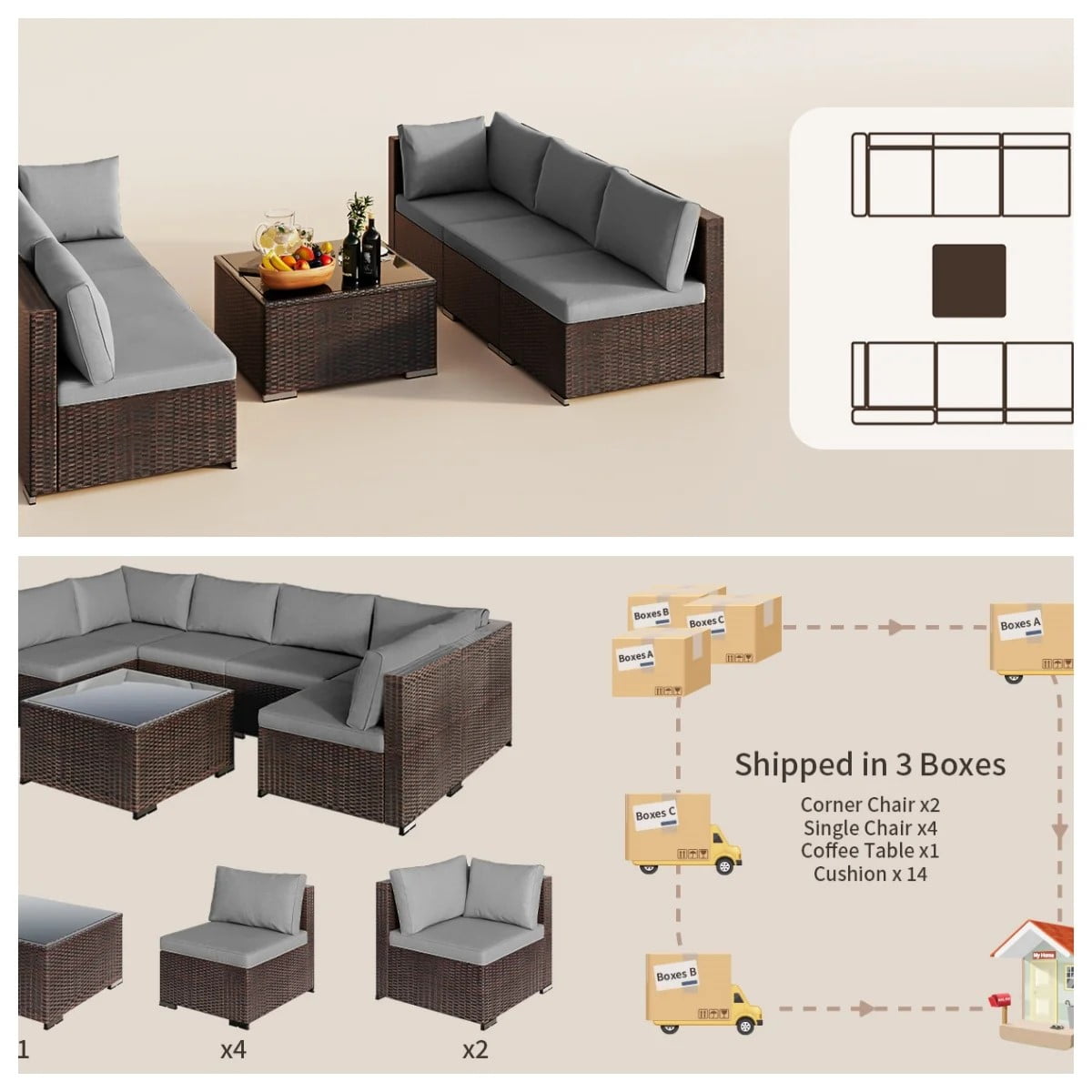 Includes pre-labeled parts and illustrated instructions for hassle-free setup. Ships in 3 well-packed boxes with all hardware included—no special tools required.Ideal for patios, balconies, poolside, or gardens, this patio furniture combines all-weather resilience with customizable comfort. -