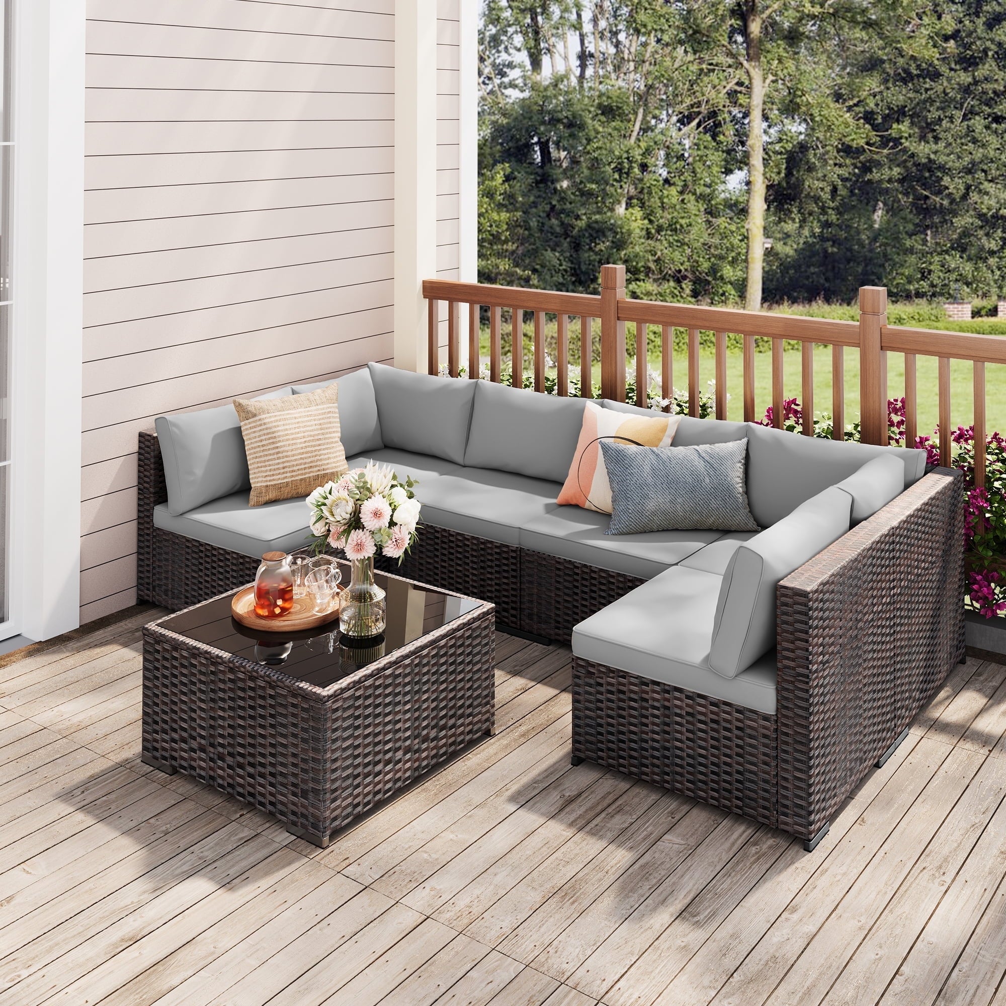 Gray cushions are upholstered in waterproof, fade-resistant fabric and are removable for machine washing. The tempered glass tabletop wipes clean effortlessly, while the rattan requires minimal maintenance.